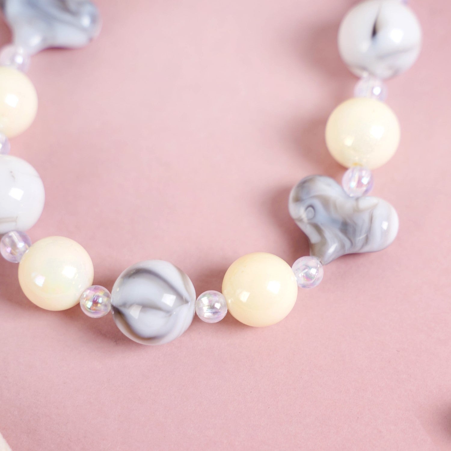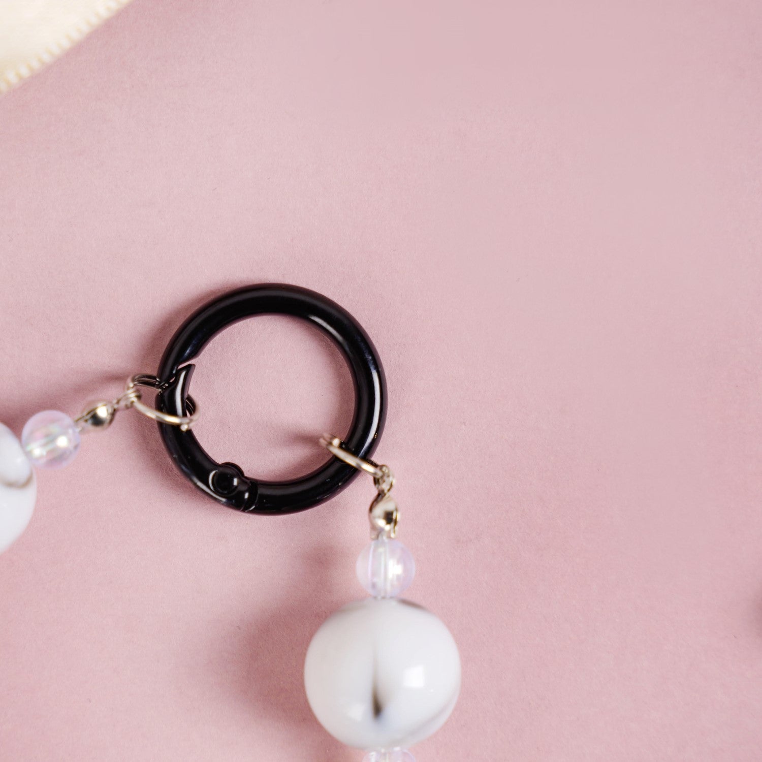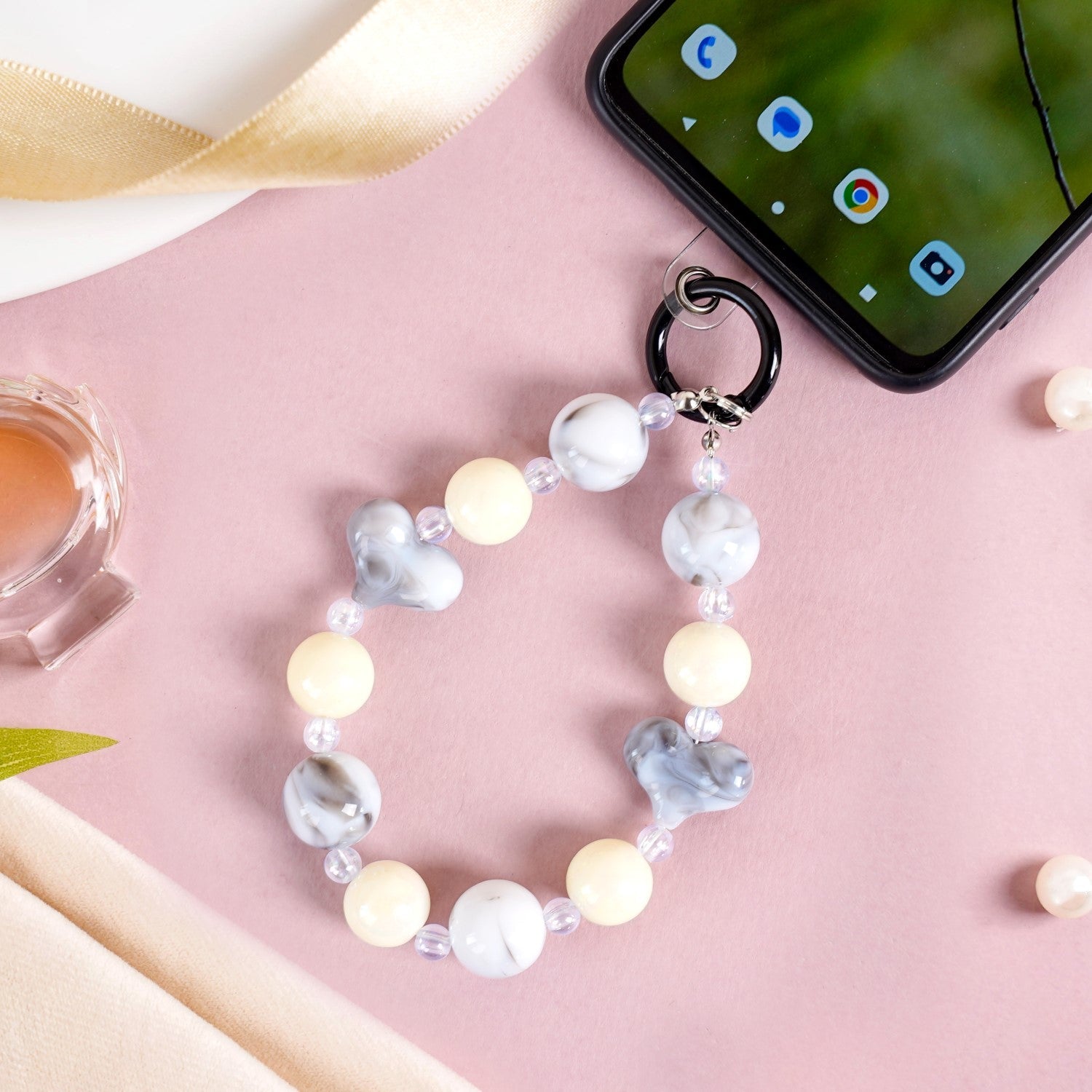Add a touch of elegance to your accessories with this stunning keychain. Featuring a black metal lobster clasp hook at the top, the keychain is adorned with a sequence of beads in transparent, grey, and off-white hues combined with small grey hearts. The transparent beads exude an iridescent glow, adding a subtle sparkle, while the grey round and heart-shaped beads have a beautiful marbled appearance.