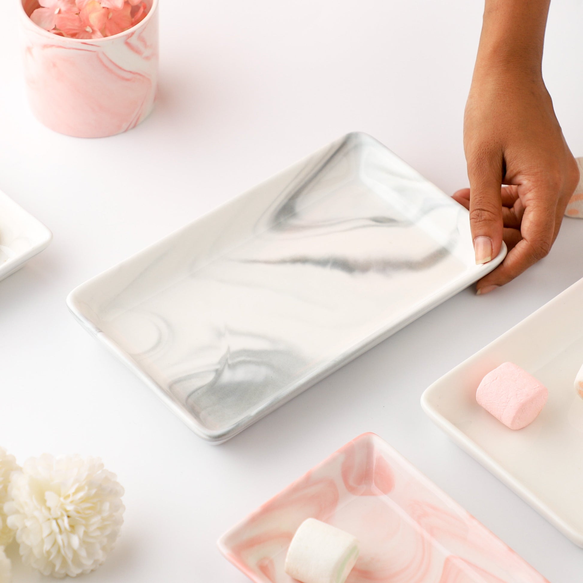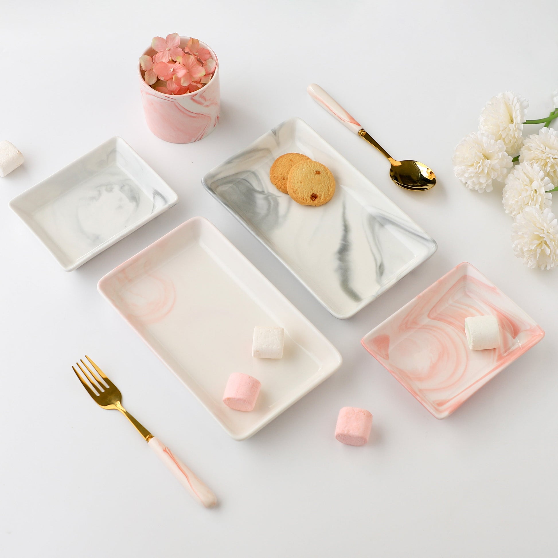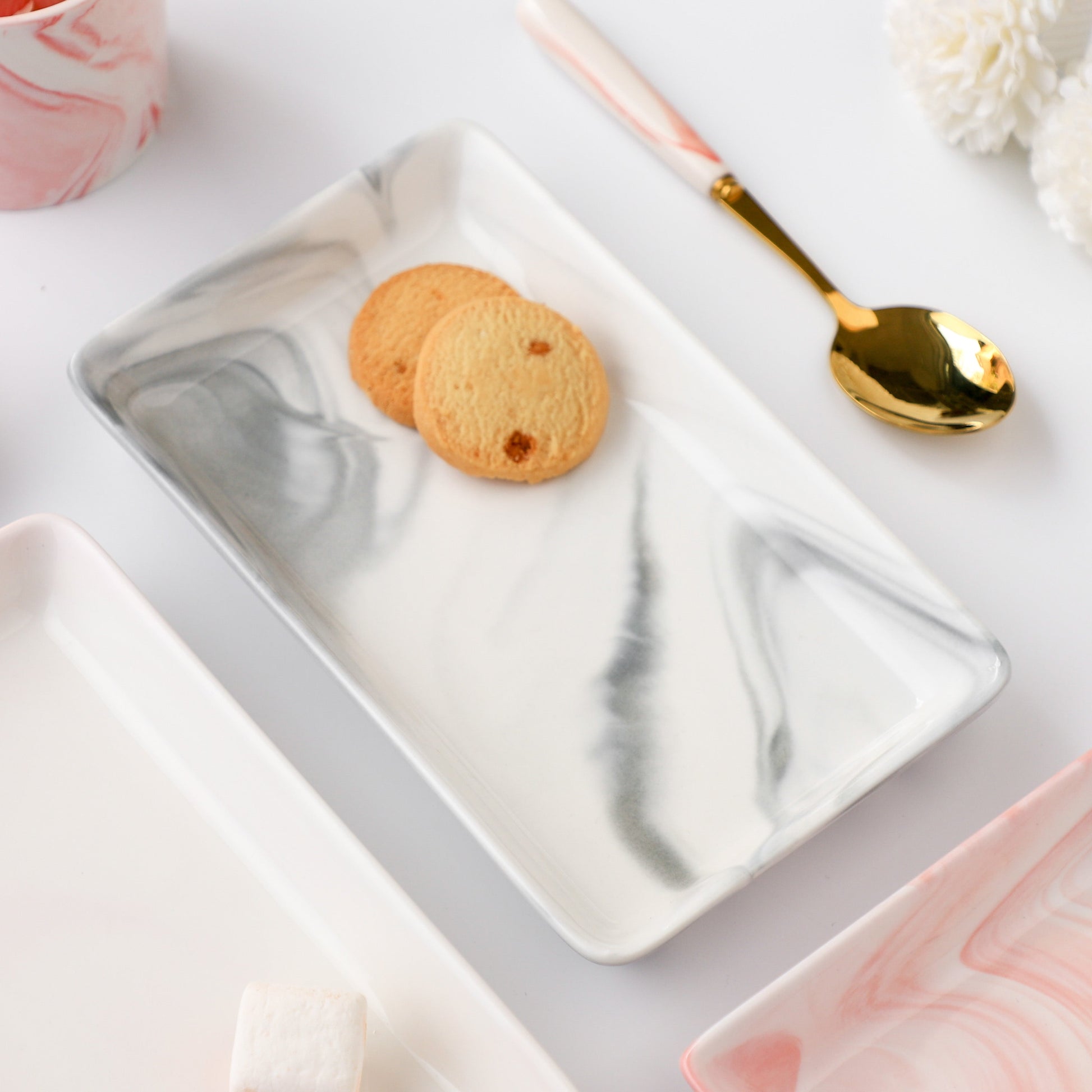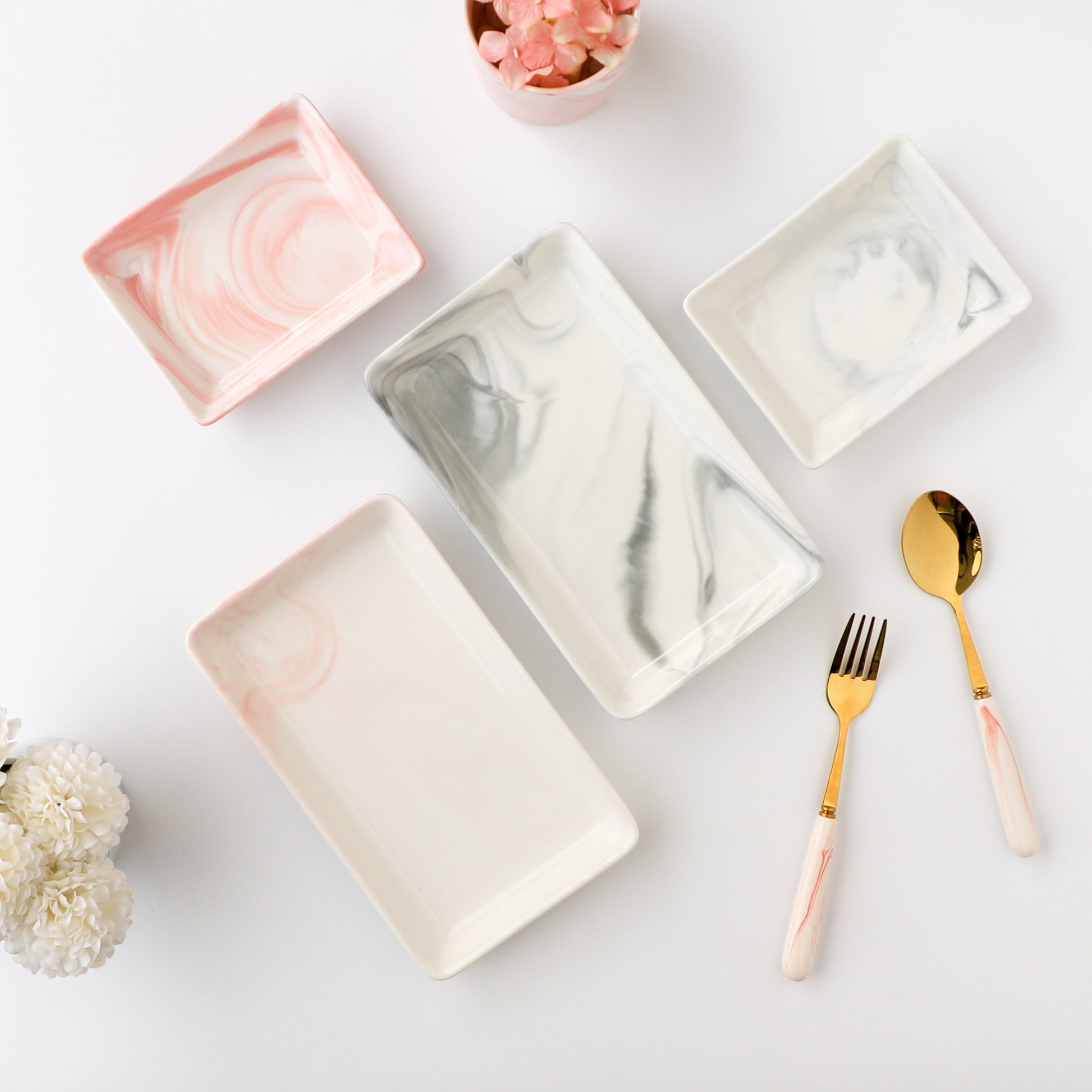 The long plate is designed to provide a modern and sophisticated touch to your dining experience. Crafted from high-quality ceramic, the rectangular ceramic plate is both durable and sturdy, ensuring it will withstand everyday use. The raised edges help to keep your food in place, while the sleek rectangular shape adds a touch of elegance to your table setting. The beautiful grey and white marble pattern offers a versatile look that will complement a wide range of tableware and decor.