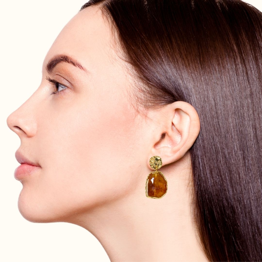 A stunning visual of regal vintage beauty, these dangle earrings are designed to captivate with their timeless elegance. Inspired by the graceful curves and fluid forms of marble sculptures, the design pays homage to classical artistry. The textured gold circle and jagged edges of the frame perfectly complement the amber-toned stone, whose rich hue adds a touch of warmth and depth. With their striking balance of bold structure and refined beauty, these earrings are the epitome of elegance.
