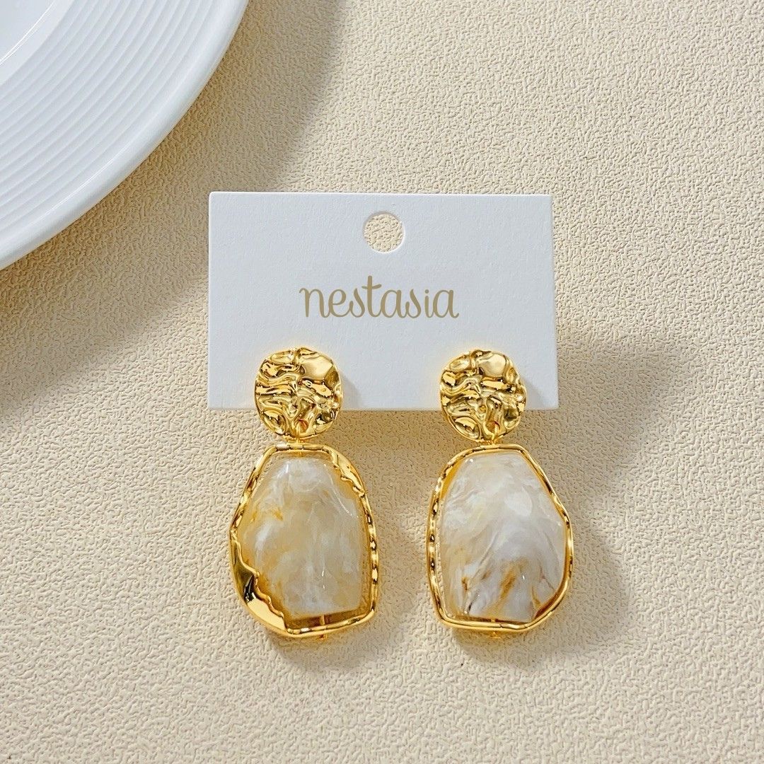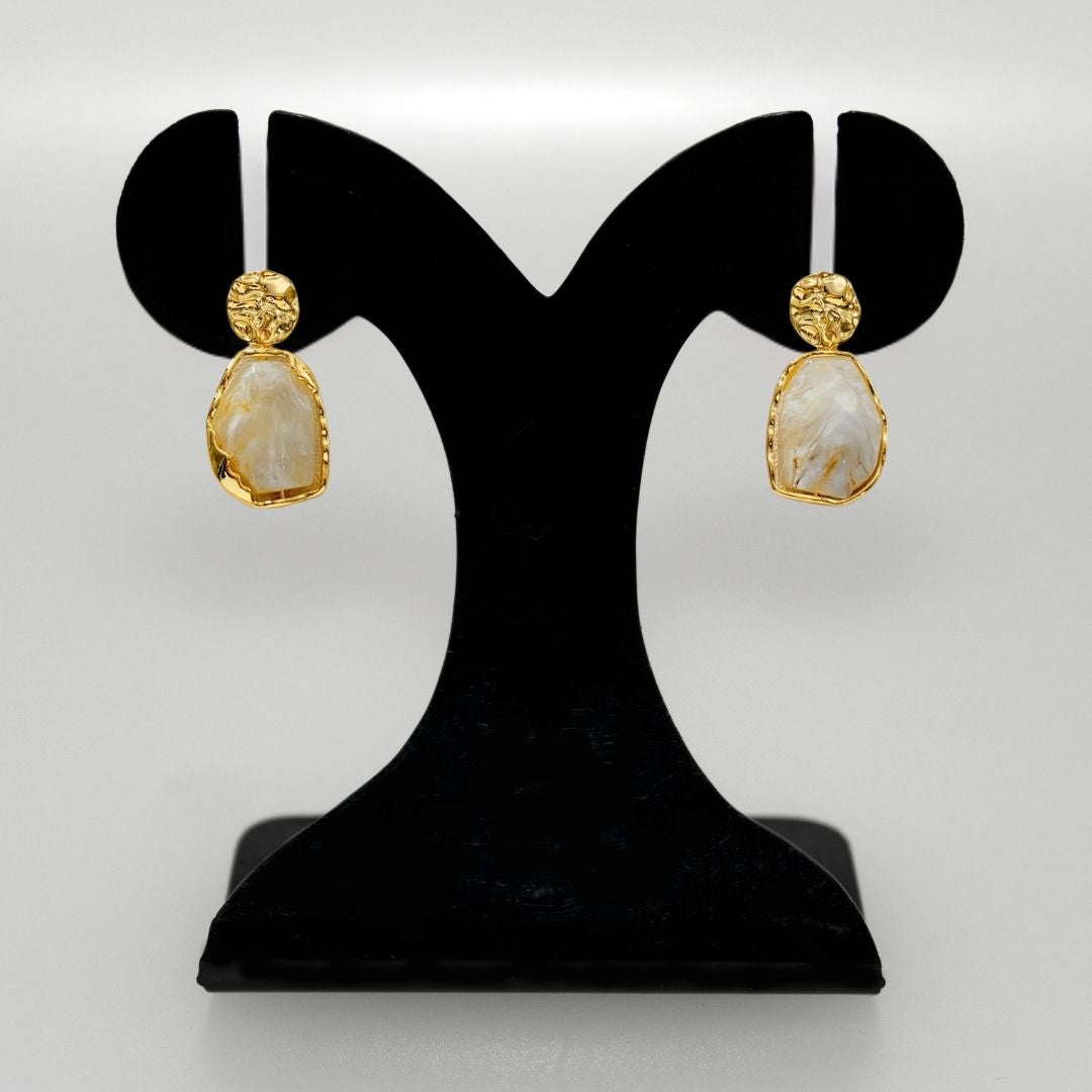A perfect balance of power and grace, these dangle earrings capture the essence of timeless elegance. Drawing inspiration from the fluid lines and curves of marble sculptures, the design reflects the artistry and grace of classical beauty. From the textured gold circle and jagged edges of the frame to the marbled veins that highlight the delicate flow of refined artistry, every detail showcases sophisticated craftsmanship. These earrings effortlessly blend strength and elegance, making them a striking addition to any collection.