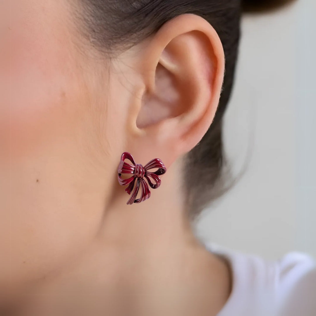 Make a statement with the maroon bow-tie earrings. The deep maroon hue exudes elegance, while the playful bow tie design brings a hint of whimsy. Perfectly balanced with a sleek metallic finish, these earrings are lightweight and versatile, transitioning effortlessly from day to night.