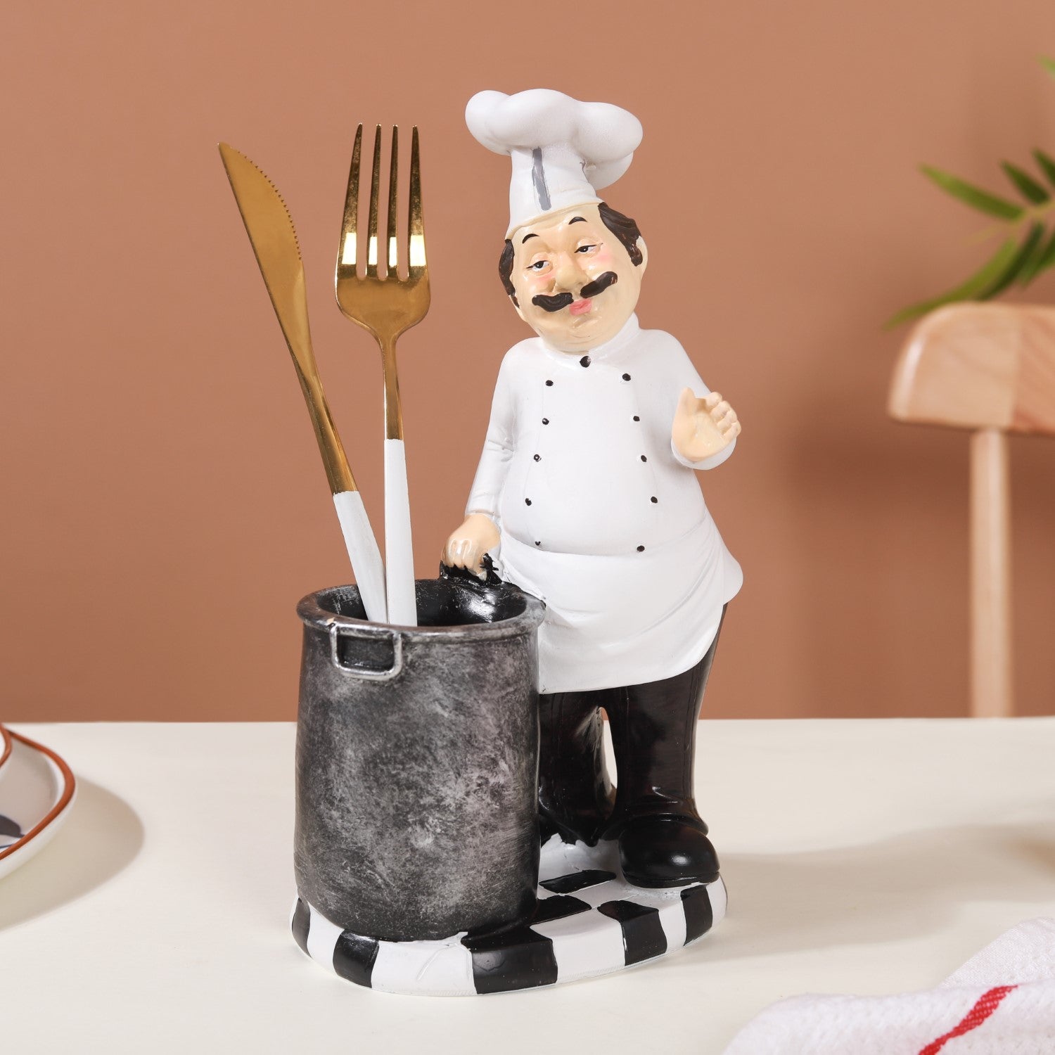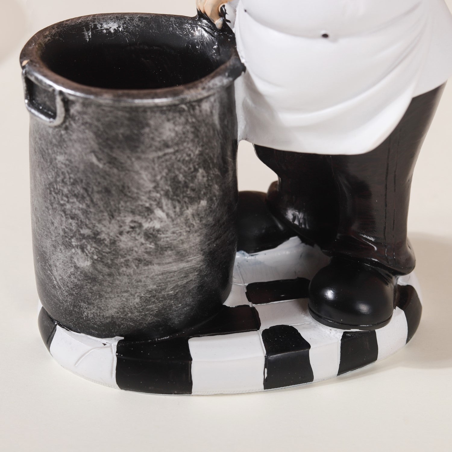 The charming chef showpiece holds a welcoming expression and can be displayed anywhere on the dining table, center table, or kitchen counter, and it also makes a unique gift for a cooking enthusiast who also supports and promotes cleanliness. The chef showpiece with a hat and apron is holding a barrel in one hand and has the perfect patient expression on his face, much like what good cooking demands.
