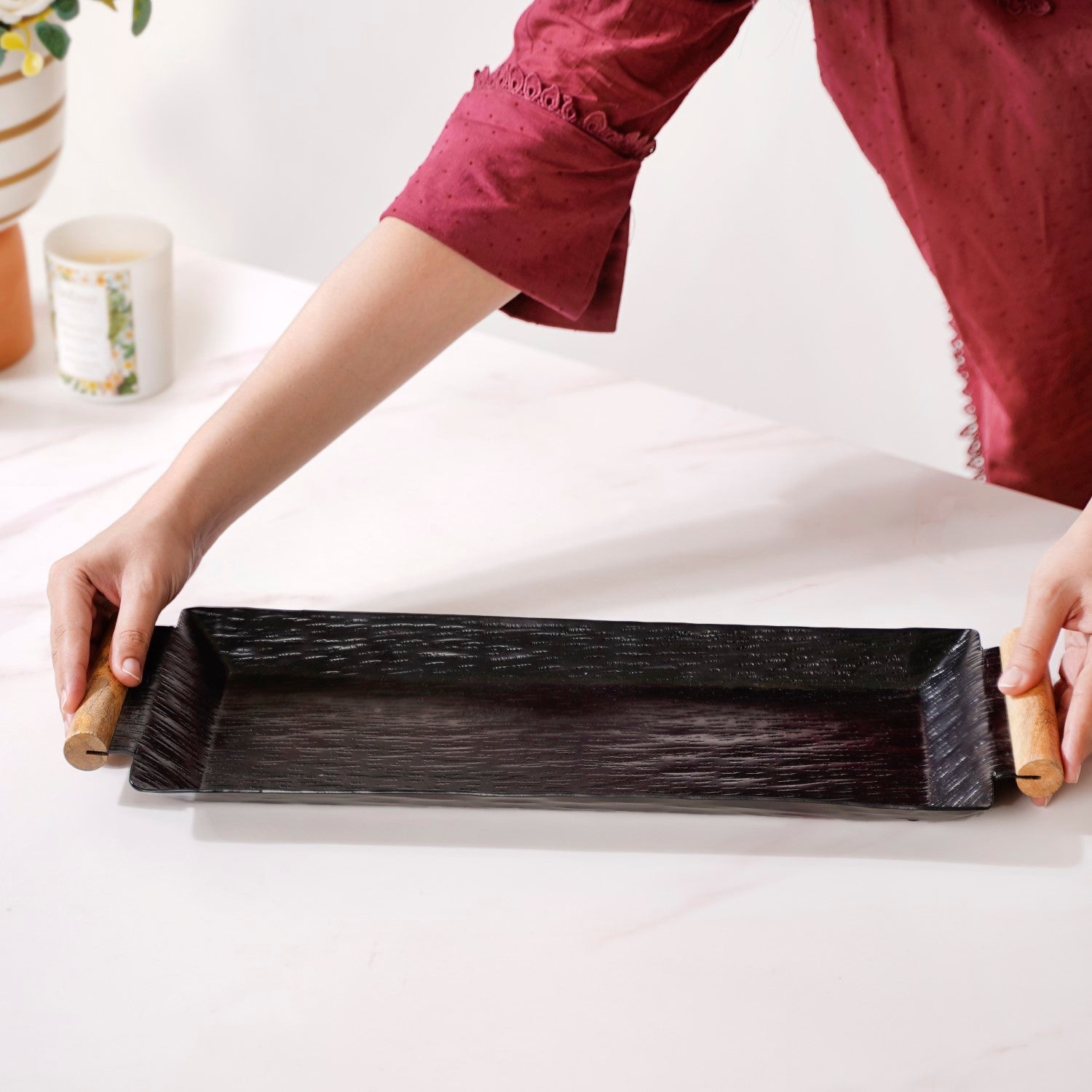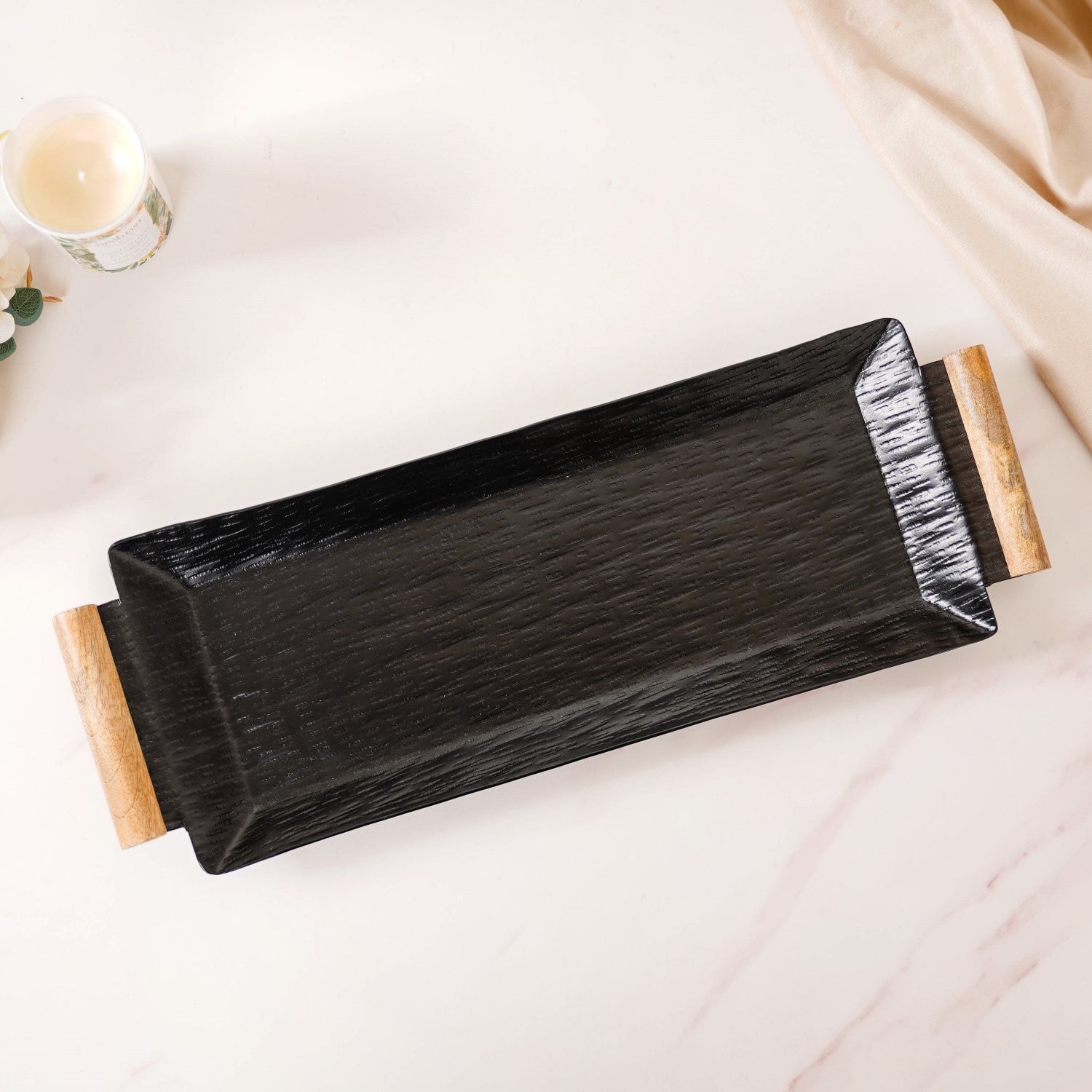 The sleek rectangular metal tray effortlessly blends style and functionality. Designed from rust-resistant aluminium, its durable construction ensures longevity. The matte black finish exudes elegance, complemented by the unique meltdown glass texture pattern, adding a touch of sophistication to your decor. Equipped with easy-grip wooden handles for convenient transportation, and furniture pads for surface protection, it's both practical and chic. Whether serving appetisers or organising essentials, this decorative tray elevates any occasion. Embrace versatility and durability with our metal tray, an essential addition to your home decor collection.