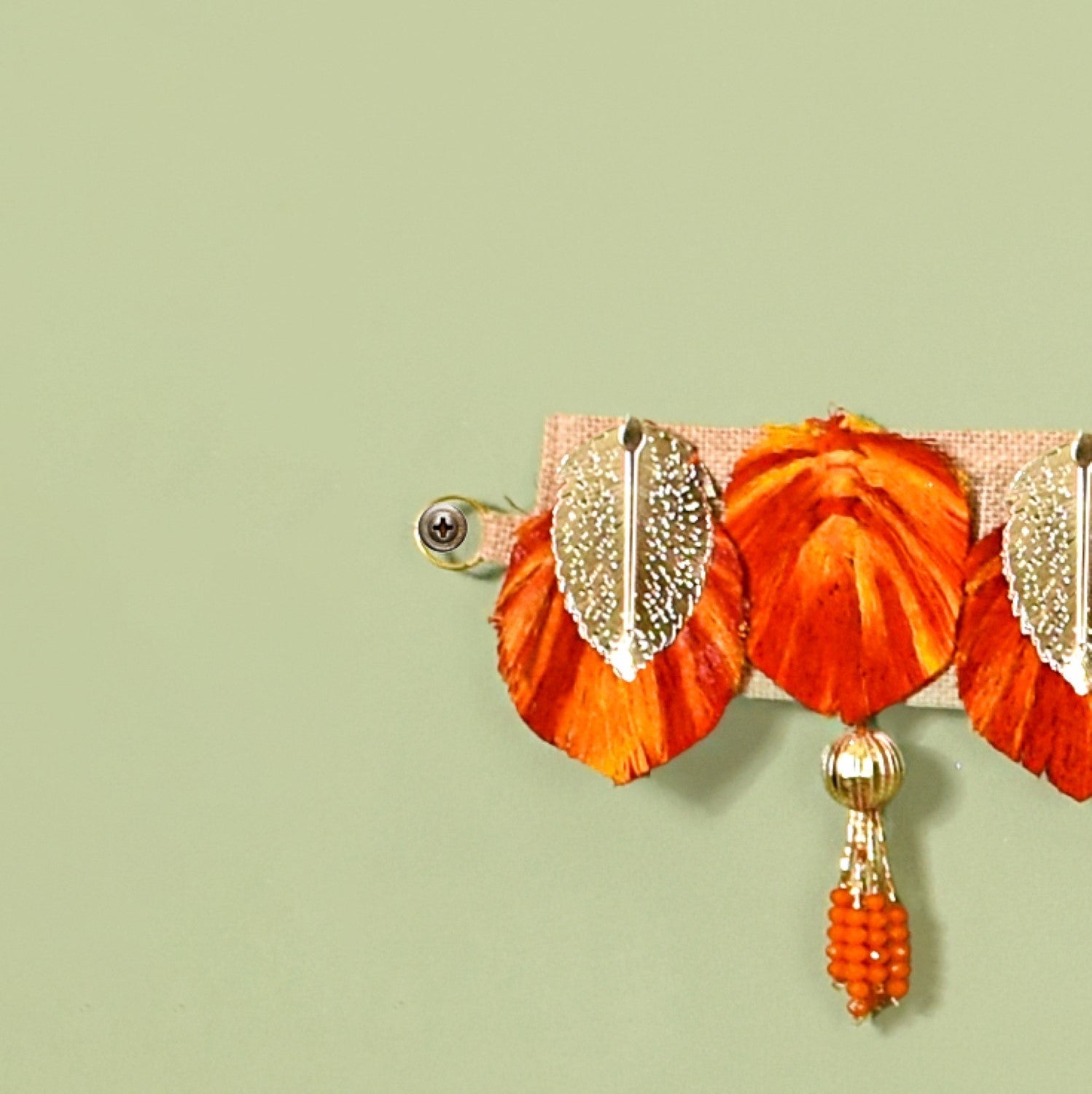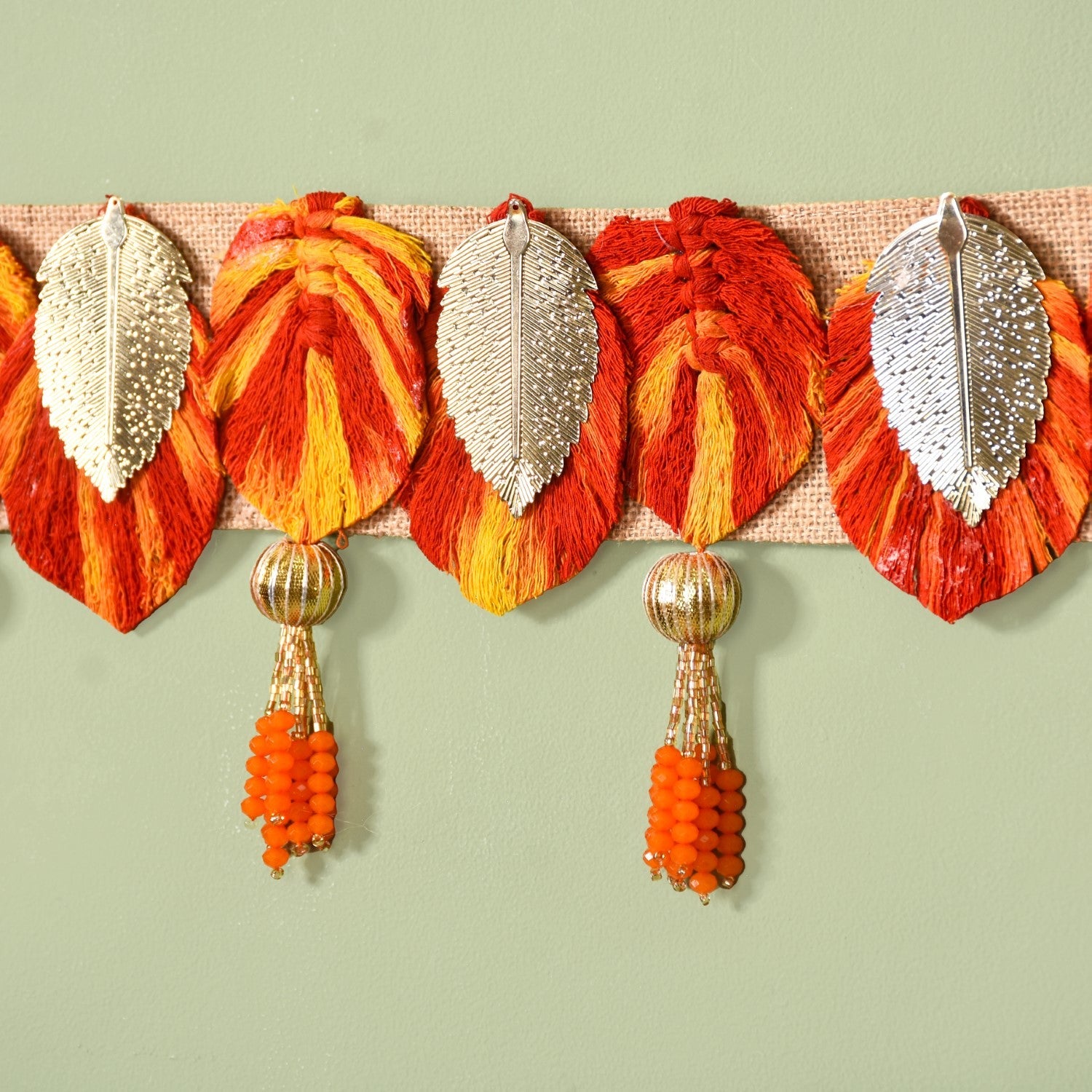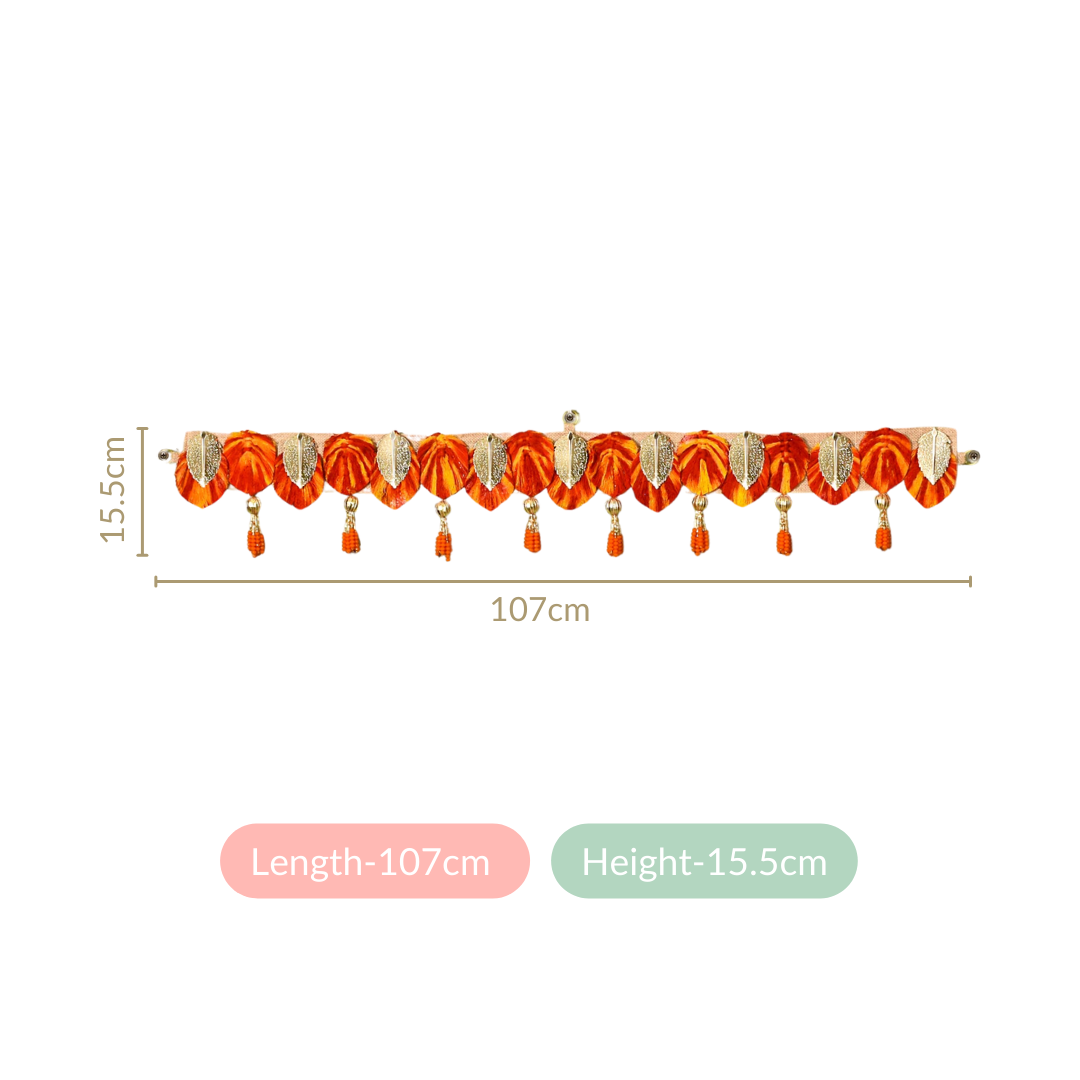 Design: On a sustainable and eco-friendly laminated jute strip, the vibrant door hanging flaunts a lineup of intricately etched sheet metal silver leaves and red-yellow threading that also resembles colourful leaves. Complemented by golden moti balls and gracefully dangling tassels with bugle beads and decorative orange stones, this spectacular toran embodies fine craftsmanship.