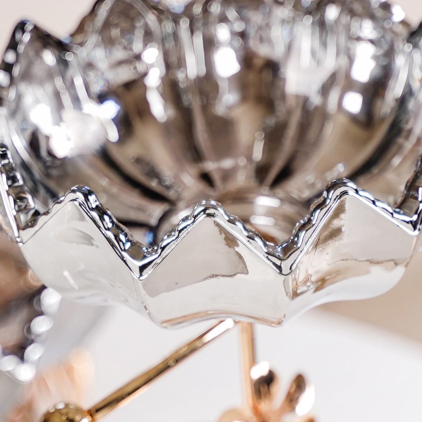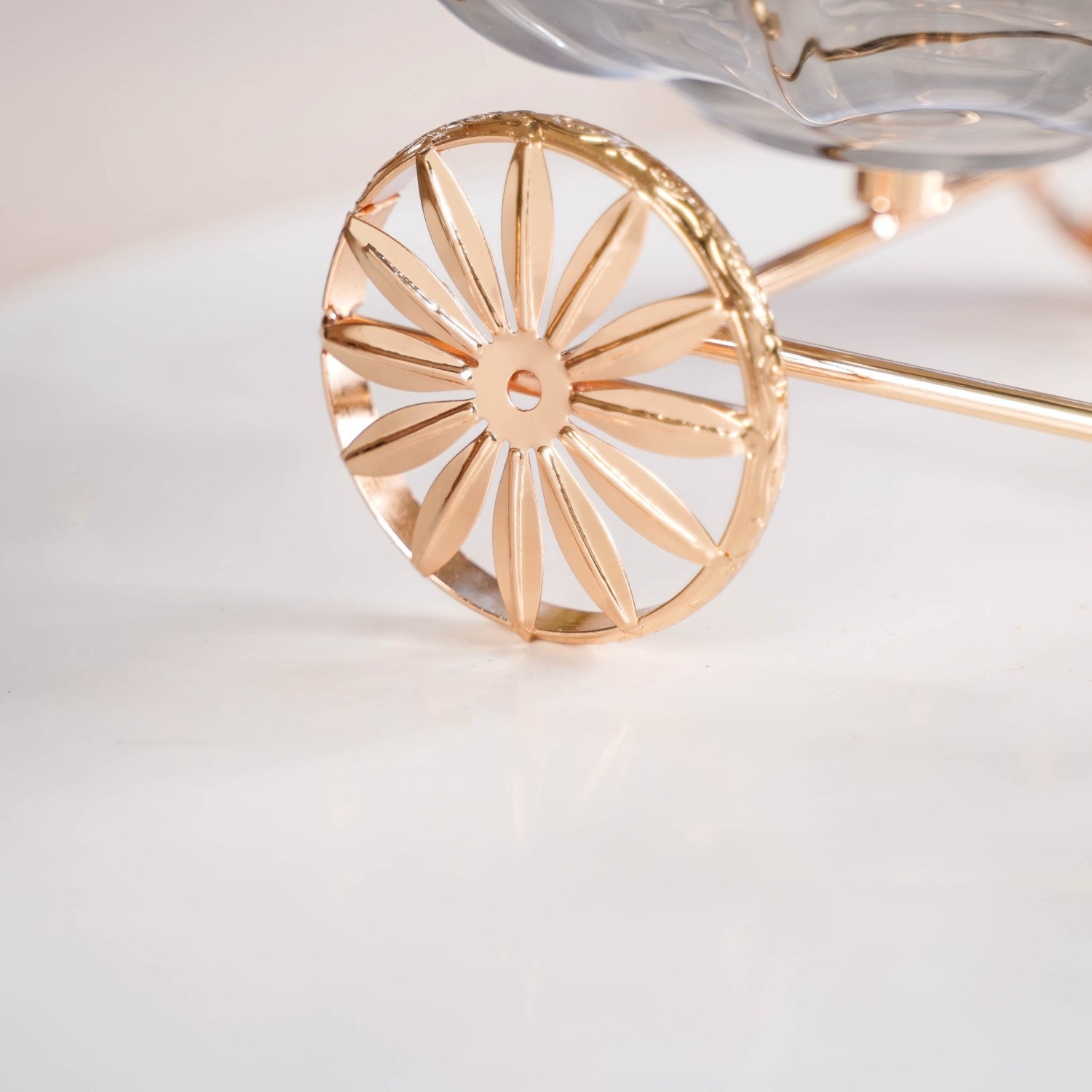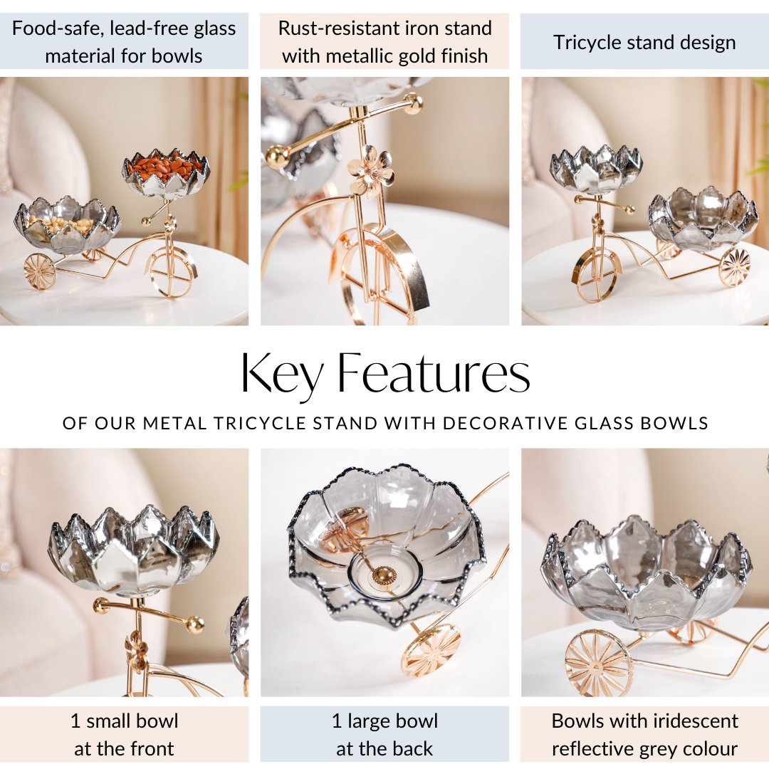 Design: This decorative piece features a unique tricycle stand design, showcasing a small bowl at the front and a larger bowl at the back. The bowls boast an iridescent reflective grey colour, adding a shimmering touch to your decor. The stand, finished in metallic gold, complements the glass bowls perfectly, creating a harmonious balance between the materials.
