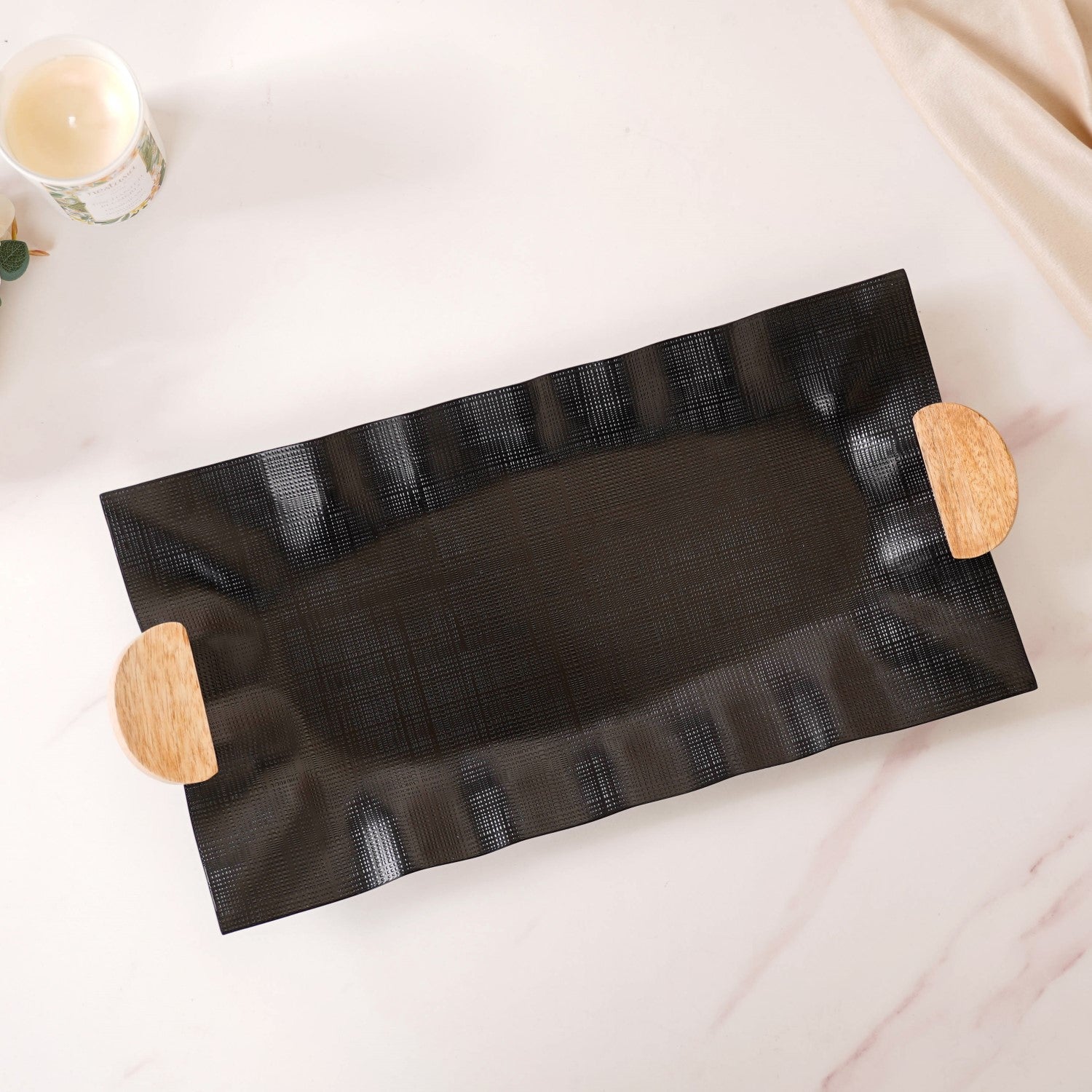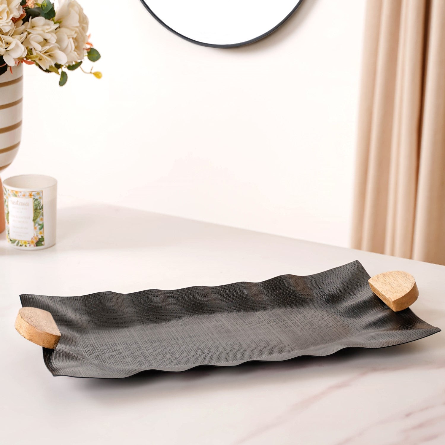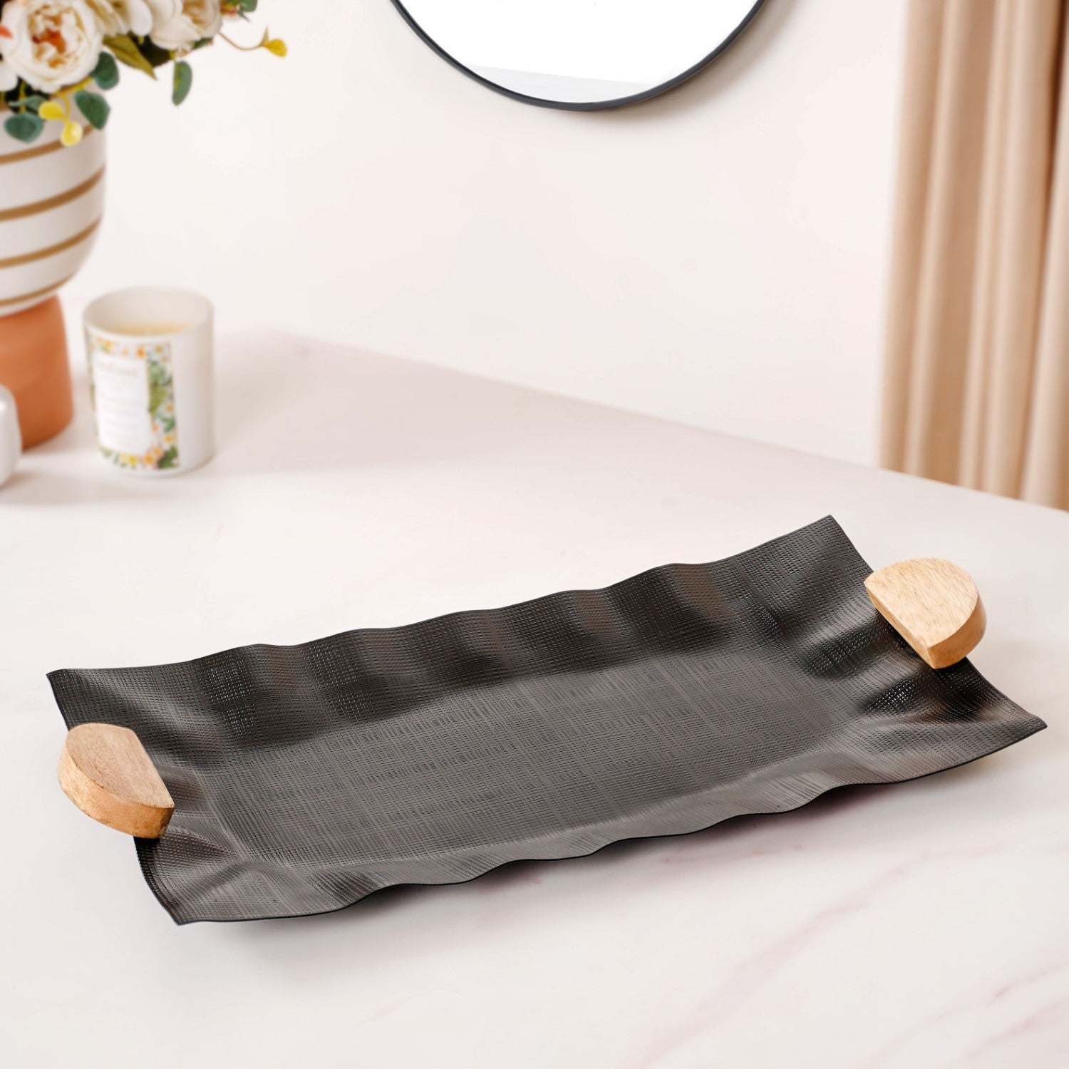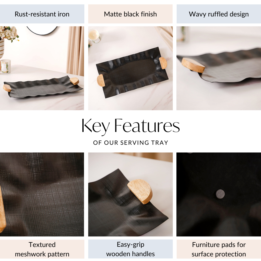 Level up your hosting game with the sleek design and unparalleled functionality of our sleek black metal tray. Designed from rust-resistant iron, this tray is built to last, ensuring longevity and style for your gatherings. The matte black finish adds a touch of modern elegance, while the wavy ruffled design and textured meshwork pattern create a captivating visual appeal. With easy-grip wooden handles and furniture pads for surface protection, serving becomes a breeze. Perfect for showcasing appetisers, cocktails, or decor accents, this multipurpose tray is a statement piece that will elevate any occasion. Shop now and make a lasting impression!