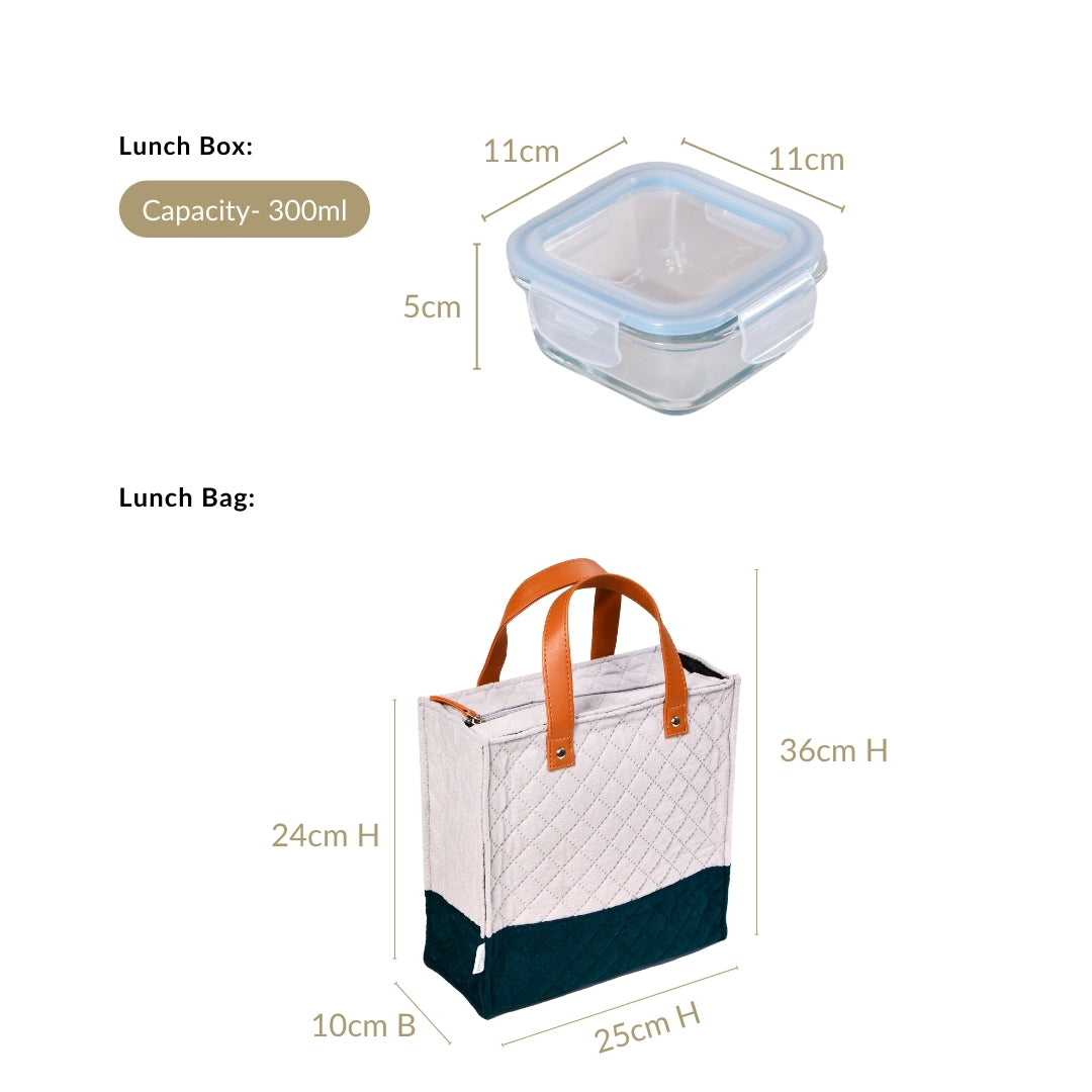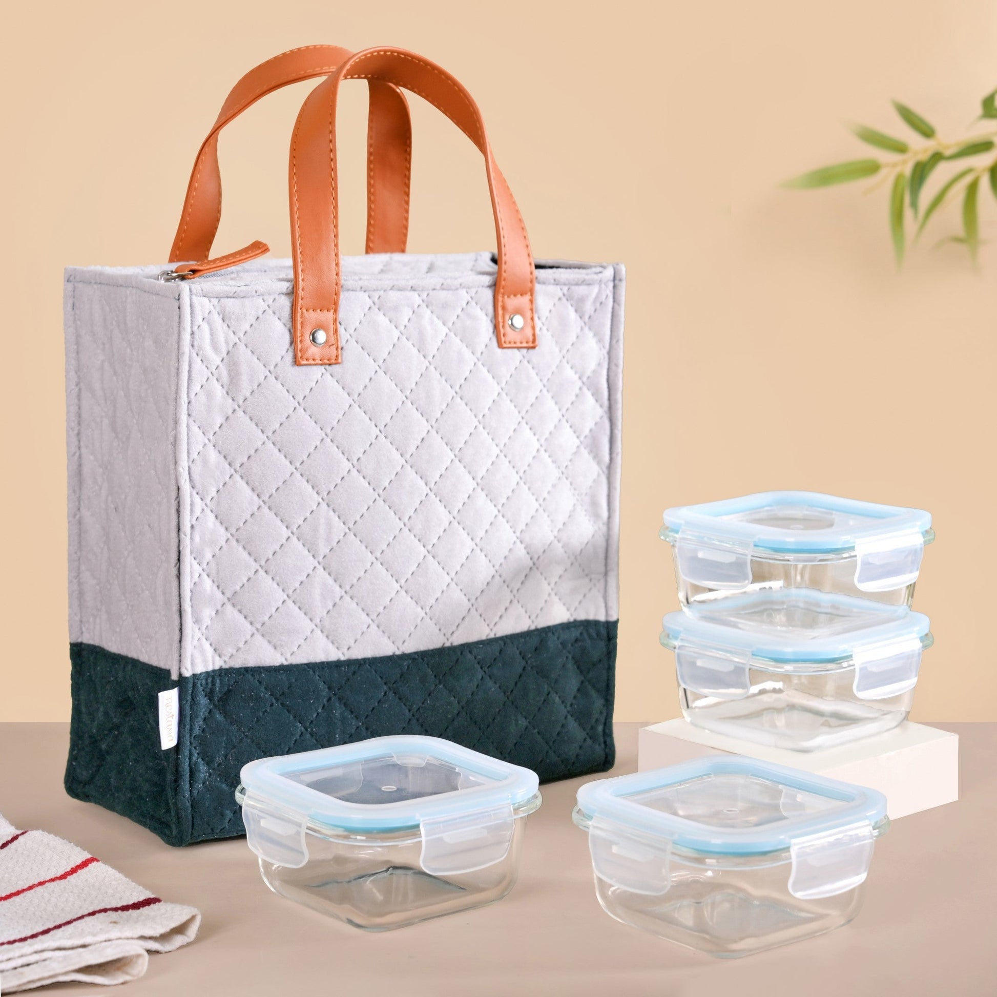 A little luxury, a lot of convenience - our brand-new lunch hamper is here to turn your everyday meals into a stylish affair. The handcrafted quilted lunch bag isn't just a carryall; it's a statement piece - soft, velvety, and effortlessly chic. The bag is also waterproof, with PU leather handles and a smooth zipper. Inside you will find 4 high-borosilicate glass lunch boxes, perfect for packing up a wholesome meal. With airtight lids, leak-proof security, and a microwave-safe build, these containers keep your food fresh, warm, and mess-free.