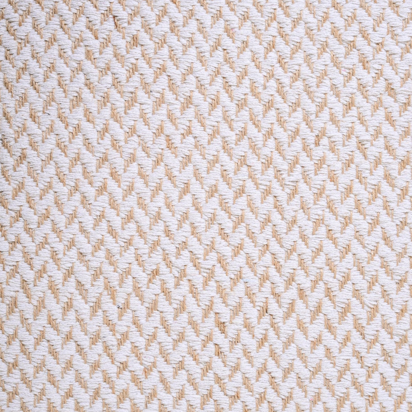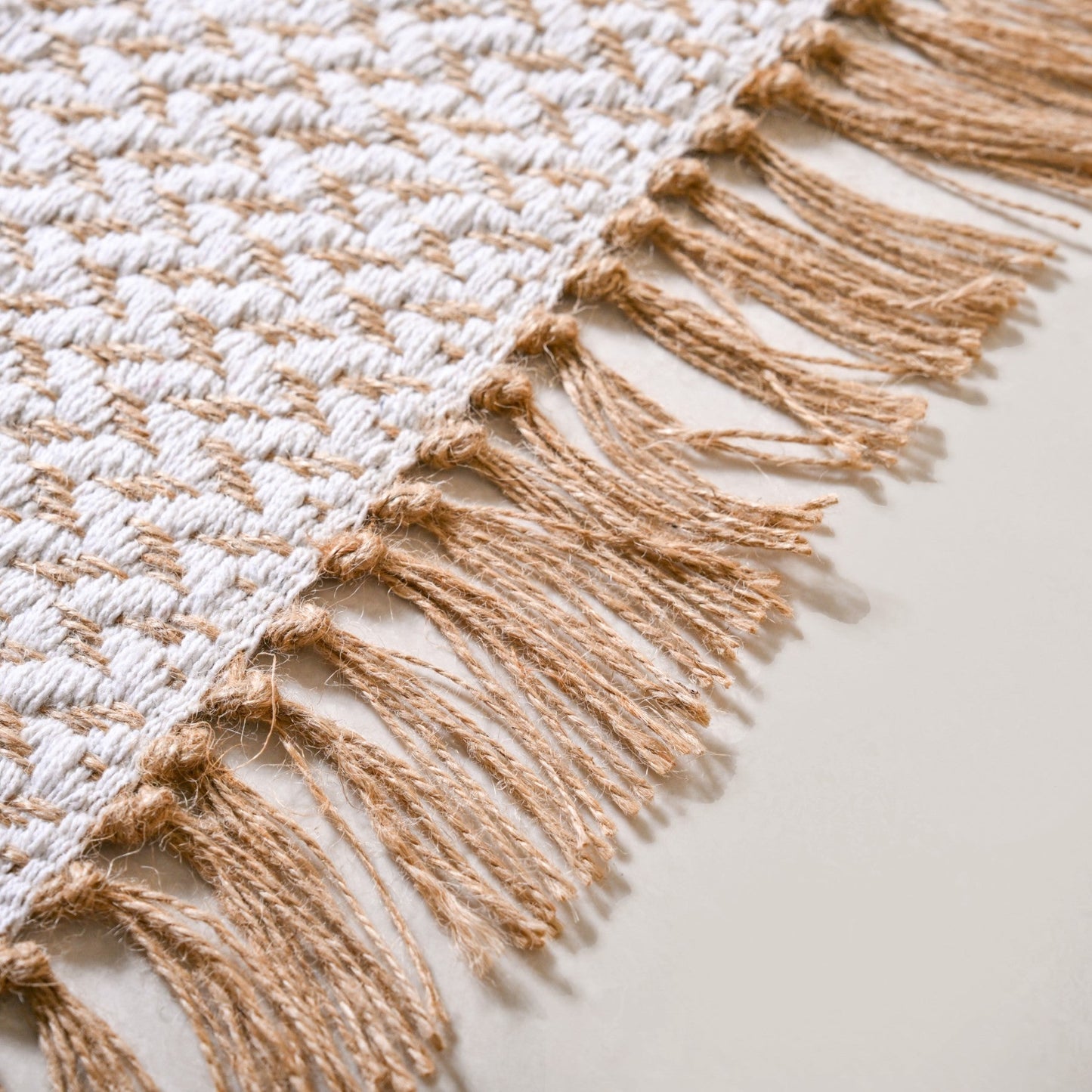 Design: Made from a natural mix of jute and cotton, this rectangular floor mat features a repetitive chevron pattern in light brown and white tones that effortlessly grounds a space. The subtle texture adds visual movement while maintaining a clean, structured look. Its fringed tassel edges introduce a rustic softness that feels right at home in both contemporary and casual corners. The muted palette and natural weave make it a go-to piece for earthy aesthetics, while its foldable form allows easy handling and seasonal swaps.