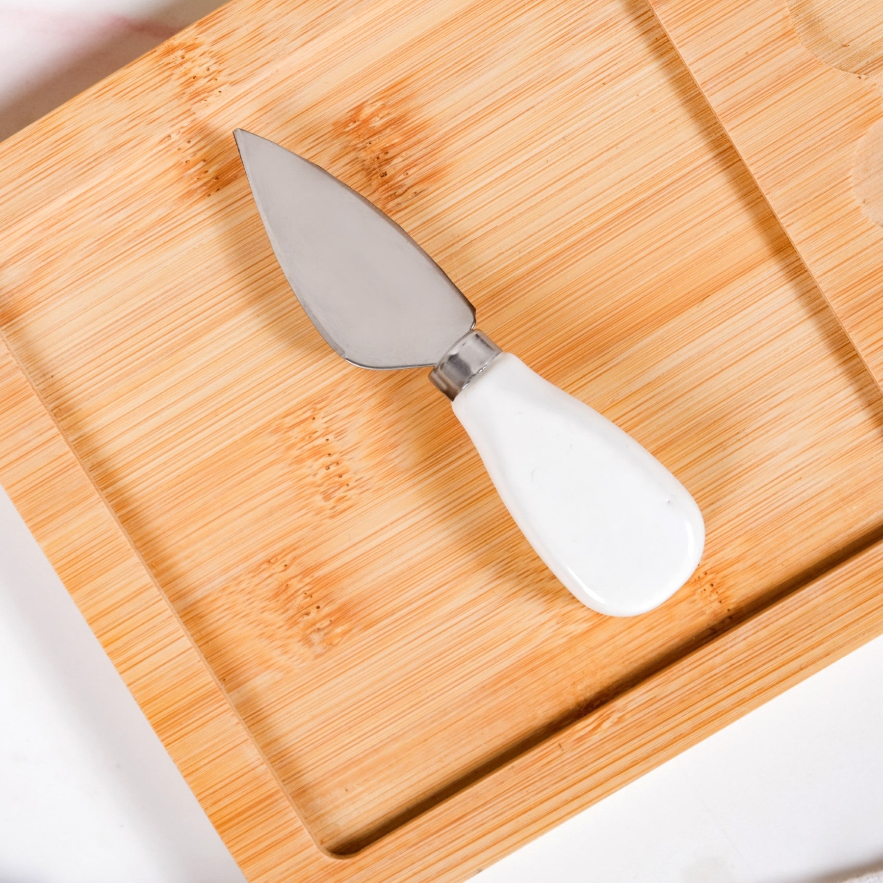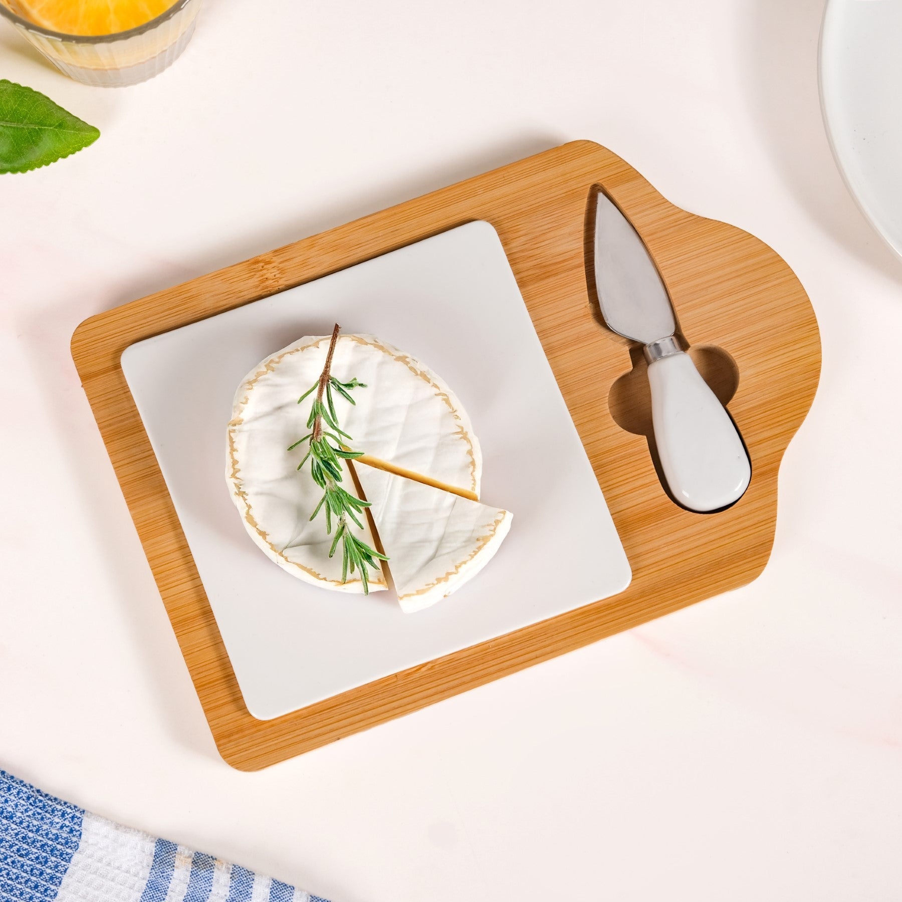 Design: Introducing the bamboo and ceramic cheese board, a meticulously designed piece that redefines elegant entertaining. This board masterfully blends the rich, inviting warmth of natural bamboo with the crisp, modern sophistication of a pristine white ceramic tile. The set is completed with a cheese knife that has a distinct paddle shape to its blade, widening towards the end. The handle is white and made of ceramic with a slight curve for an ergonomic grip. The interplay of these textures and colours creates an immediate visual harmony, enhancing any spread. Its sleek, ergonomic silhouette is thoughtfully proportioned, offering a contemporary aesthetic that commands attention without being ostentatious. For long-lasting use, wipe with a damp cloth and let it air dry.