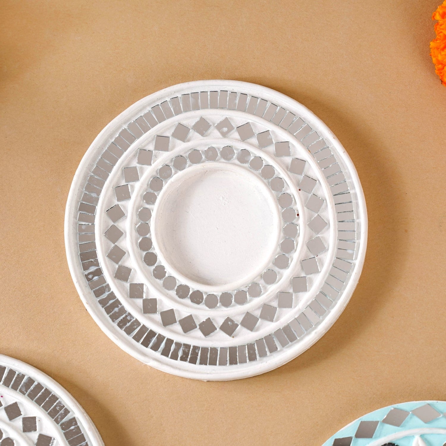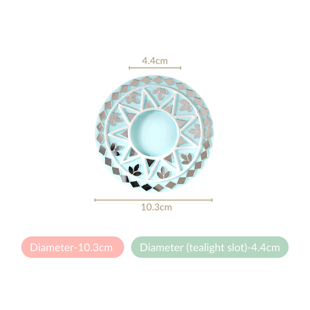 Design: Each tealight holder is a round masterpiece, showcasing the intricate beauty of Lippan art- a traditional craft that reflects the essence of Gujrati culture. The delicate mirror work embedded in the design adds a shimmering elegance, reflecting the soft flicker of candlelight to create a warm and inviting ambience. The crisp white and serene light blue colours were specifically chosen as they complete any interior design style, making these candle holders versatile decor objects in your space.