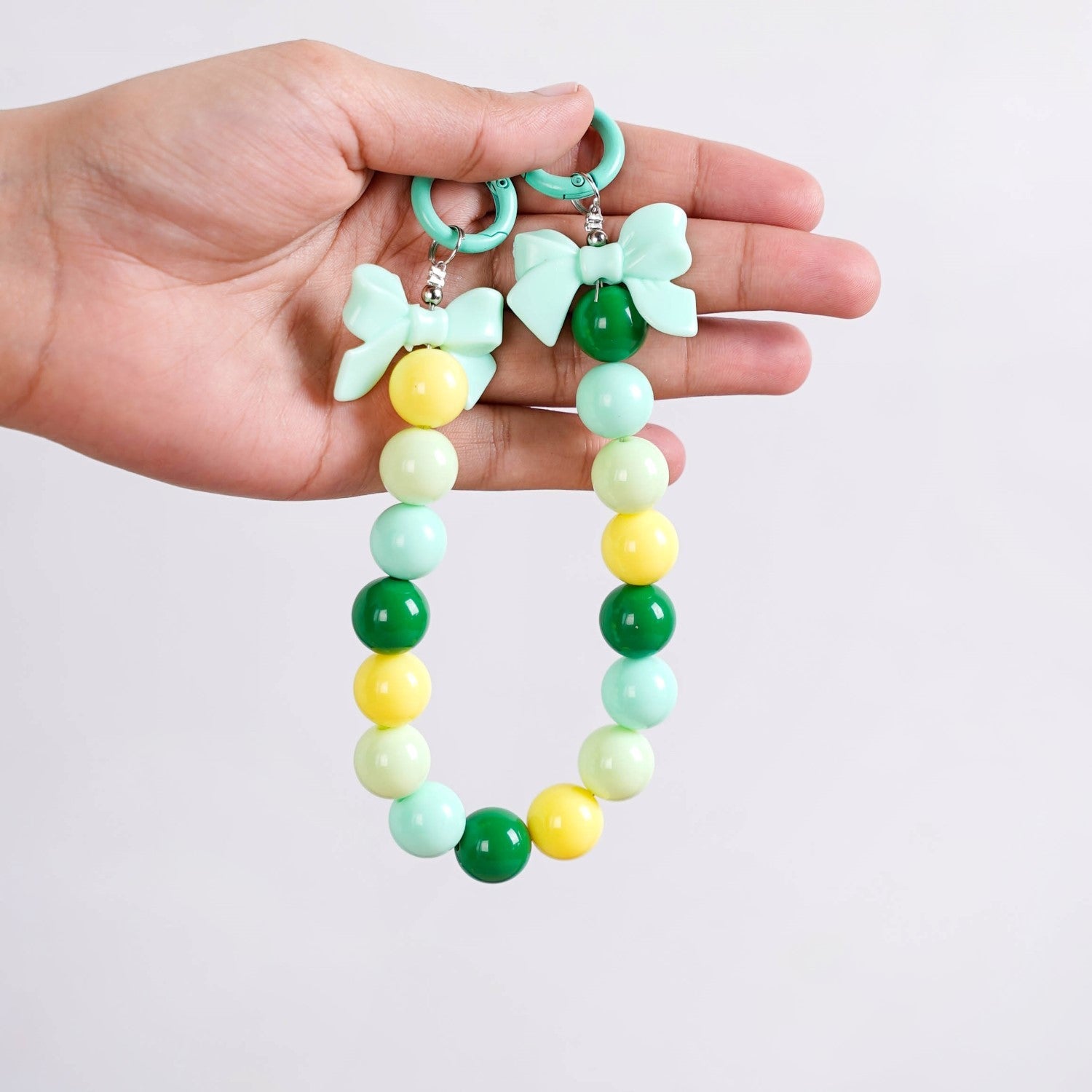 This keychain adds a playful pop of colour to your everyday essentials, making it the perfect fashion accessory. Made from high-quality, durable materials, this keychain features two metal clasps, allowing you to use it as a keychain or a bag charm. However, it's the serene yet vibrant design that steals the show. Adorned with chunky beads in various shades of green and accented with cheerful pops of sunny yellow, this keychain is further elevated by delicate mint green bows that add a charming finishing touch, making it an absolute must-have. Grab yours now and add a refreshing touch to your keys.