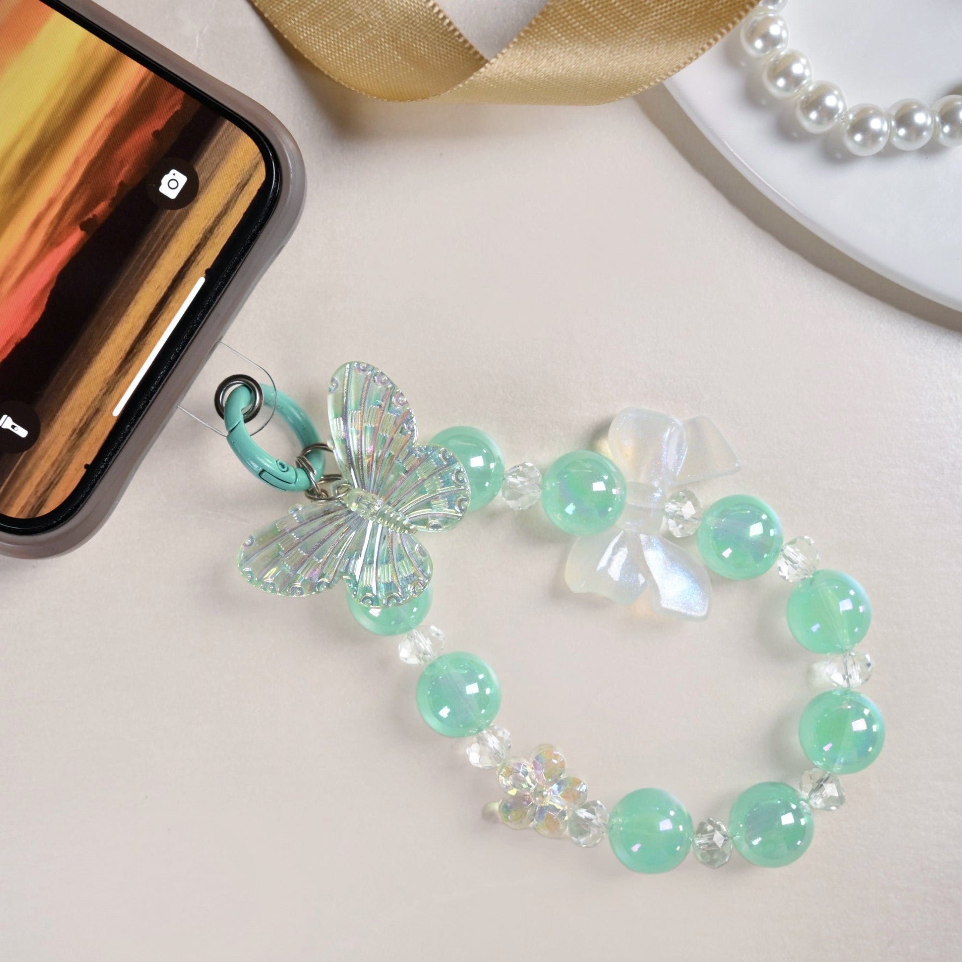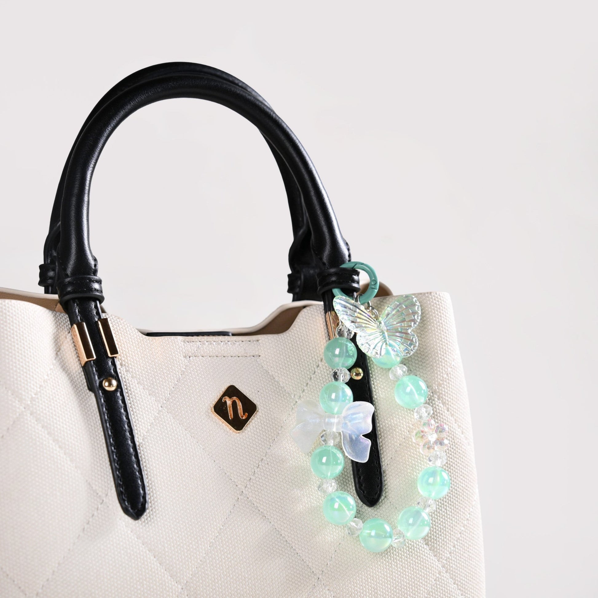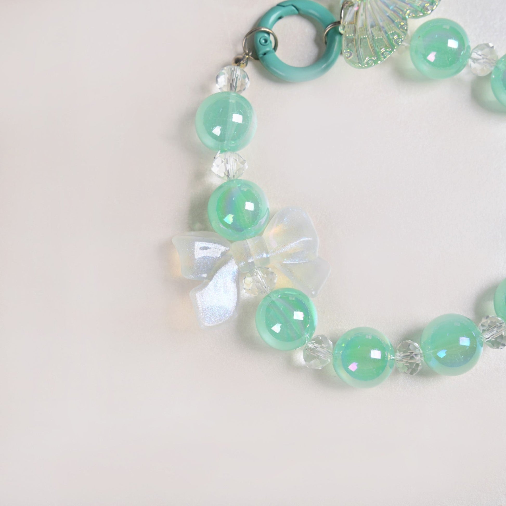 A fun way to add a little extra pizazz to your keys, this keychain is the epitome of style. Adorned with a mix of small and chunky beads in a serene mint green and transparent hues with iridescent finishes, this keychain is sure to bring a smile every time you reach for your keys. But it doesn’t stop there! A beautiful bow-shaped bead in glittery, iridescent white adds a touch of elegance, while a dainty butterfly and a flower bring nature-inspired accents to life. Whether you attach it to your keys or a favourite bag, this keyring is more than just a functional accessory, it's a statement piece that adds a dash of fun and sparkle to your day. Ideal for those who appreciate a bit of whimsy and a lot of style, this keyring will be the cheerful companion you didn’t know you needed!
