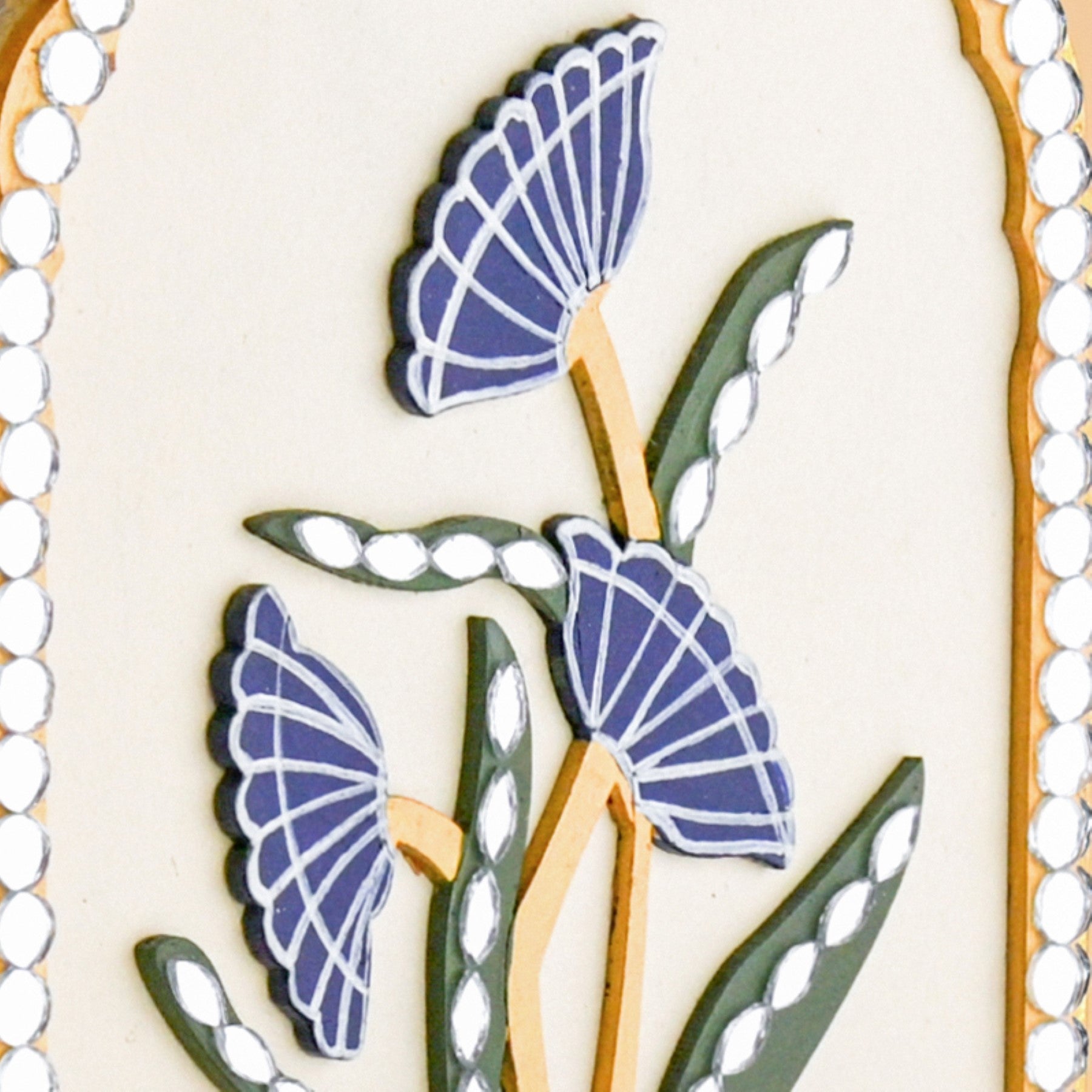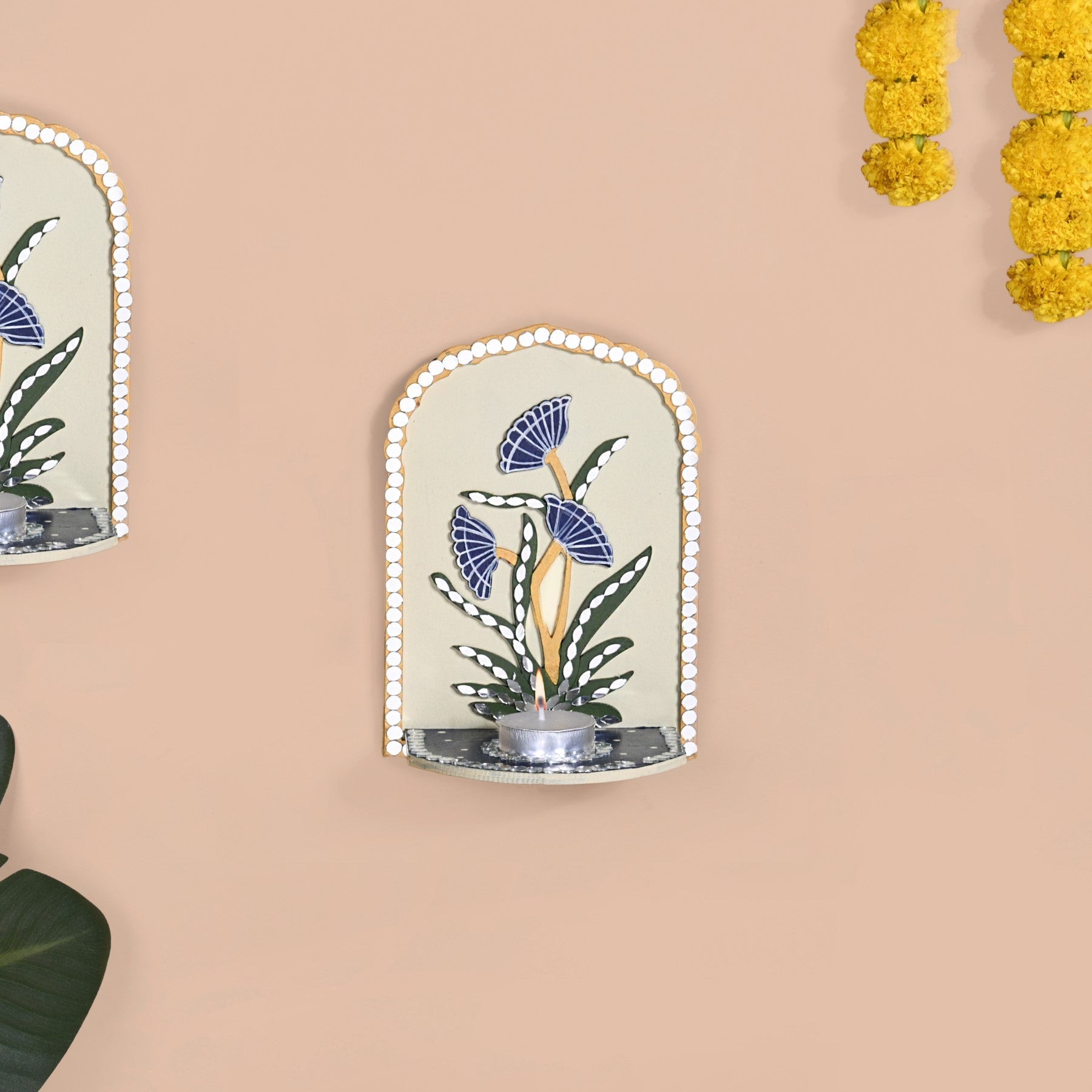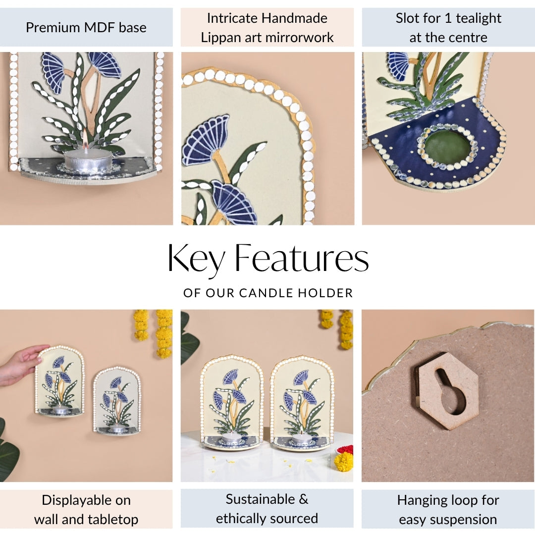 Design: Inspired by the famed Lippan Kaam from Gujarat, these tealight holders infuse your space with the warmth of tradition and the shimmer of mirror accents. Ideal for festivals, gatherings, or quiet evenings, they cast a soft glow while doubling up as eye-catching décor. Made from durable MDF board, the surface features both matte and glossy finishes, offering a combination of sturdiness and refined texture. Each holder features a floral motif with royal blue petals and green leaves, surrounded by delicately placed mirrors. The rich palette is accentuated by hand-painted gold outlines and dotted embellishments that reflect candlelight beautifully, enhancing your festive ambience. The intricate mirrorwork reflects flickering candlelight, creating a magical effect that enhances any setting.