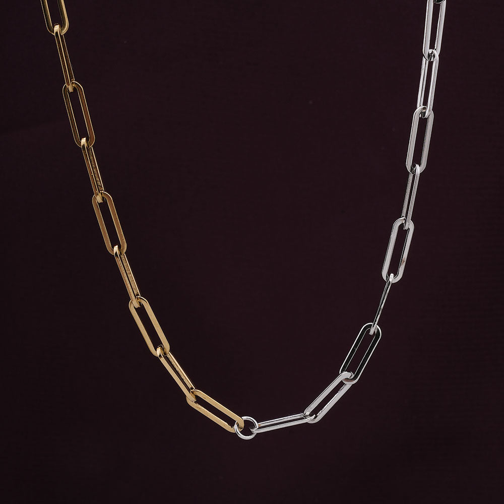 The Mixed Meta Chain Link Necklace is a bold and contemporary jewellery statement. Featuring dual-tone plating and interlocking chain links, it adds texture, shine, and modern edge to any outfit. Perfect for layering with delicate chains or wearing solo, this versatile necklace elevates both casual and evening looks with a striking, fashion-forward appeal.