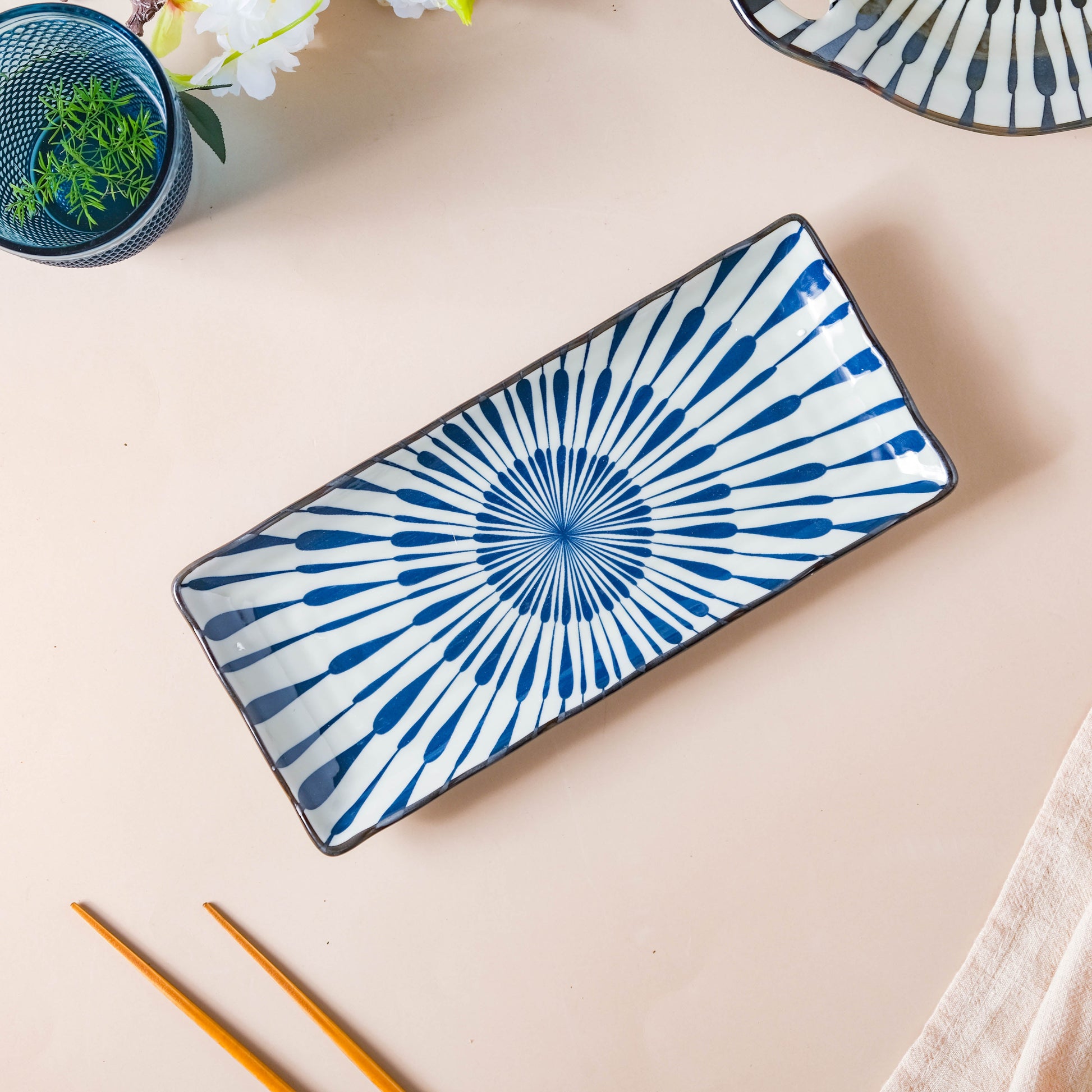 Anyone who believes in serving snacks and appetizers to one's guests in style would not miss out on the opportunity of making the elegant rectangle serving platter a part of one's crockery collection. The use of a color-blocked design and the deep blues would give the table setup an aristocratic feel. Set dishes on the table in style and make servings of fruit, cake, or just about anything look as good and appealing to guests and family members as possible.