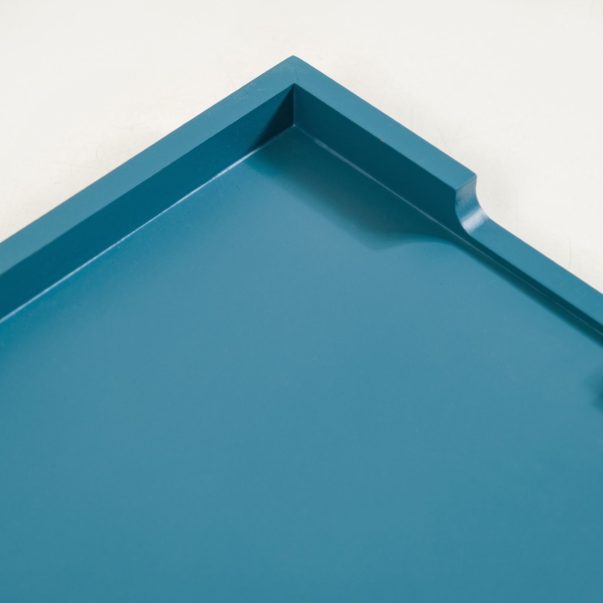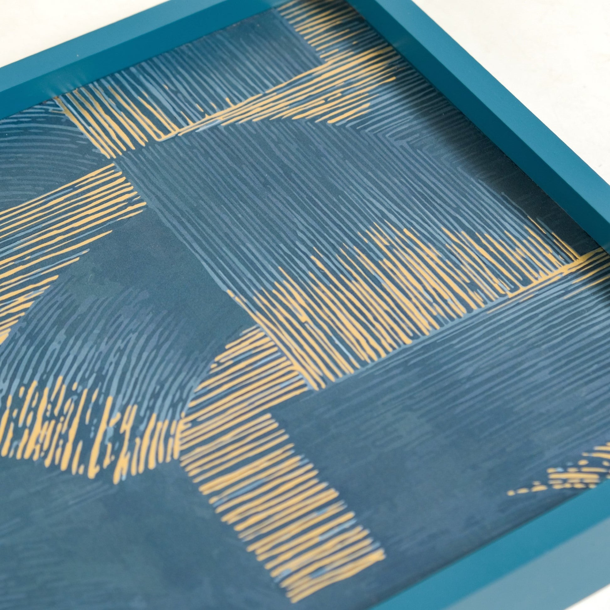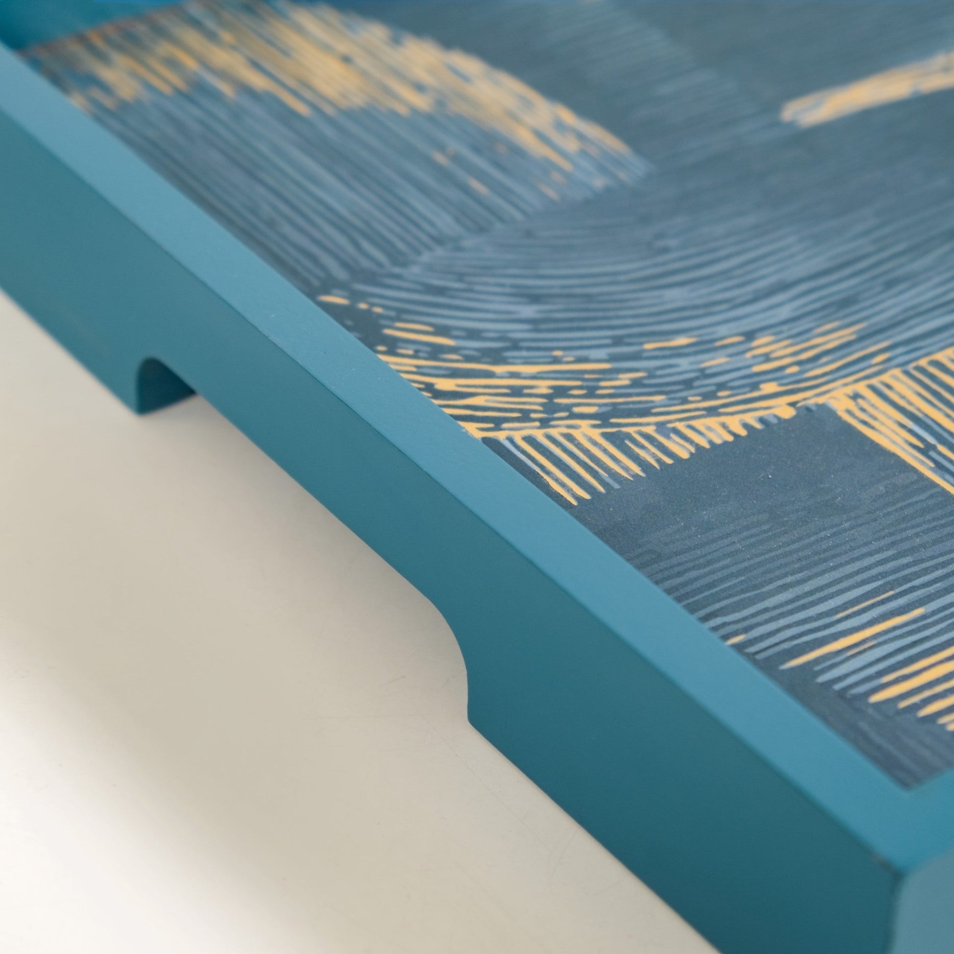 Design: Bold, artistic, and sophisticated, this wooden tray is inspired by Post-Modernism, where the theatrical meets the theoretical. The deep green base sets a rich backdrop for the golden centre detailing, reflecting the grandeur of artists like Roy Lichtenstein and Barbara Kruger. Linear scaling lines create a dynamic visual, adding movement and depth to the design. The sturdy handle spaces ensure a firm grip, while the slightly raised base offers balance, preventing spillage. Crafted for both function and aesthetic appeal, this serving tray transforms everyday hosting into an artistic expression.