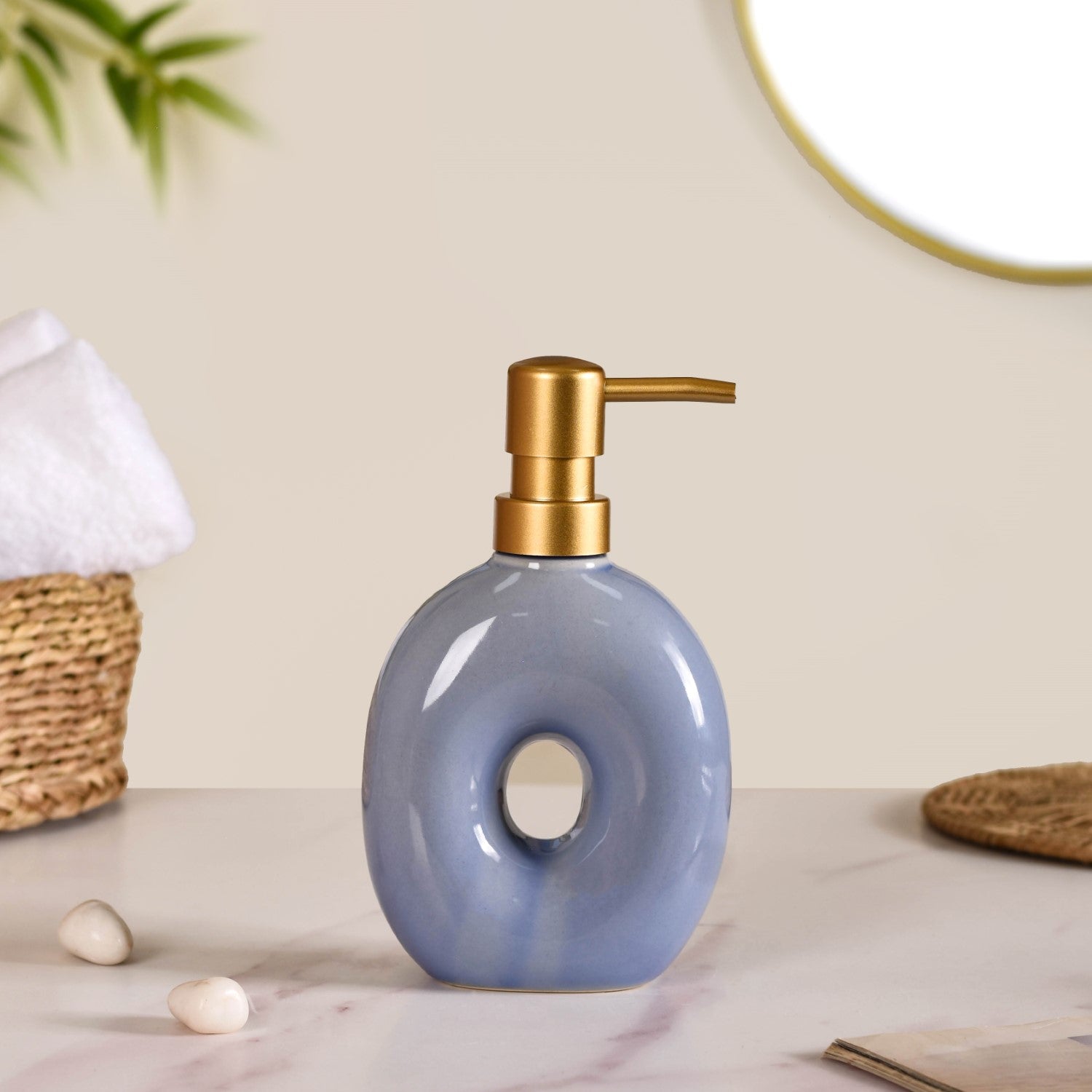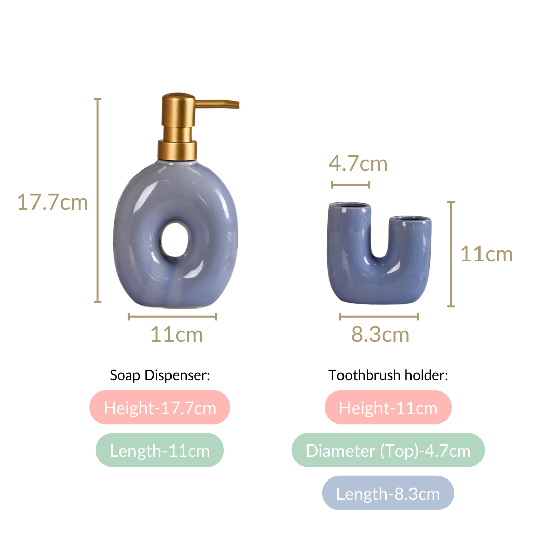 Introducing our latest bath set, a harmonious blend of functionality and style that will transform your daily routine into a luxurious experience. Crafted from high-quality non-porous ceramic, this set promises durability and resilience, ensuring it withstands the test of time with ease. Now, moving to the star of the show. The soap dispenser. Elegantly shaped like a delicate doughnut, adding a touch of modern sophistication to your space, its smooth curves and serene blue hue evoke a sense of calm and tranquillity, making it a delightful addition to any bathroom decor. The set is completed with our toothbrush holder, boasting a uniquely captivating and charming uneven "U" shape, adding both visual interest and practicality to your space. It truly is a bath set that will help you create a stylish, clean, and organised countertop.