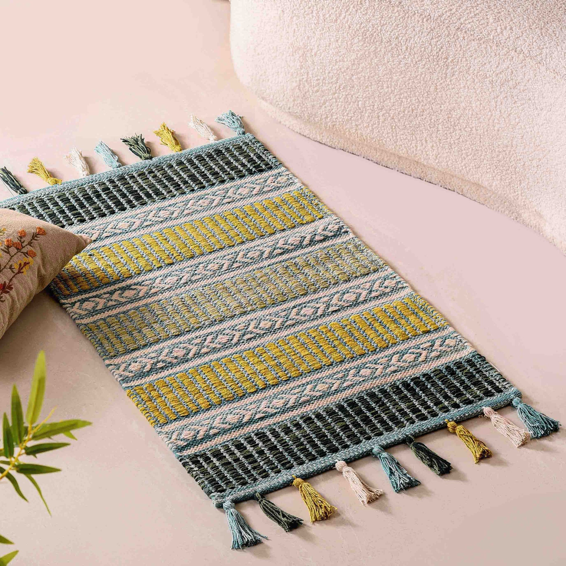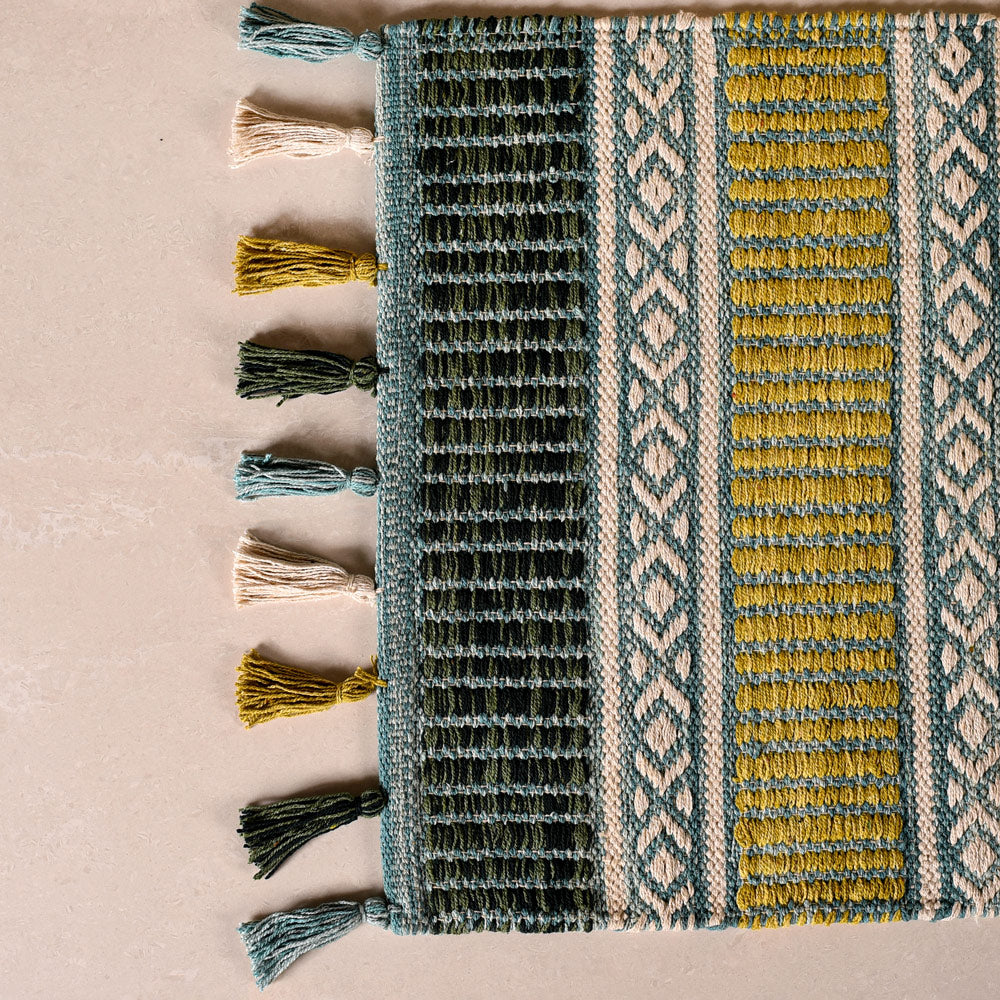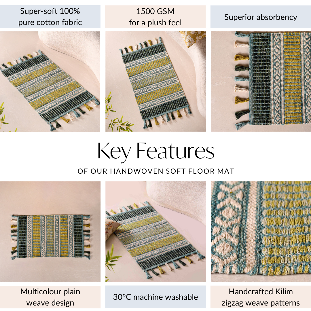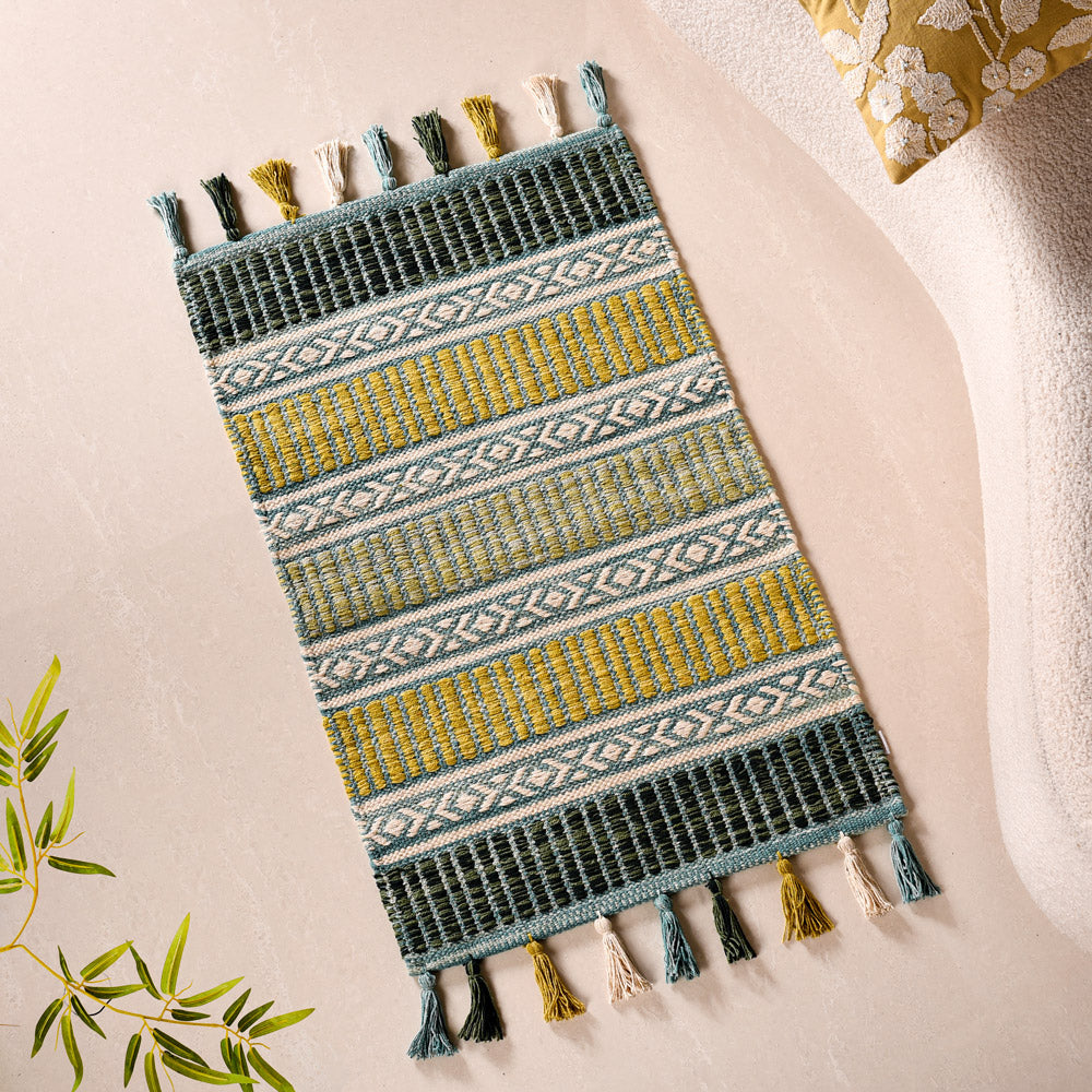 Revitalise your home decor with our luxurious handwoven cotton floor mat, showcasing a gradient of tranquil green hues. This mat combines stunning visual appeal with exceptional functionality for a truly versatile addition to your space.