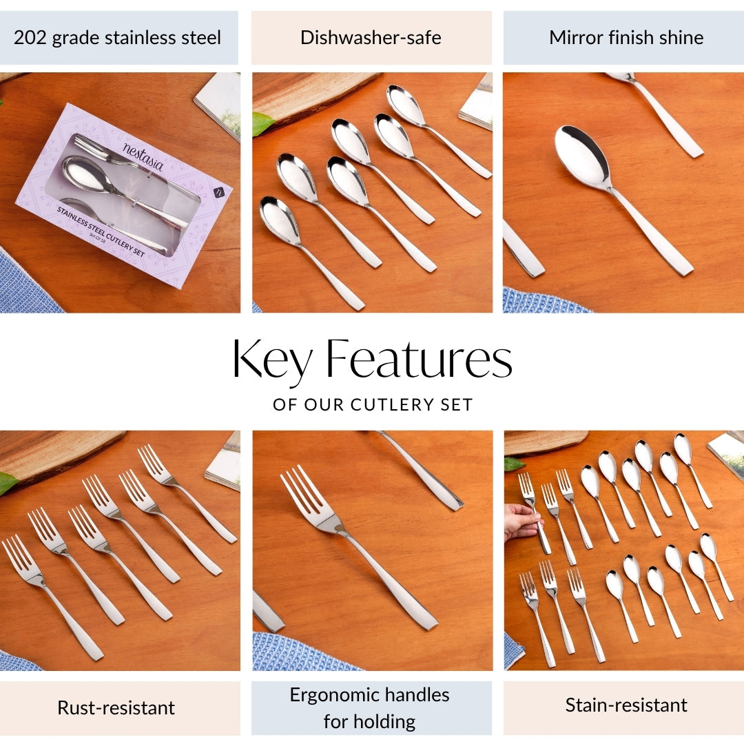 Nestip: Pair your stainless steel cutlery with gold-rimmed plates or copper-toned serveware for a luxe, layered look.