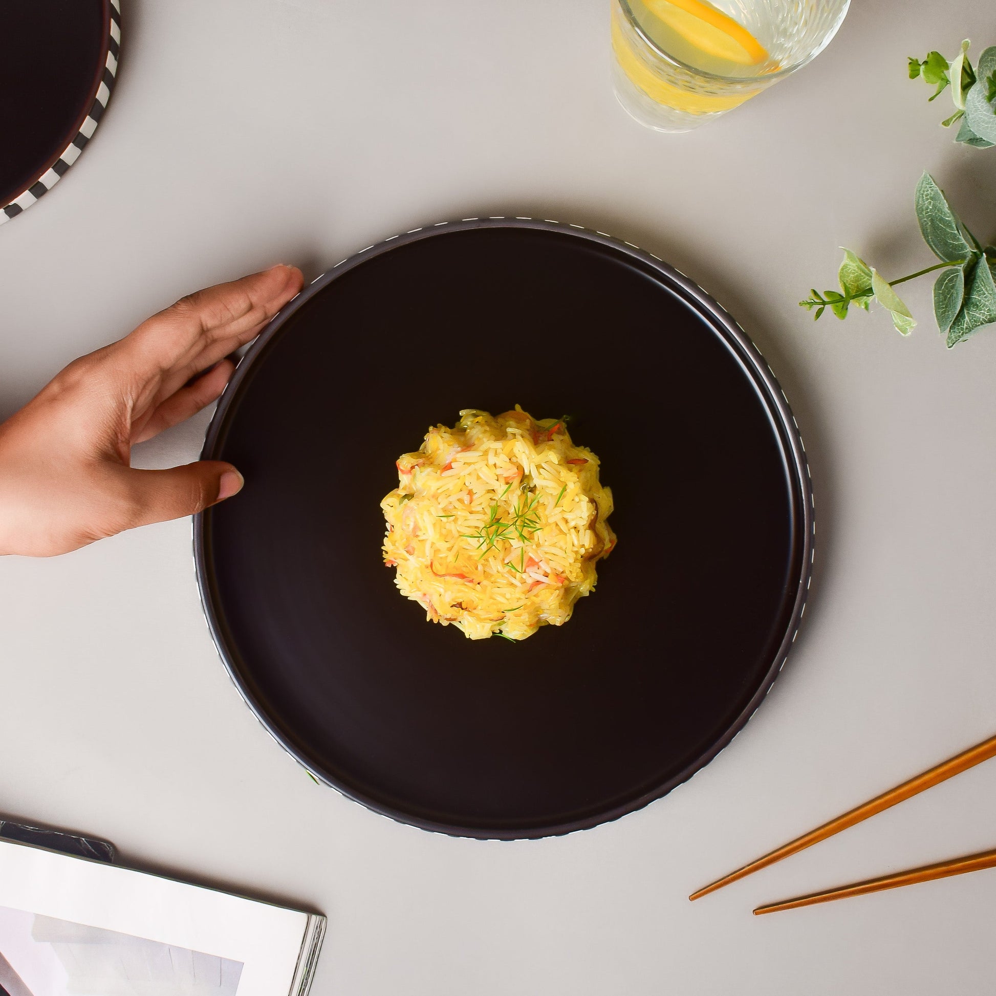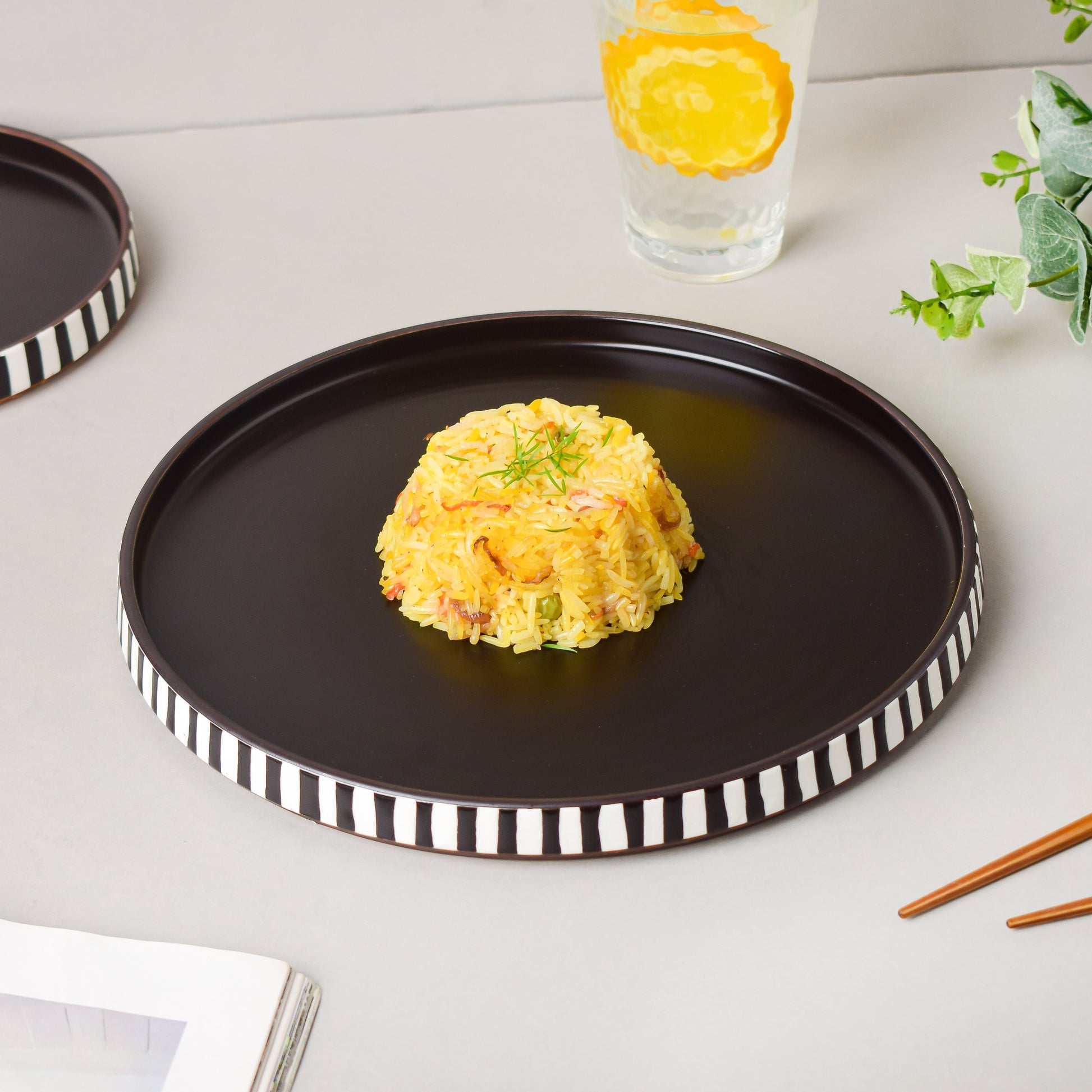 The solid black shade on the inner surface in contrast to the monochrome vertical stripes on the outer rim, lends a unique appeal to the food served in it. Any meals in contrasting shades such as creamy cheese pasta or sauted veggies will uplift the overall look. The ceramic round plate can be used for serving lunch, dinner, or any main course meal.