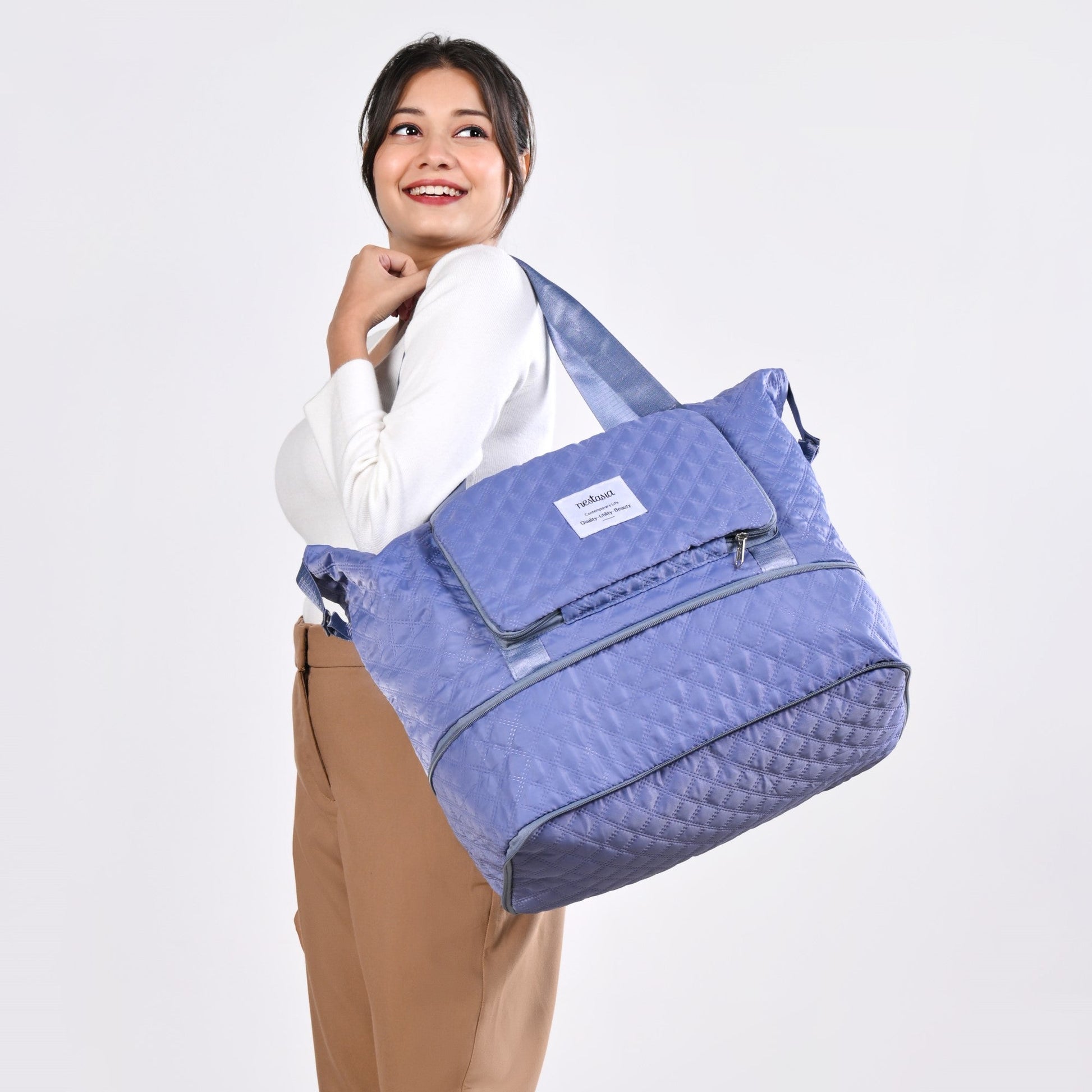 Design: The Montara weekender bag is crafted from high-density nylon, ensuring durability and resilience. The soft steel blue hue adds a calm, sophisticated touch, while the embossed geometric pattern creates a subtle texture that elevates its overall look. With its clever expandable design, this bag effortlessly transforms from a sleek, compact pouch into a spacious travel bag with ease. Equipped with a large main compartment, two zippered side pockets on the exterior, and multiple interior pockets, the Montara travel tote bag ensures your essentials stay organized and accessible. The waterproof lining protects against the elements, and the sturdy, short handles make it easy to grab and go.