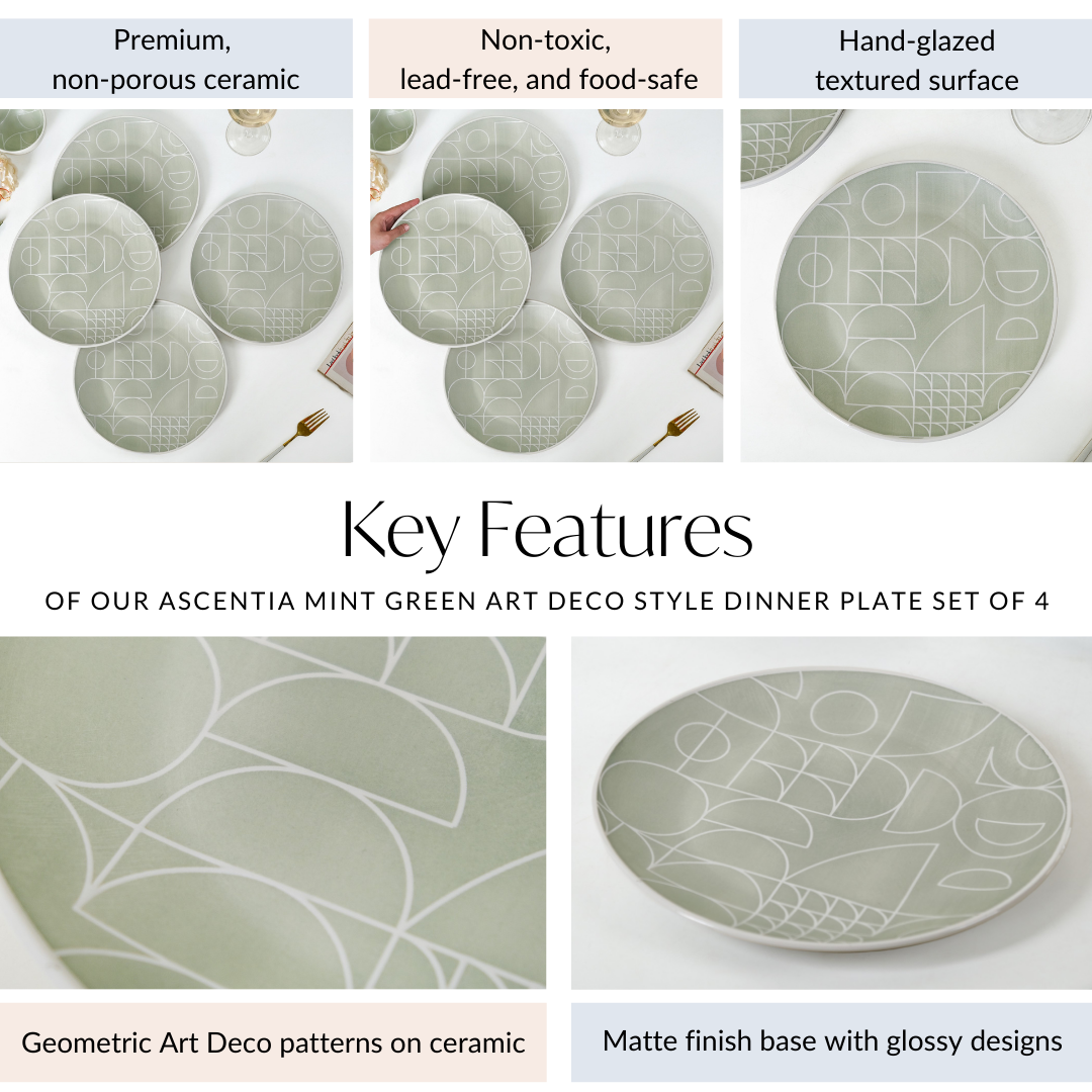 Design: The Monvia dinner plates feature intricate geometric Art Deco patterns, creating a striking visual appeal. With a hand-glazed textured surface and glossy designs, they showcase a harmonious blend of modern and vintage aesthetics. The matte finish base, in a soft mint green hue, adds a subtle touch of sophistication.