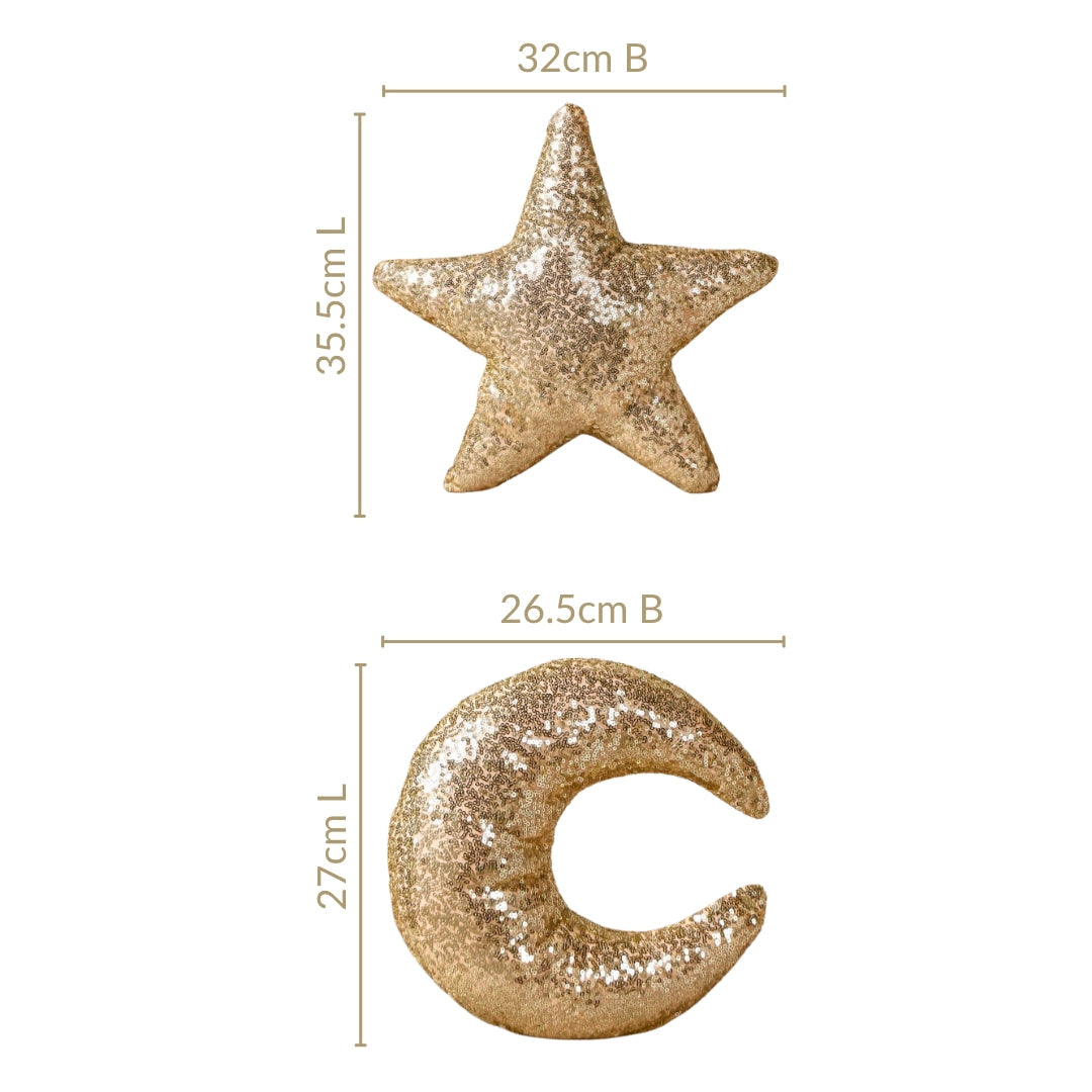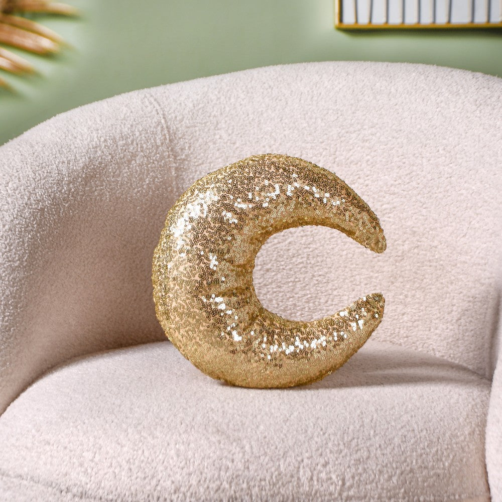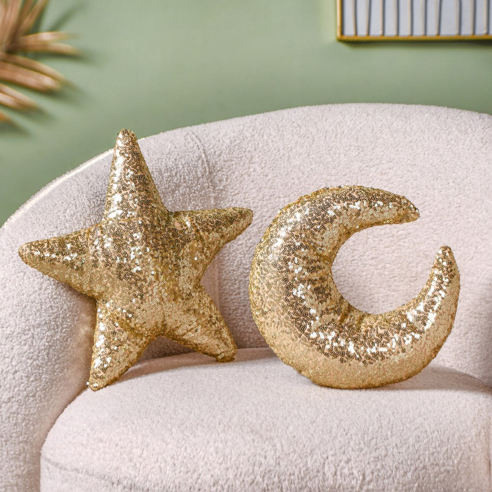Bring a touch of elegance to your home with these sparkling chic cushions. Featuring a luxurious gold sequin fabric atop soft polyester, these throw pillows are shaped into a crescent moon and a star, adding a touch of elegance and whimsy to your decor. Whether placed on your sofa, bed, or as a standout piece in your living room, these decorative cushions make a statement. Perfect for celebrating special occasions like Eid or simply enhancing your everyday ambiance, these throw cushions combine beauty and charm in a way that complements any setting.