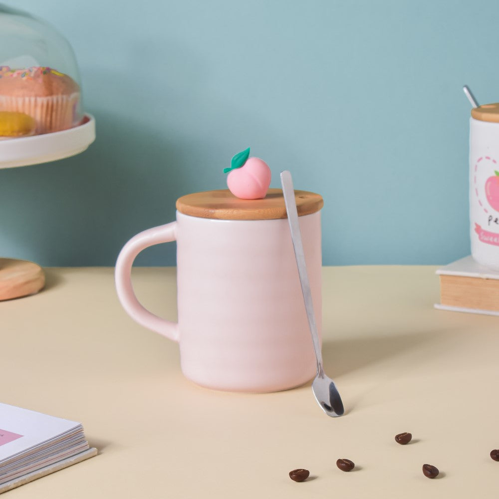 The fruity ceramic mug with a wooden lid and spoon is the perfect drinkware to savour delicious beverages. With a 'Sweet Heart Peach' text and patterns of pink peaches the mug with a ceramic build has a handle to carry hot beverages with ease. The wooden lid of the mug is topped with a pastel pink peach that functions as the lid's handle for easier functionality.