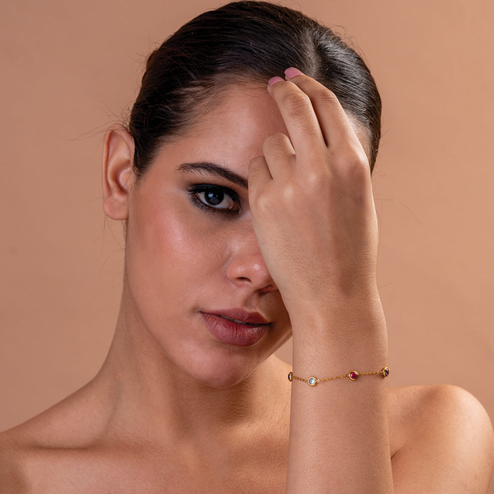 Multi Crystal Charm Bracelet is a sparkling and versatile accessory designed to add a touch of glamour to any outfit. Crafted from stainless steel with a luxurious gold plated jewellery finish, its shimmering charms make it a must-have in demi fine jewellery. Perfect for adding playful elegance to your collection of bracelets for women and gold bracelets for women, this charm bracelet brings subtle sparkle while staying effortlessly stylish.