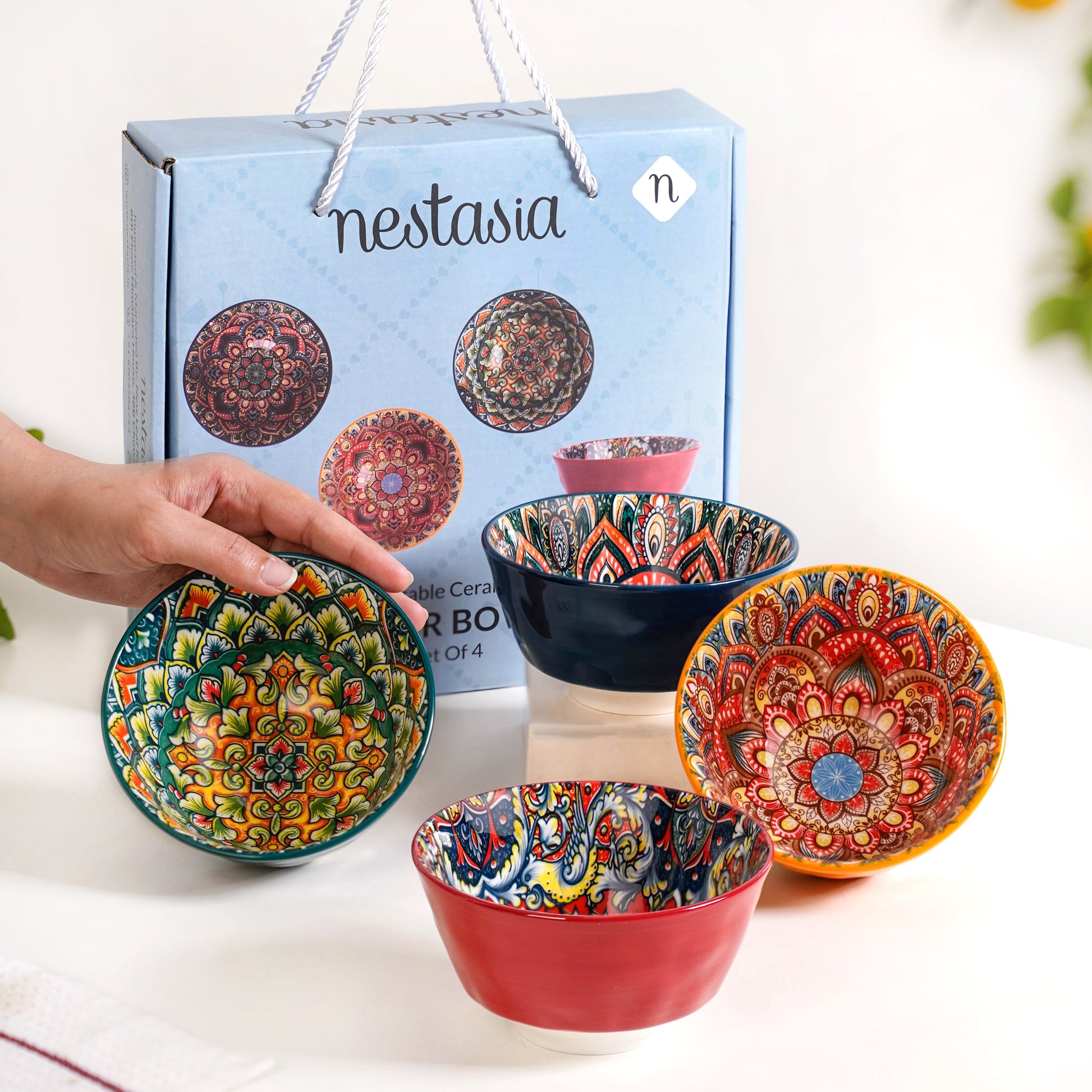 Design: This set features four beautifully crafted snack bowls adorned with traditional floral prints. Each bowl showcases a distinct primary colour on the exterior, namely, red, dark green, orange, and navy blue, giving the set a vibrant and varied look. The interiors are thoughtfully designed with intricate, eye-catching patterns, based on their primary colour. A unifying element across all four bowls is the presence of a prominent central flower motif, tying the designs together as a cohesive set. Additionally, the bowls have a subtly textured exterior, adding a tactile element that enhances their handcrafted charm.