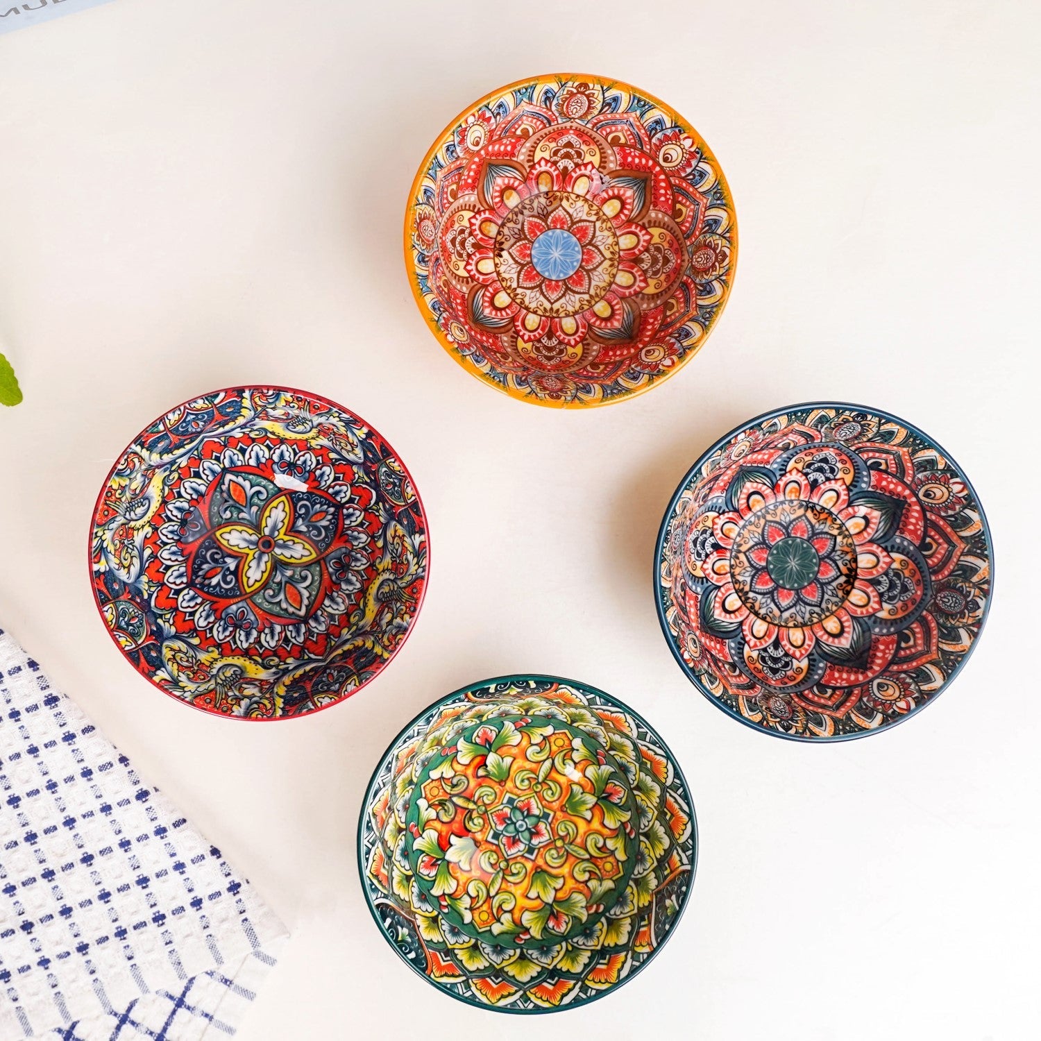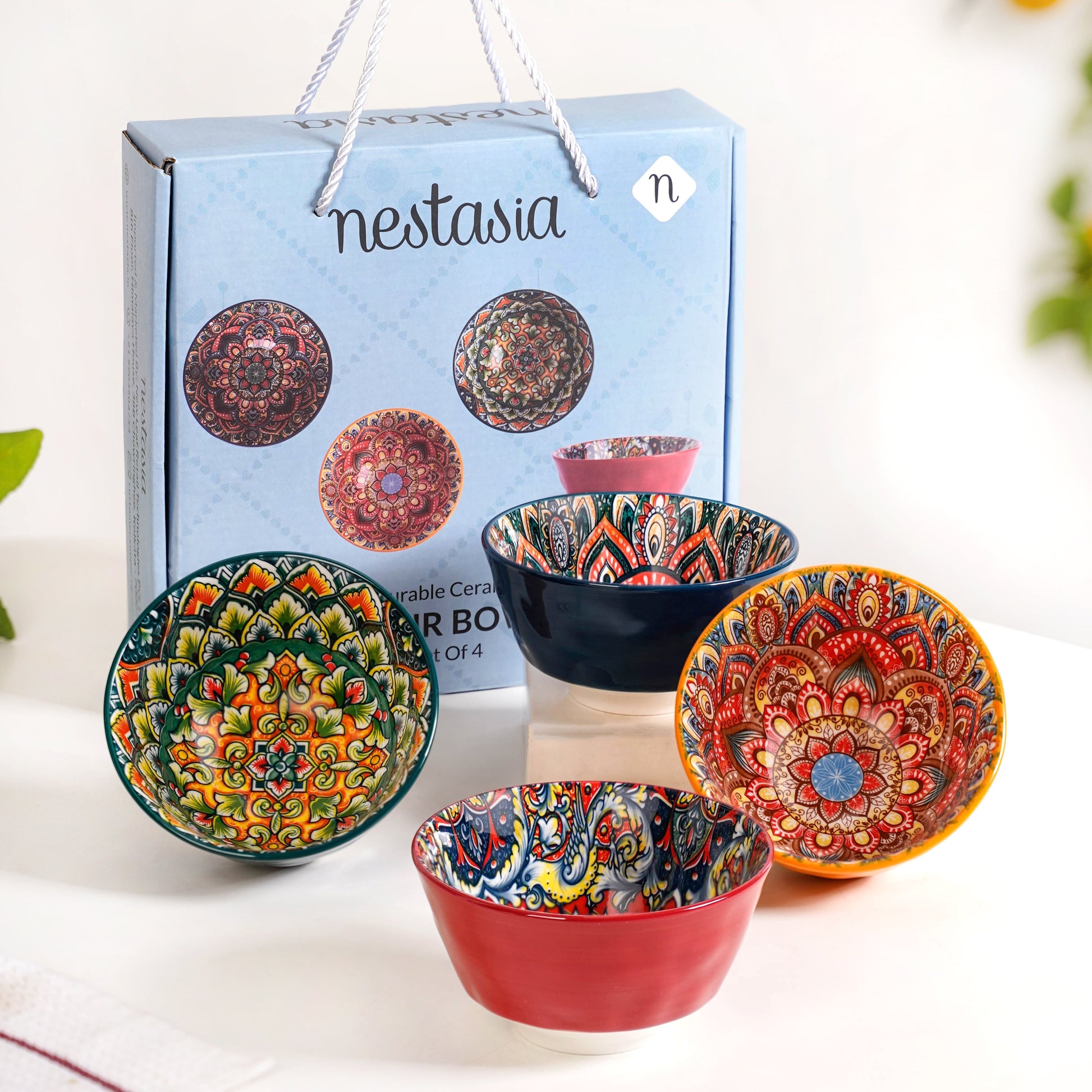 Add a touch of timeless elegance to your table with these traditional mandala print ceramic snack bowls. This bowl set features intricate floral patterns that reflect traditional charm and come in a beautifully designed gift box.