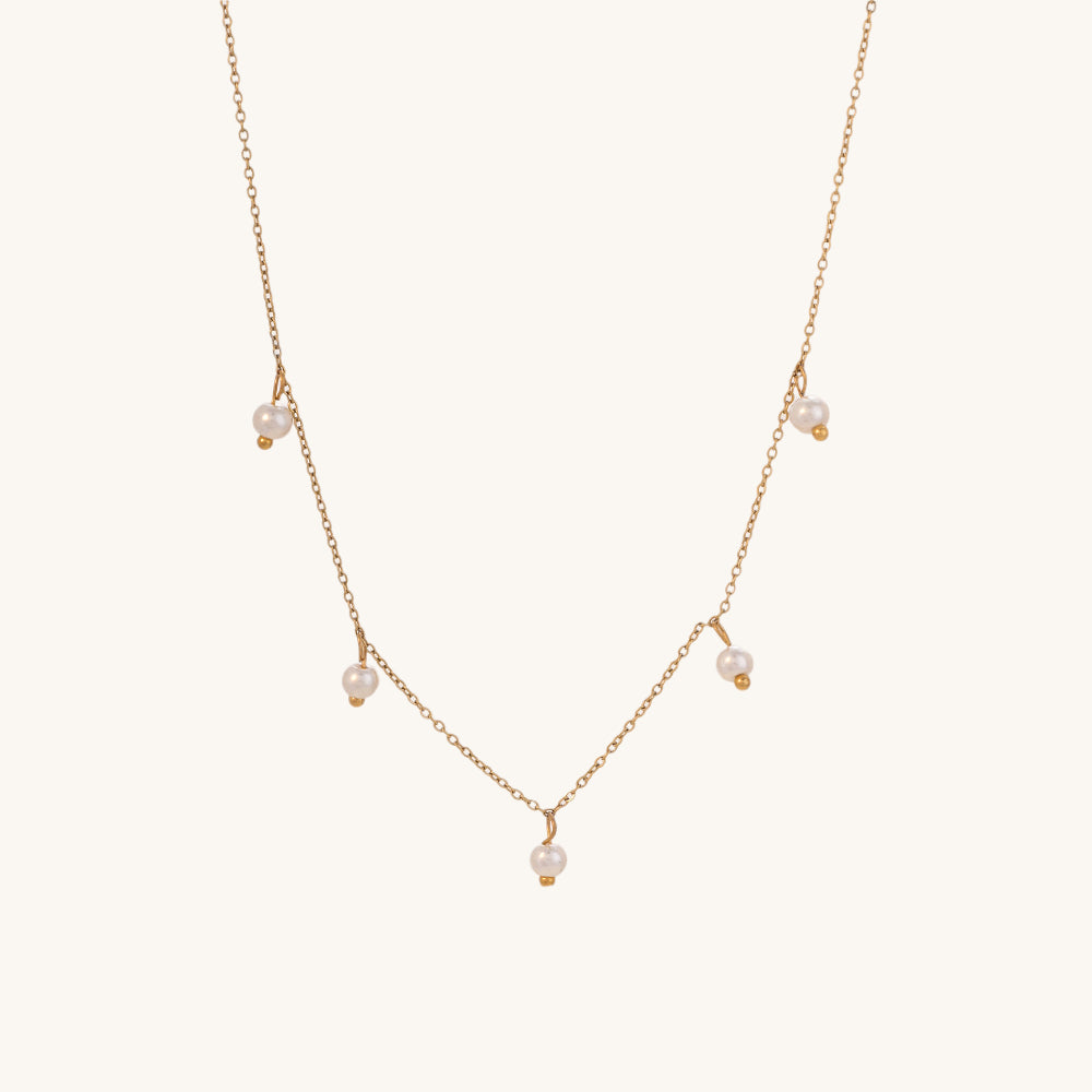 The necklace design showcases a collection of tiny pearl charms that exude timeless allure. Each pearl is meticulously selected for its exquisite luster and flawless quality, creating a necklace that is both captivating and refined. The delicate chain adds a subtle touch of femininity, allowing the pearls to shine as the focal point of the design.
