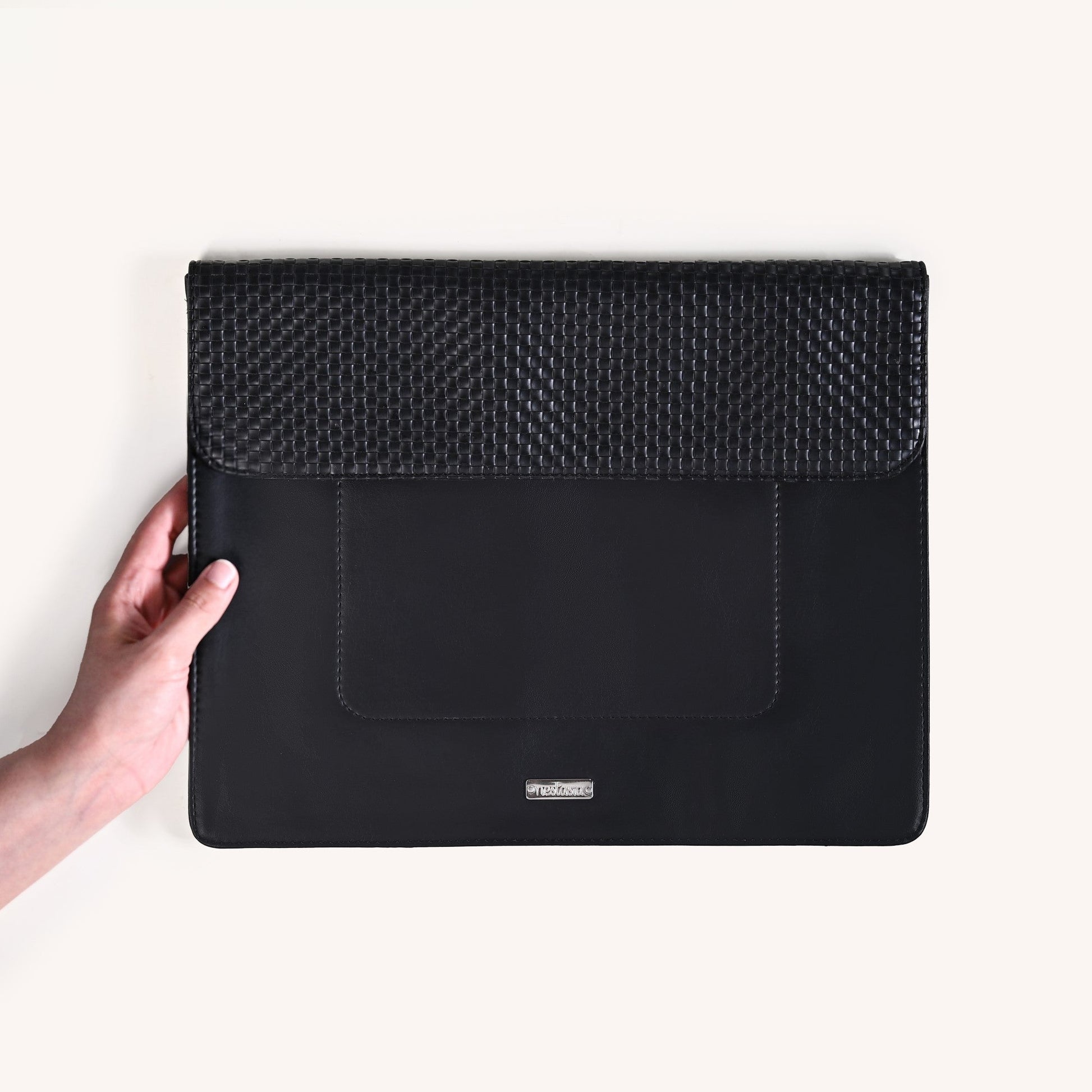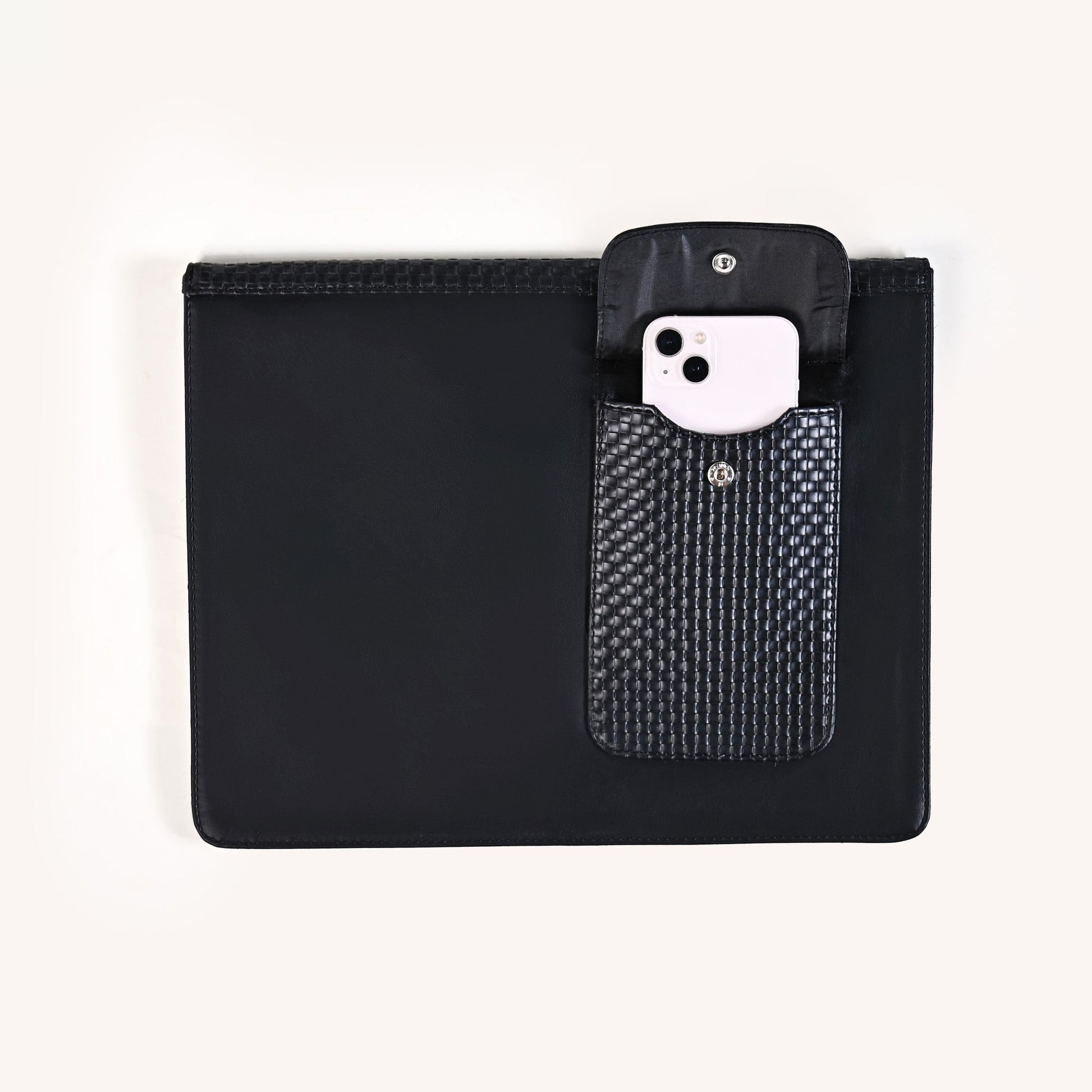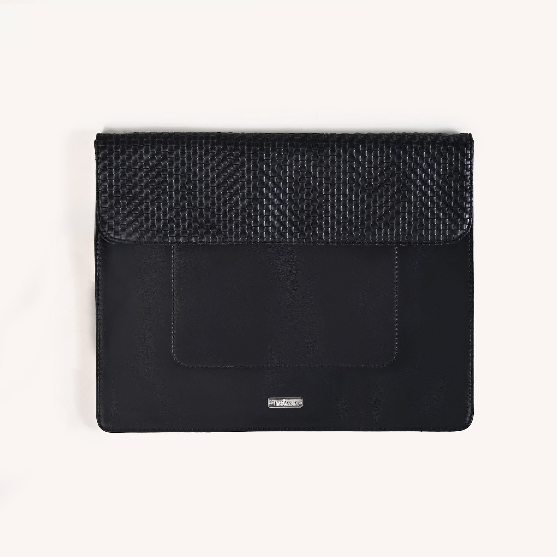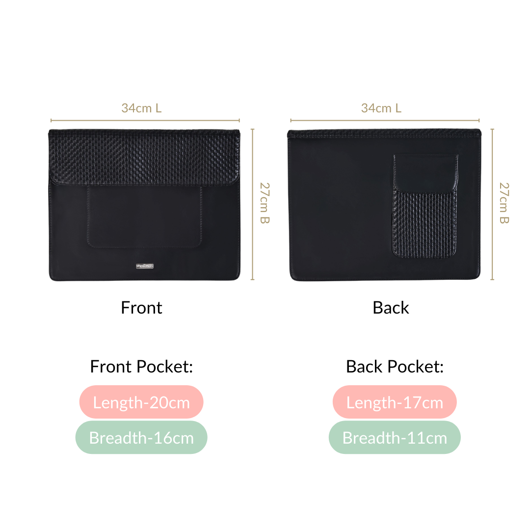 Design: The folder features a sophisticated basket weave design on the back pocket and flap, with a front slim pocket that’s zippered for added security. The back pocket is equipped with a push button for easy closure, while the flap has 2 convenient metal magnet buttons for a secure yet stylish fastening.