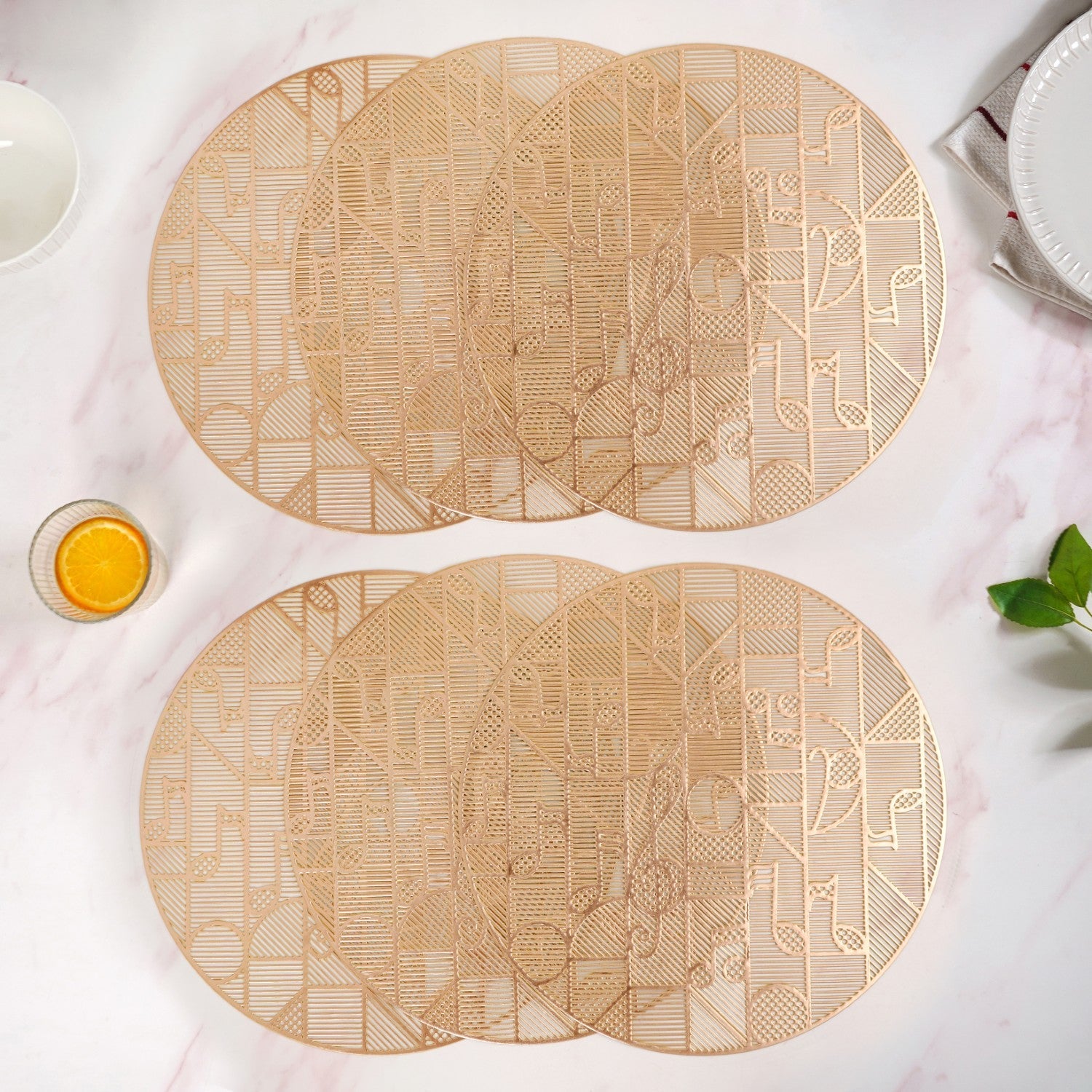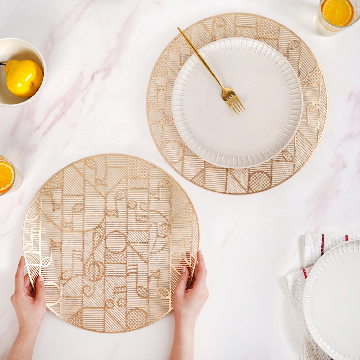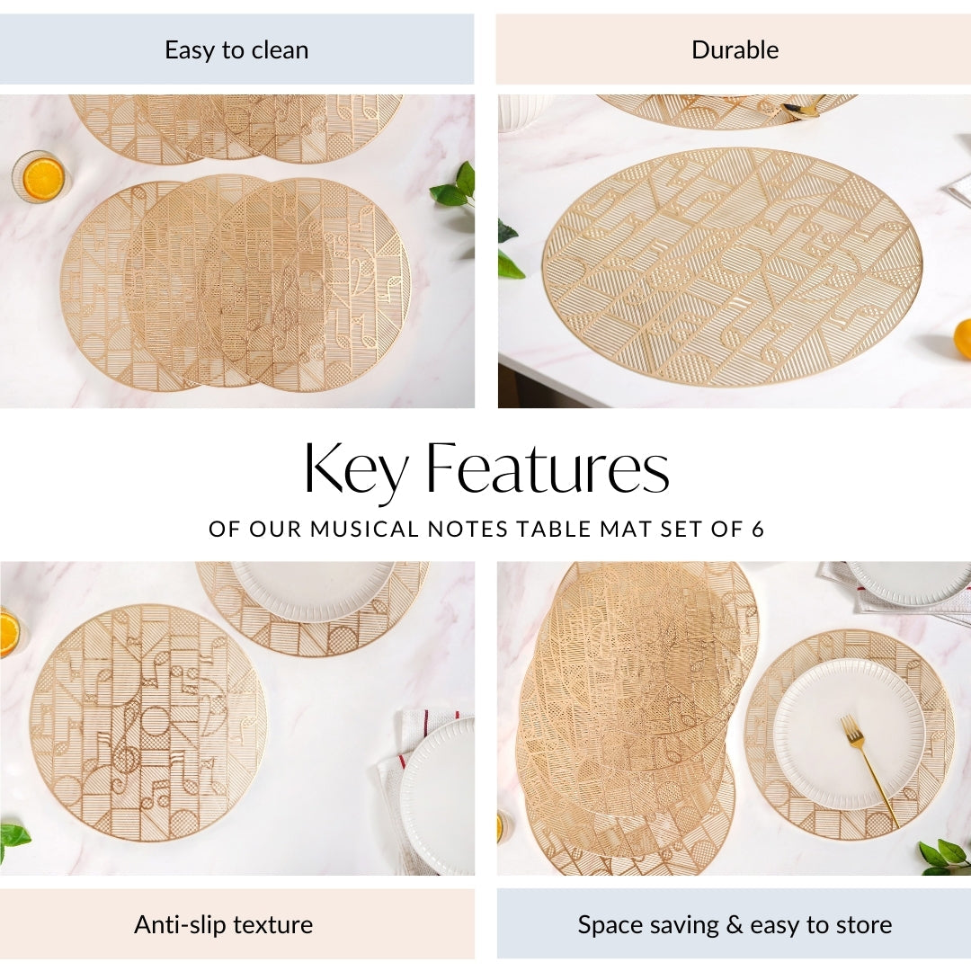 Design: These are a set of six sophisticated mats with a modern design that draws inspiration from musical themes. The overall design of the mat set is sheer with musical symbols, blending seamlessly into a geometric grid pattern. Each mat section is divided with clean, straight lines, offering a sense of rhythm and balance, much like a sheet of music. The set is lightweight with an airy feel. The front side of the mat is shimmering gold, which adds a luxurious and sophisticated touch, whereas the back has a matte finish, making it easy to determine the correct side.