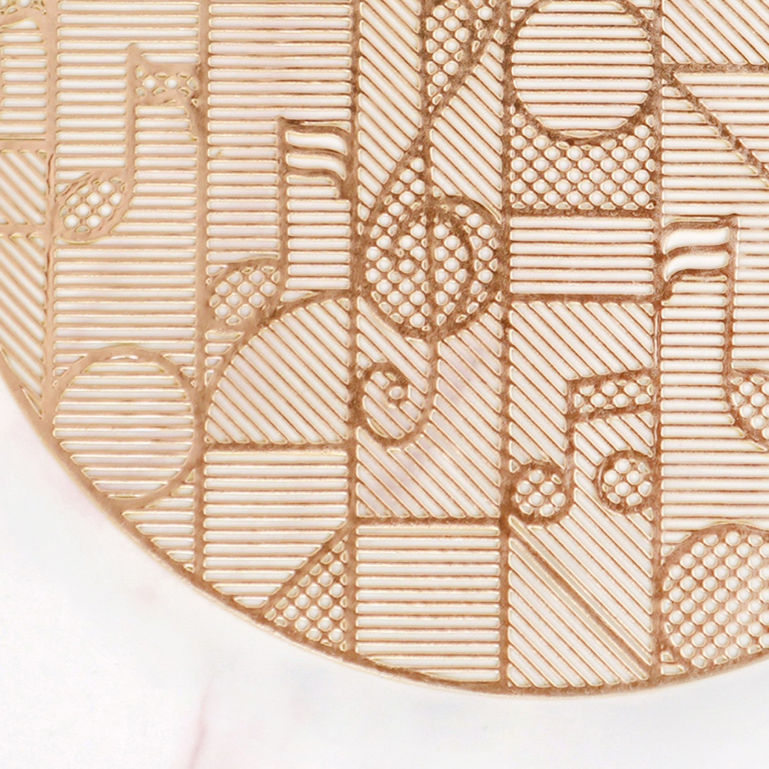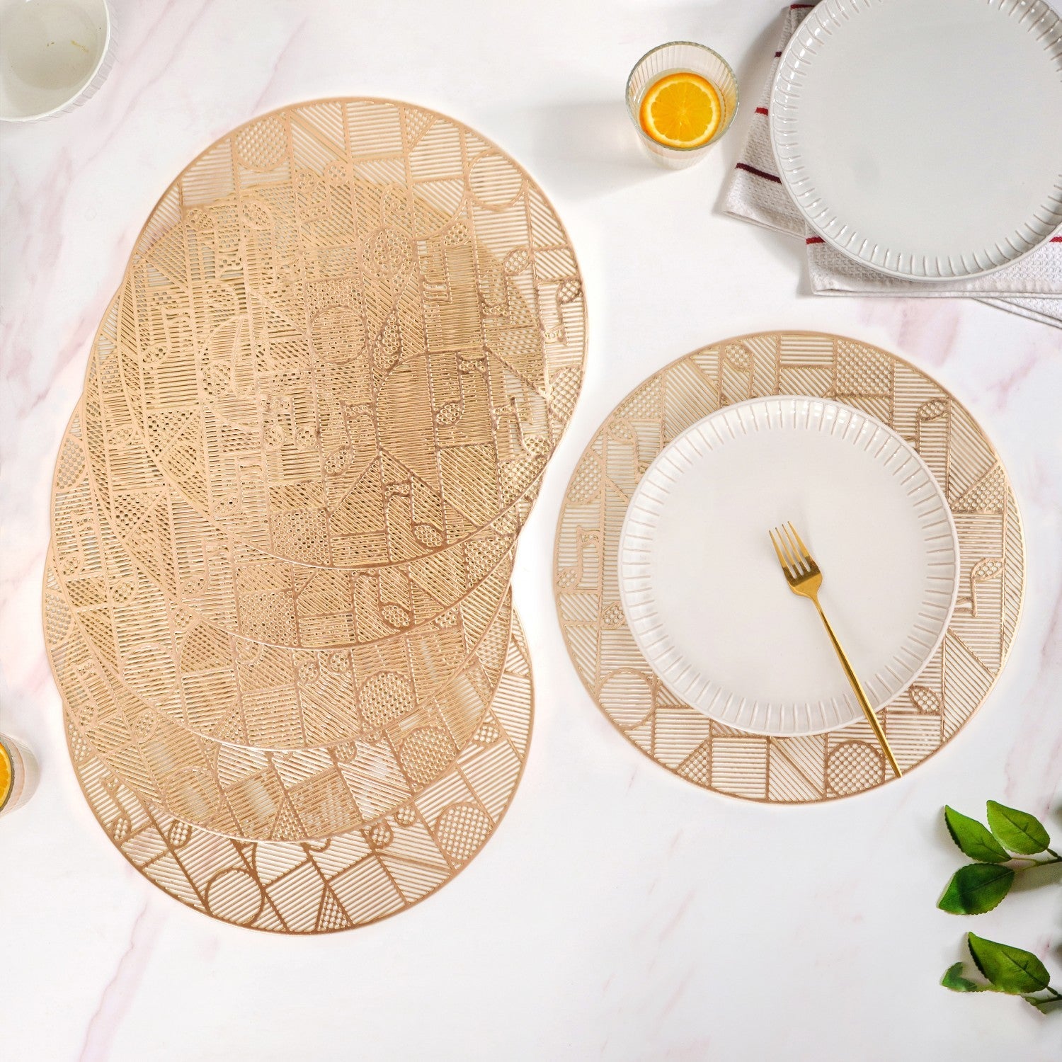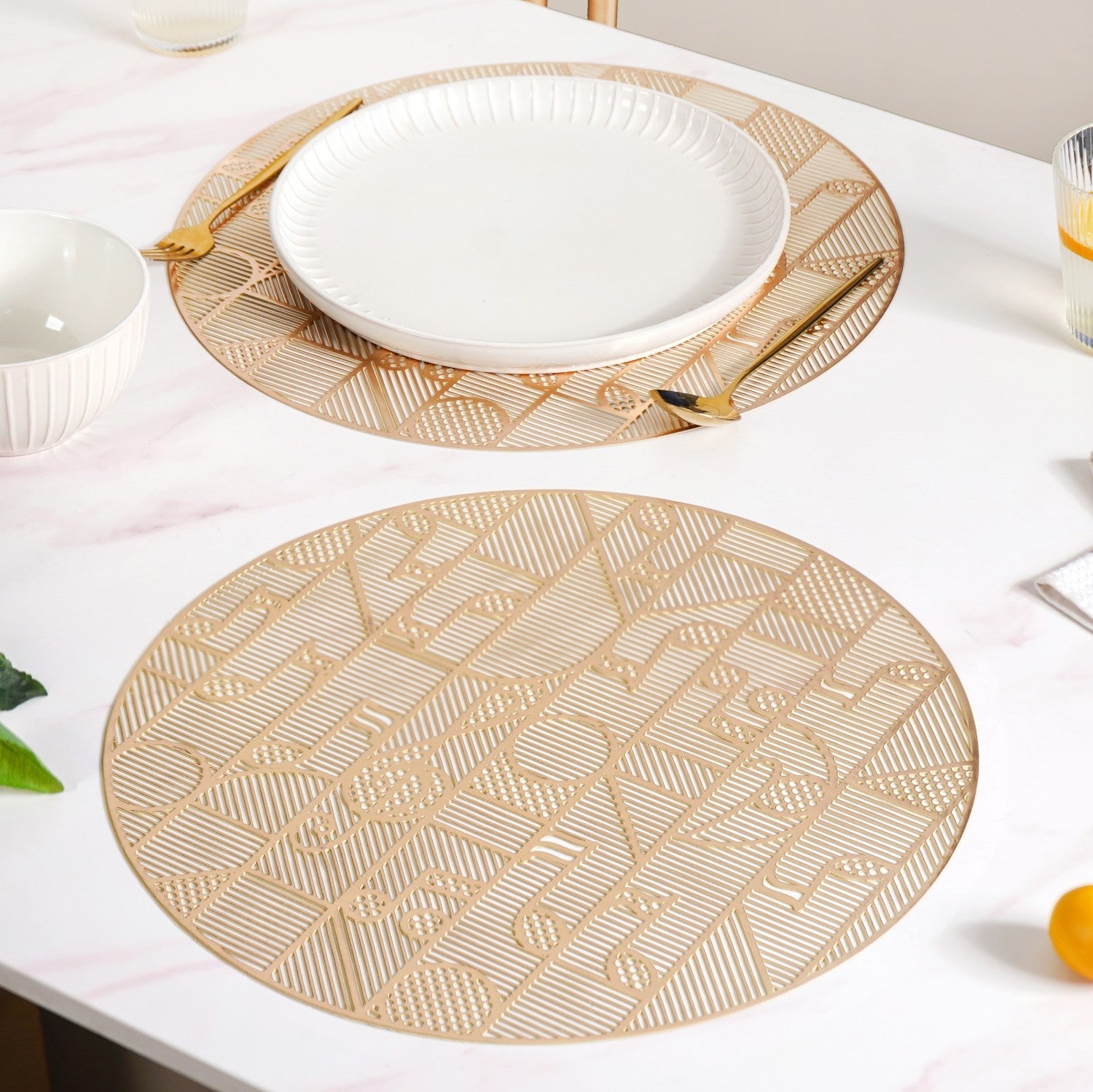 Design: These are a set of six sophisticated mats with a modern design that draws inspiration from musical themes. The overall design of the mat set is sheer with musical symbols, blending seamlessly into a geometric grid pattern. Each mat section is divided with clean, straight lines, offering a sense of rhythm and balance, much like a sheet of music. The set is lightweight with an airy feel. The front side of the mat is shimmering gold, which adds a luxurious and sophisticated touch, whereas the back has a matte finish, making it easy to determine the correct side.