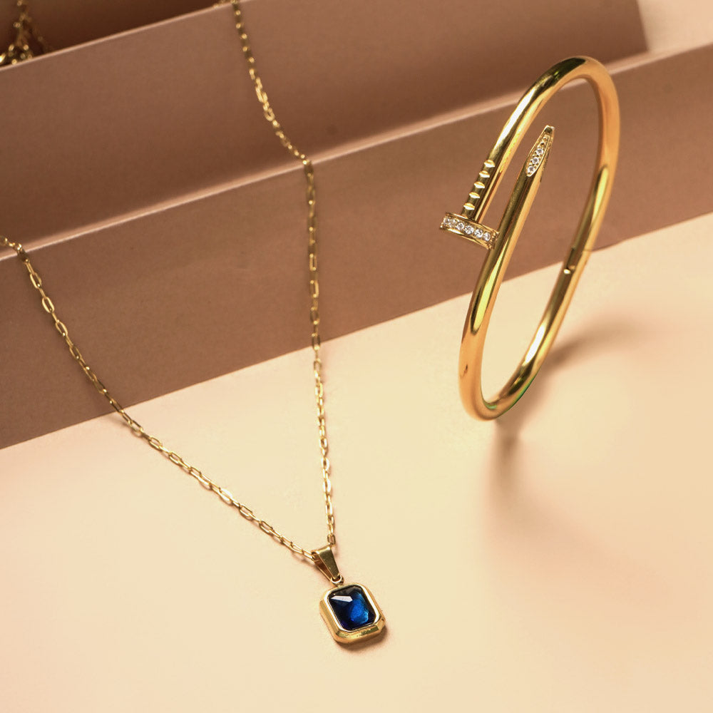 Nail Bangle Bracelet & Everyday Exquisite Blue Stone Gold Necklace Combo Set
