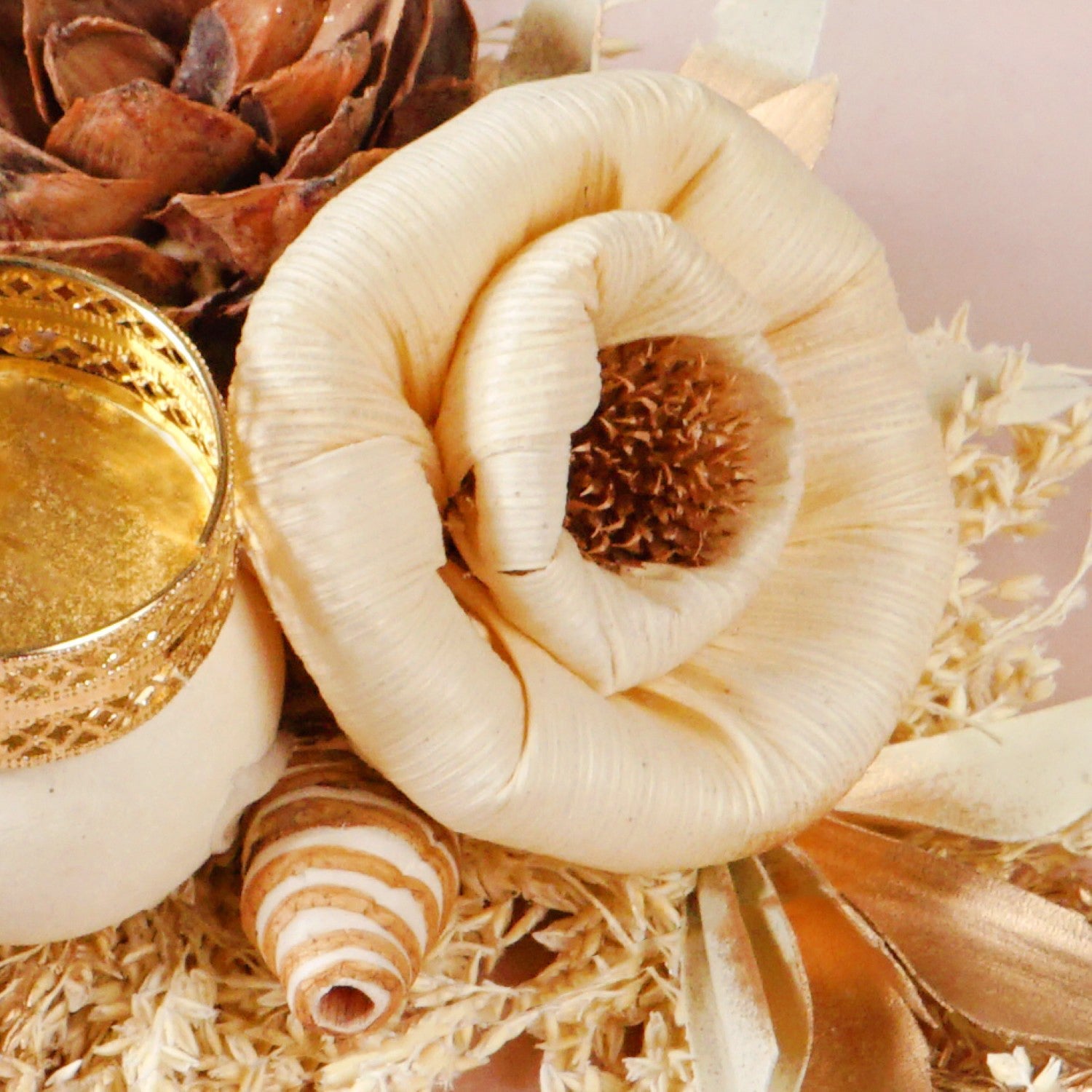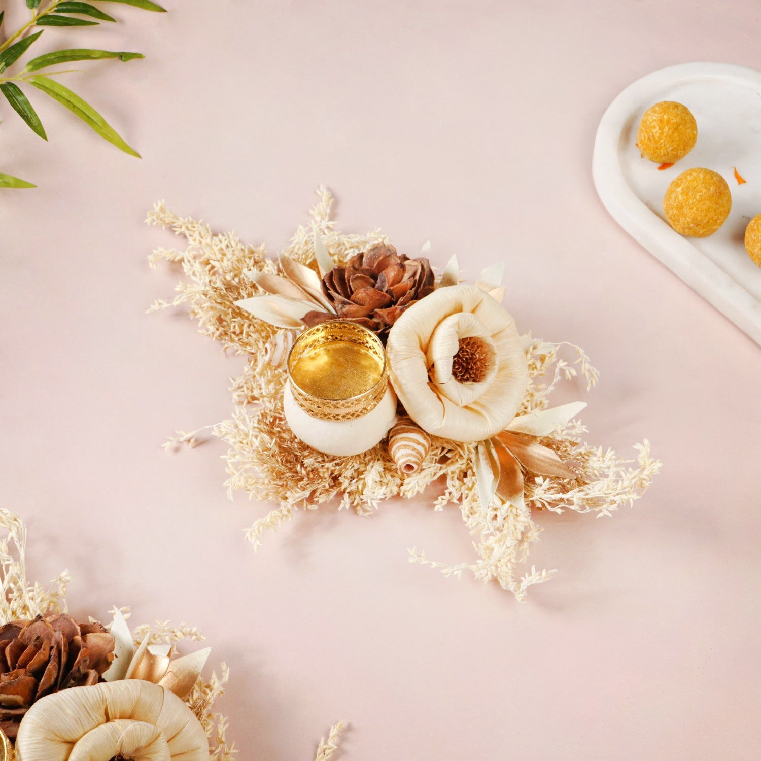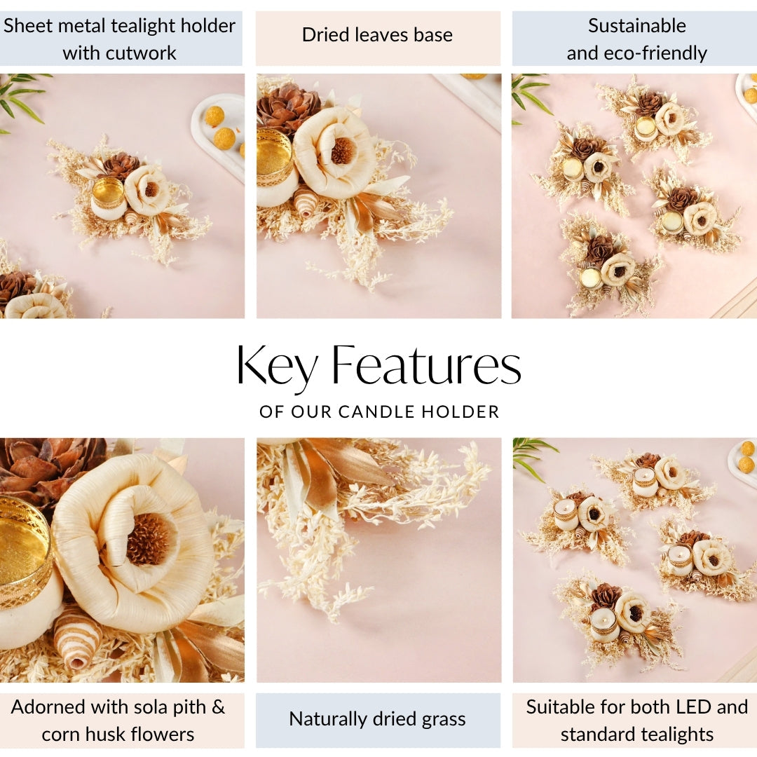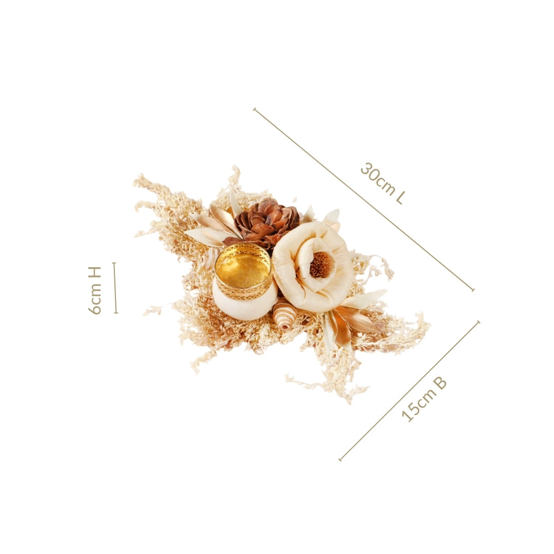 Design: The design showcases a rich, earthy brown sola pith flower as its focal point, offering a grounding and sophisticated appeal. It is artfully paired with a delicate, creamy off-white flower made of corn husk, providing a gentle contrast that enhances its natural beauty. These handcrafted flowers are gracefully arranged upon a generous base of naturally dried grasses and leaves, creating a textural and organic foundation. Subtle golden-hued dried leaves are thoughtfully interspersed, adding a hint of warm luminosity. Small dried seed pods or similar natural accents further enrich the nature-inspired feel. Integrated seamlessly into this botanical display is an intricately designed gold-colored sheet metal tealight holder.