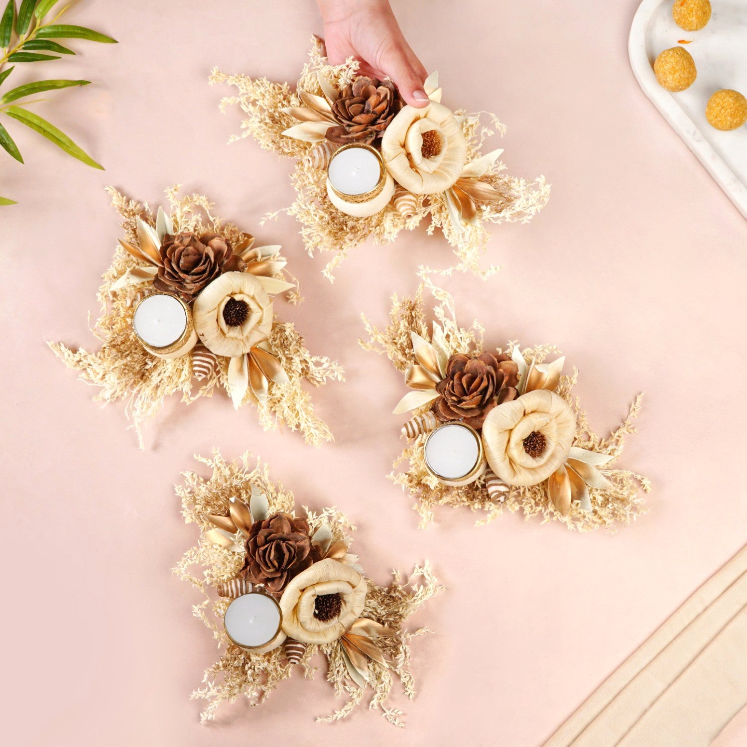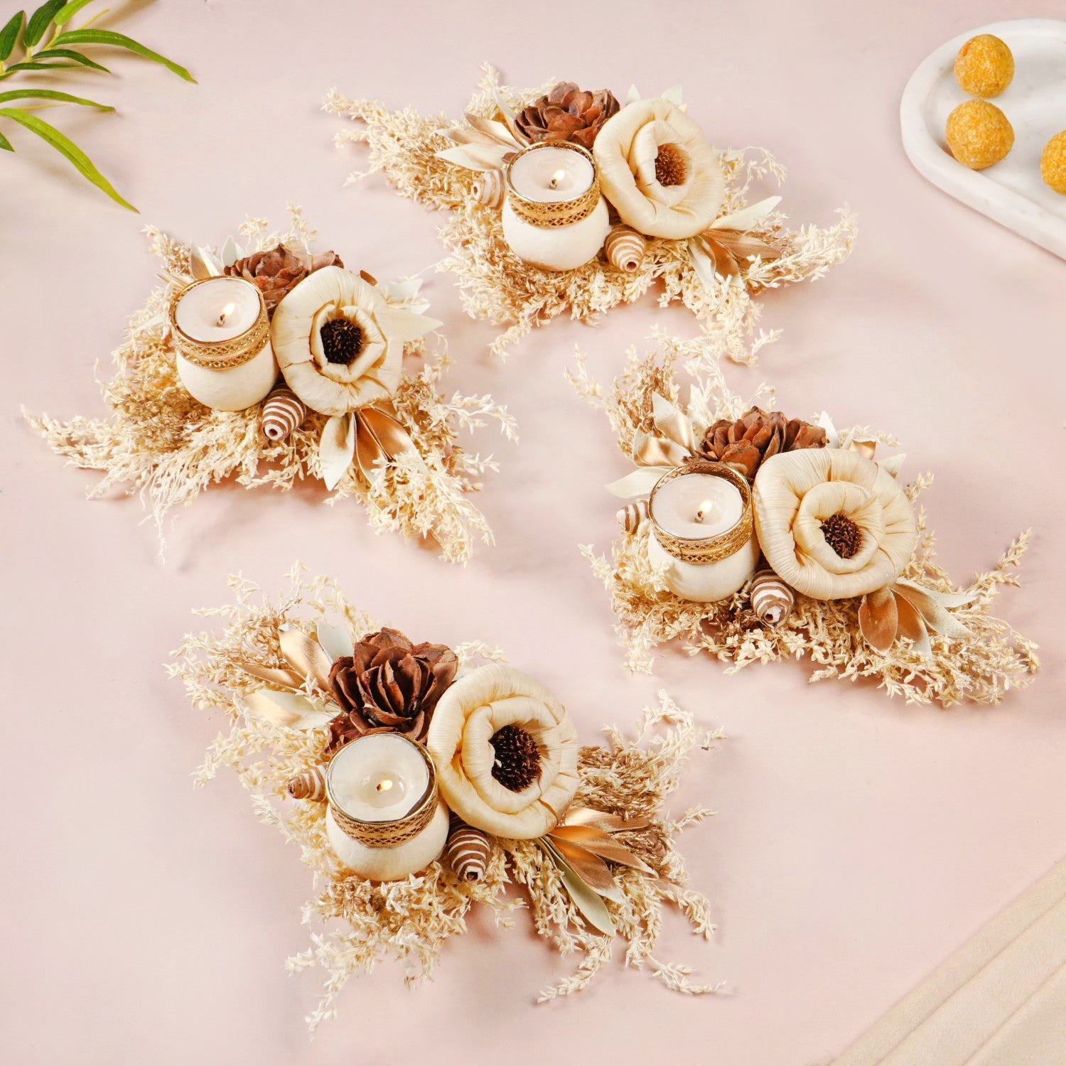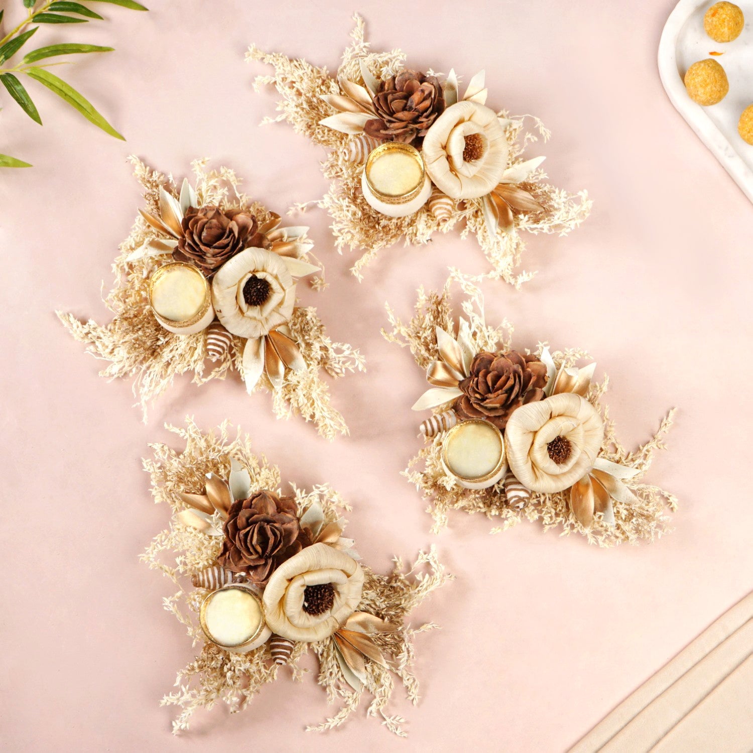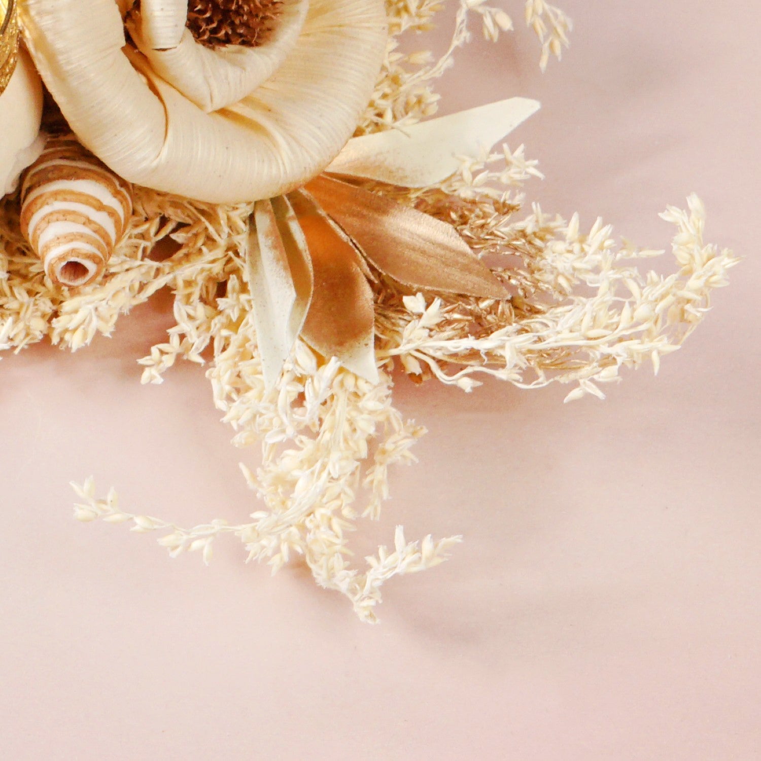 Design: The design showcases a rich, earthy brown sola pith flower as its focal point, offering a grounding and sophisticated appeal. It is artfully paired with a delicate, creamy off-white flower made of corn husk, providing a gentle contrast that enhances its natural beauty. These handcrafted flowers are gracefully arranged upon a generous base of naturally dried grasses and leaves, creating a textural and organic foundation. Subtle golden-hued dried leaves are thoughtfully interspersed, adding a hint of warm luminosity. Small dried seed pods or similar natural accents further enrich the nature-inspired feel. Integrated seamlessly into this botanical display is an intricately designed gold-colored sheet metal tealight holder.