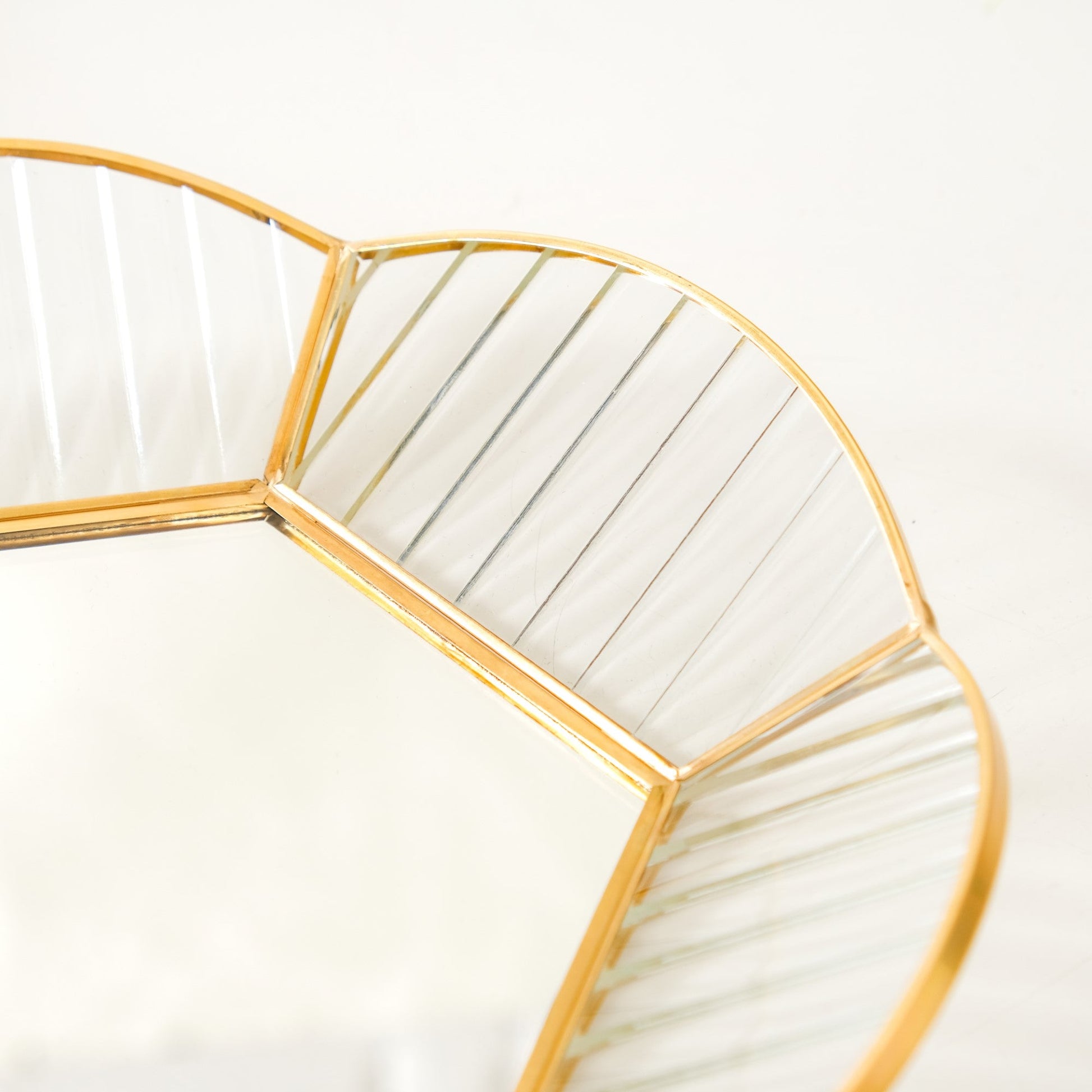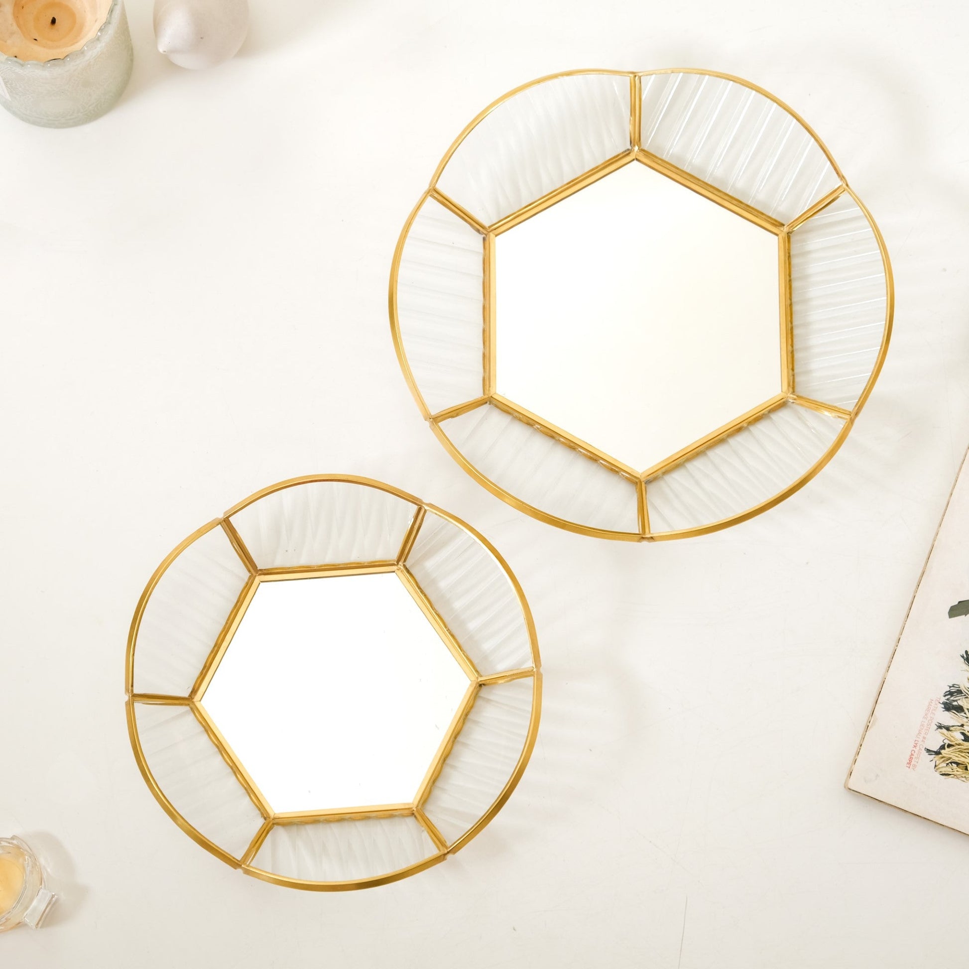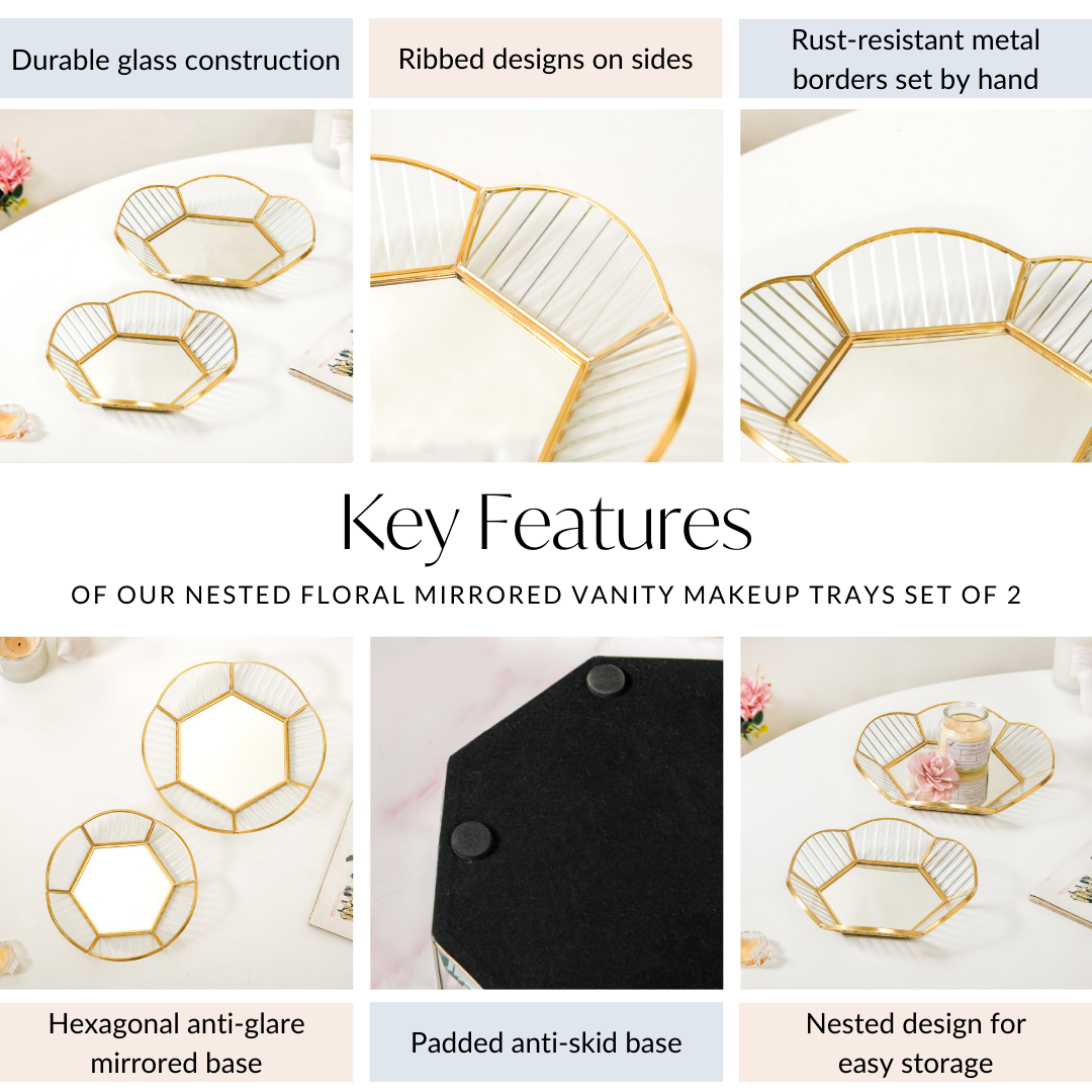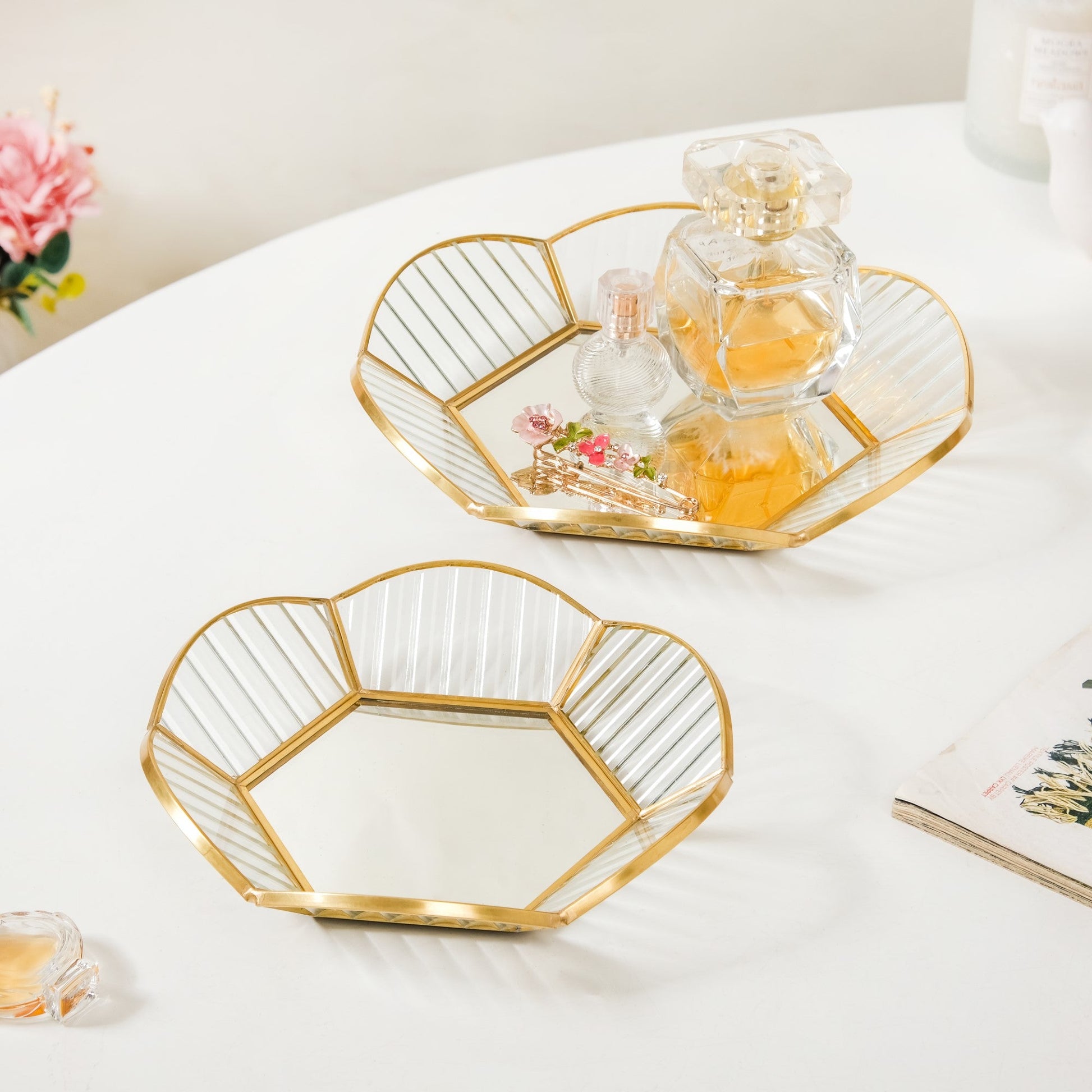 Design: Fashioned from premium-quality tempered glass and complemented by golden rust-resistant metal borders, the set of 2 flower-shaped decorative trays is the perfect choice for you. Shaped as a flower with fluted sides that take the appearance of petals and furnished with a hexagonal anti-glare mirrored base, these vanity trays are ideal for infusing your space with style and sophistication. Finally, the anti-skid foam padding at the base provides extra protection and prevents damage to the precious trinket trays.