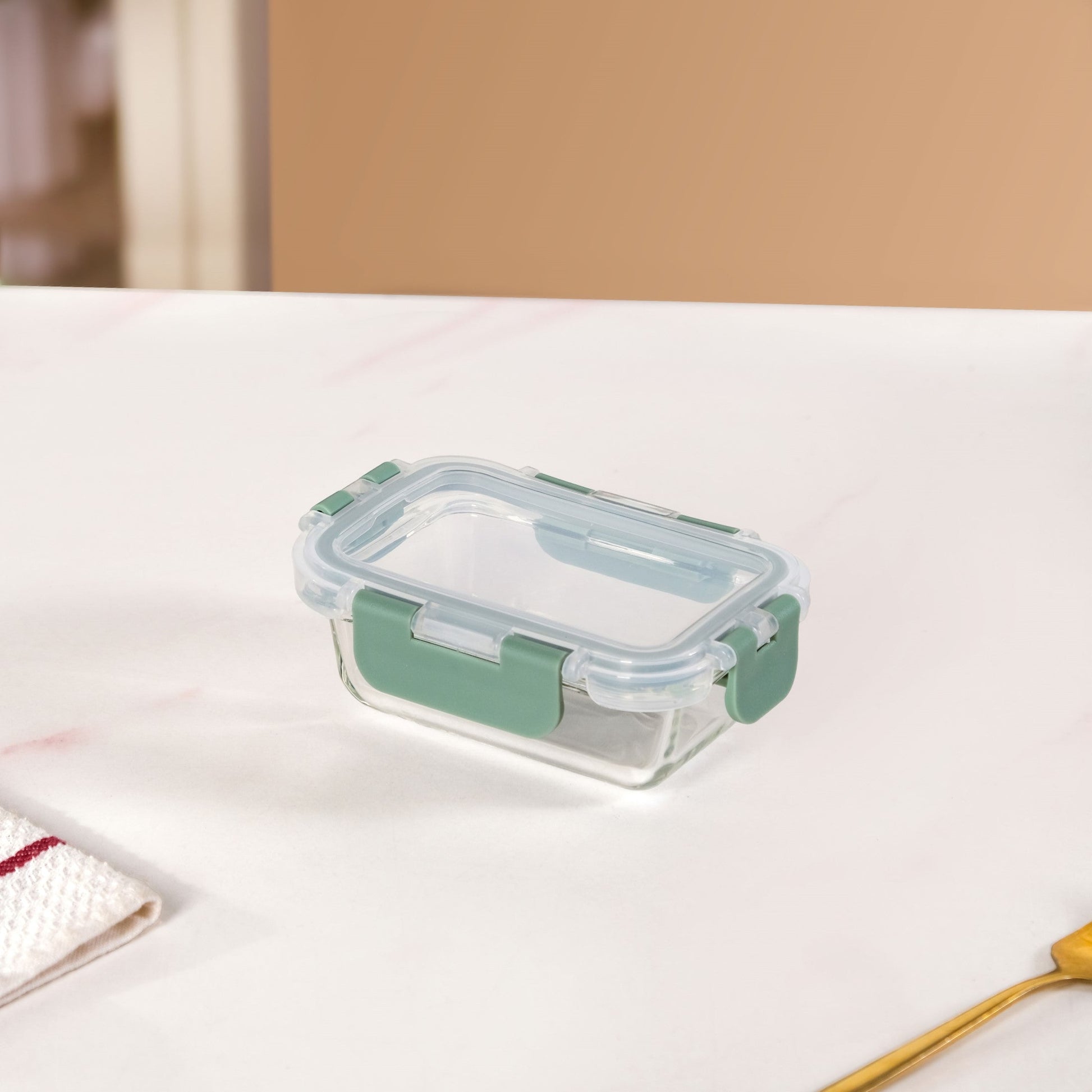 Design: The design of our glass lunchbox is a testament to modern simplicity and practical elegance. It features a clear borosilicate glass body and a transparent PP lid with subtle sage green clips. The lid is fitted with a 4-clip locking mechanism that not only ensures a secure fit but also adds to the sleek aesthetic.