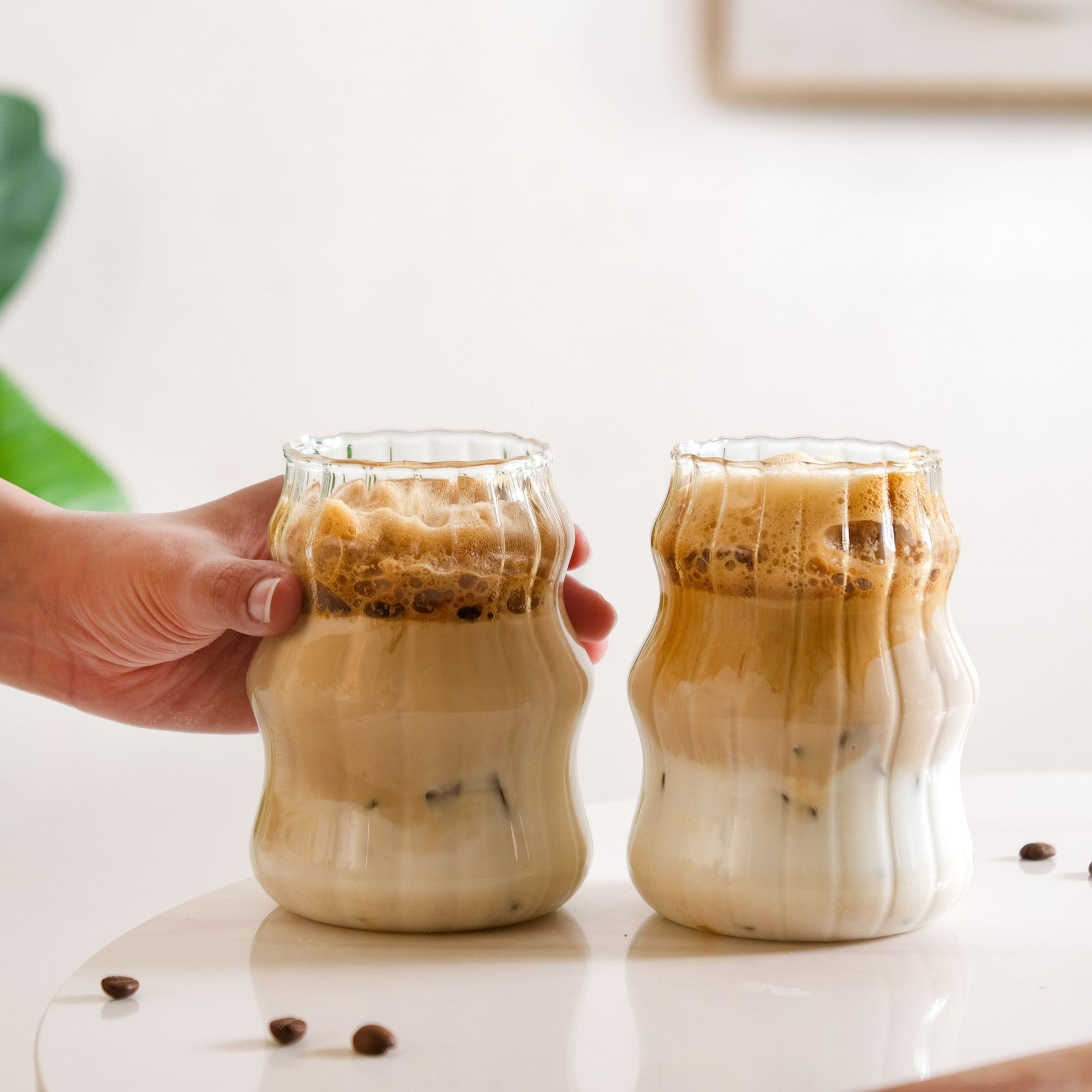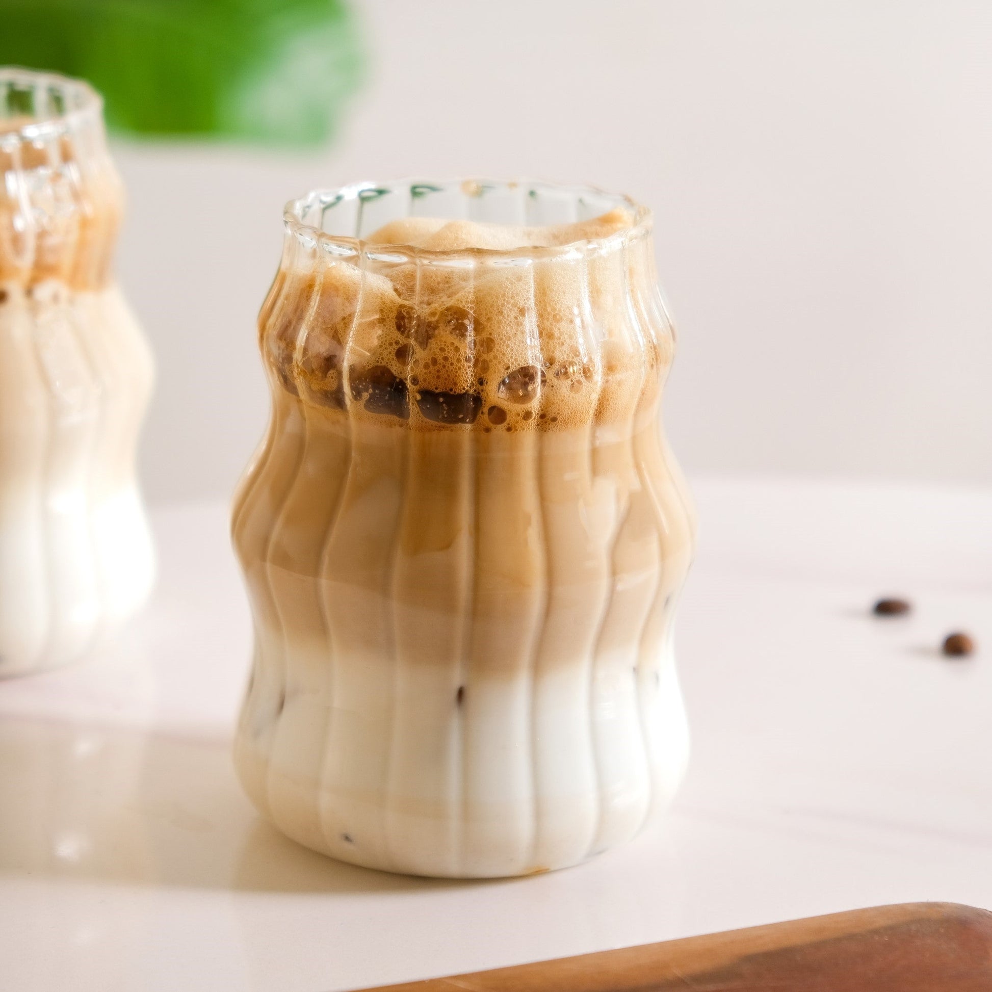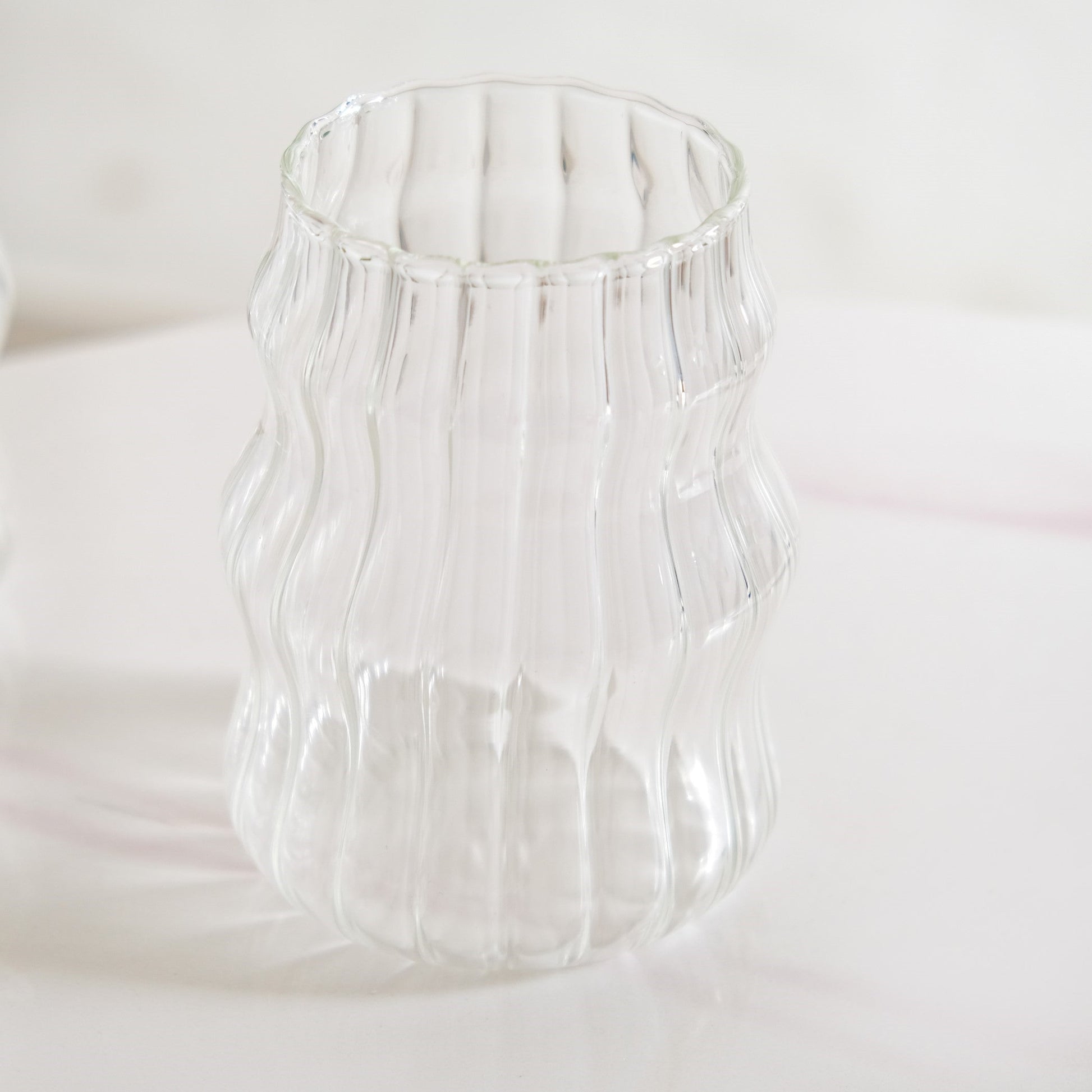 Design: Each tumbler is hand-blown using high borosilicate glass, crafted to showcase a sleek wavy rim and a curvy outer silhouette. The inner ribbed texture enhances grip while adding visual flair. A flat base ensures stable placement on any surface. The transparency of the glass highlights every drink’s hue. The elegant shape adds a sculptural touch to everyday sips.