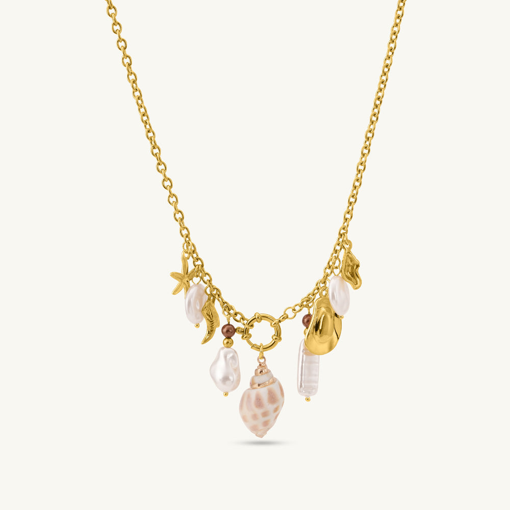 The Ocean Whispers Charm Necklace celebrates the beauty of the sea with a collection of shell, pearl, and starfish-inspired charms. Crafted on a golden chain, each charm tells a story of coastal elegance, bringing beachside allure into everyday fashion. Perfect for women who love playful yet sophisticated jewellery, it balances whimsy and elegance with ease. Lightweight and radiant, this necklace is ideal for summer styling, vacations, or adding ocean-inspired charm to any look.