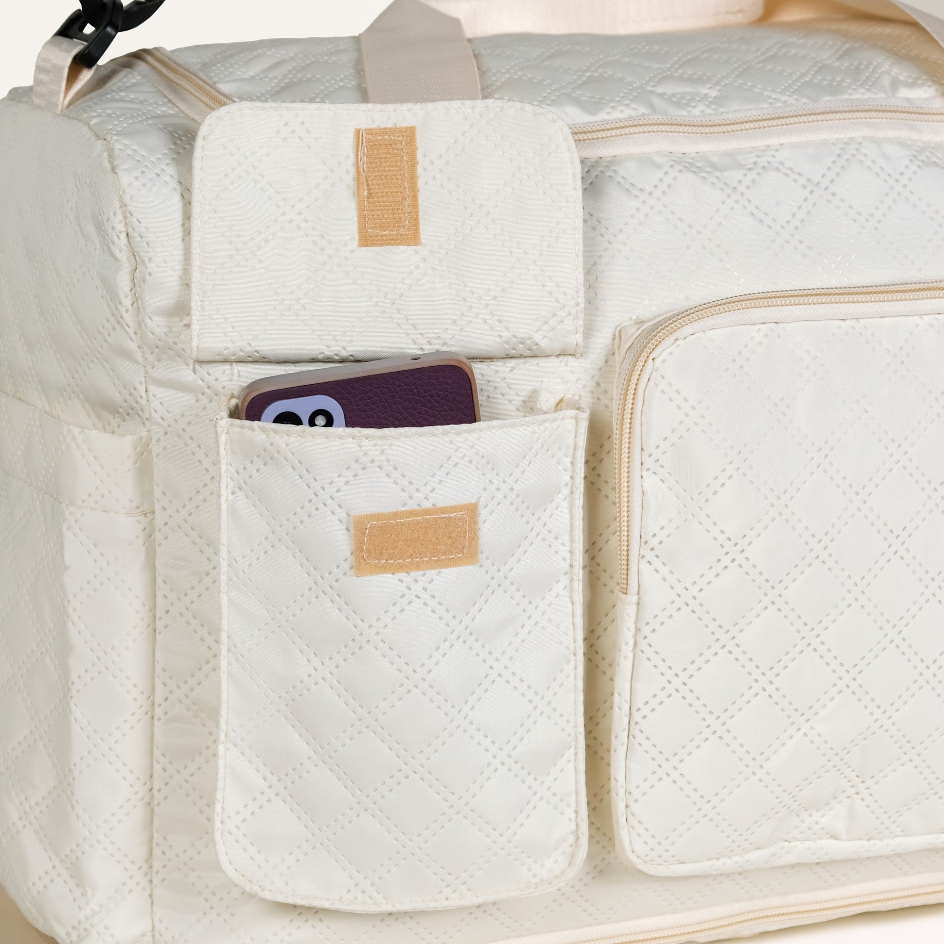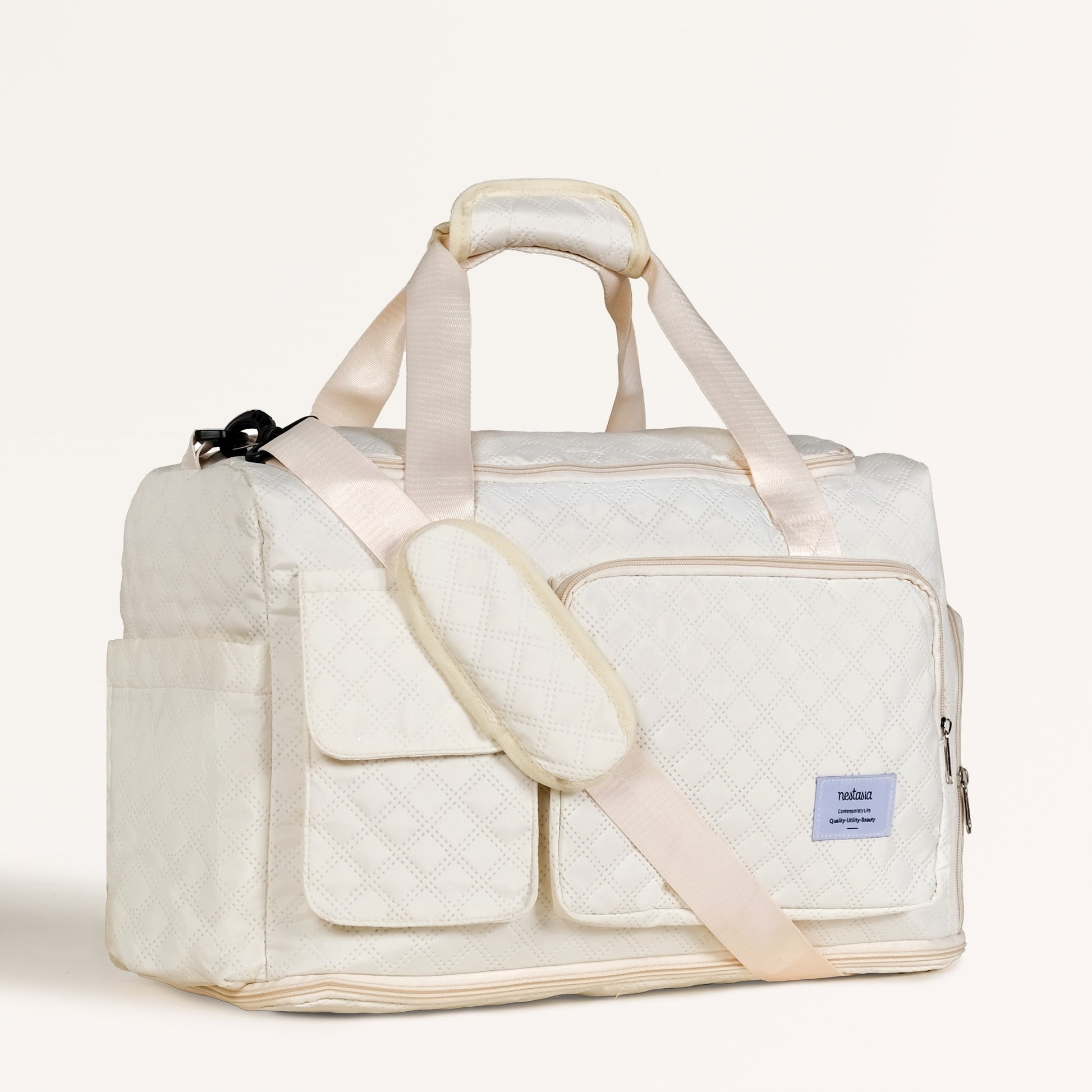 Design: Simplicity meets sophistication with the Dova duffle bag. Made from high-density nylon, the gym bag features a chic off-white exterior adorned with an embossed geometric pattern, adding depth without overpowering its clean aesthetic. The sleek silver hardware detailing adds a touch of luxury while the water-resistant lining ensures your belongings stay protected. The thoughtful layout includes a spacious main compartment, a dedicated exterior shoe pocket, and a mix of velcroed and zippered side pockets for flexible storage. With two sturdy handles and an adjustable, padded shoulder strap, this bag offers comfort, whether you’re carrying it to the gym or through the airport.