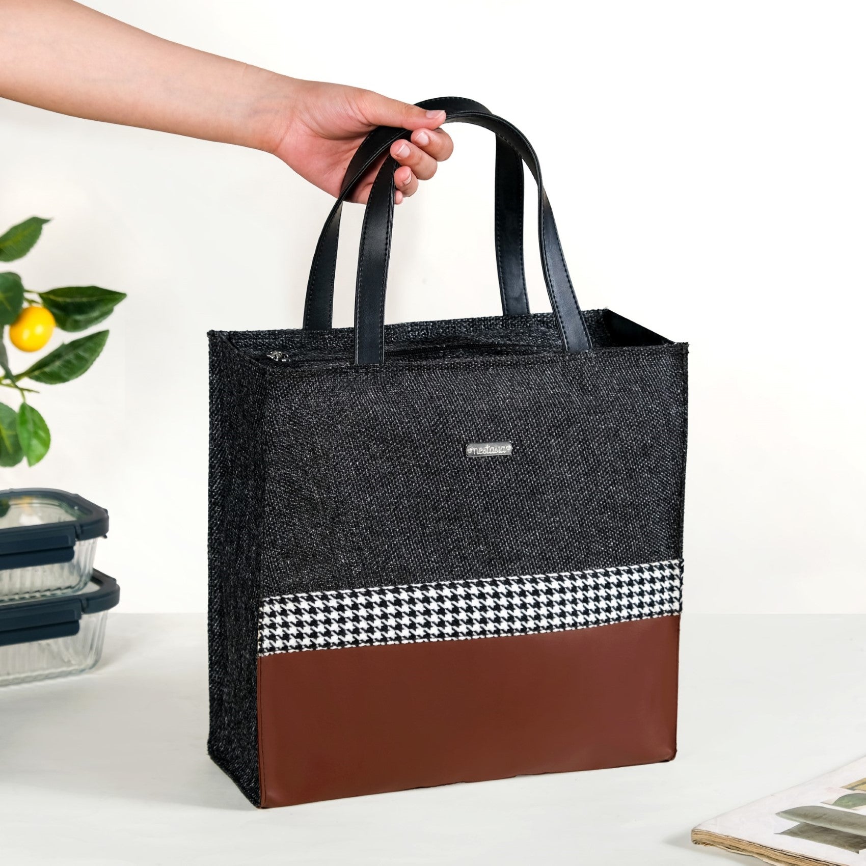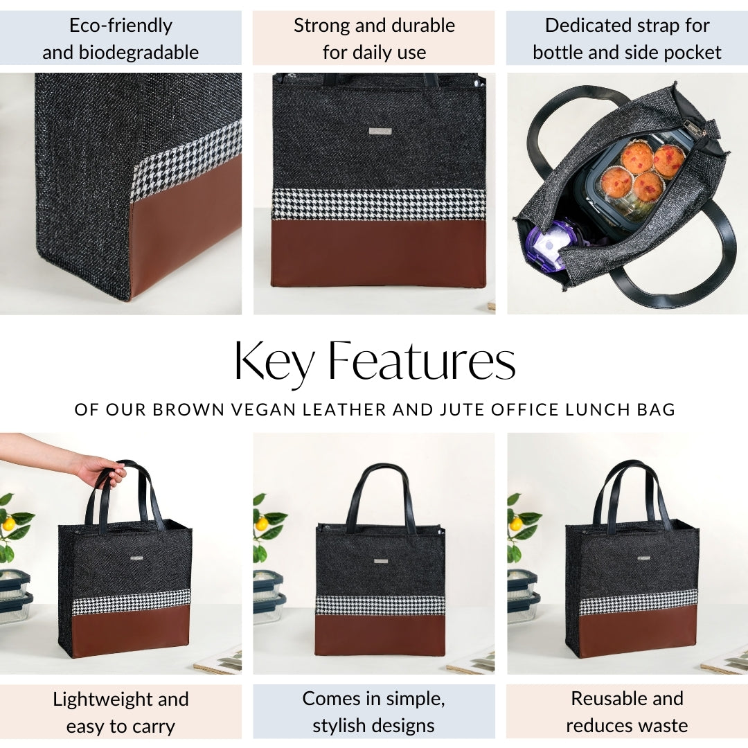 Design: Crafted from sustainable jute, this office-ready lunch bag features a clean, earthy design that fits seamlessly into your daily routine. The outer body is durable yet lightweight, with two sturdy handles on top for easy carrying and a smooth zipper closure that keeps everything secure. The simple, natural finish with a houndstooth strap in the middle gives it a minimalist look, making it one of those cute lunch bags you’ll want to carry. The spacious main compartment offers approximately 12 litres of capacity, perfect for fitting standard lunchboxes, bottles, and snacks without the bulk. It also includes a strap to keep your bottle from moving or spilling and a side pocket to store tissues, sauce packets, medicines, and more.