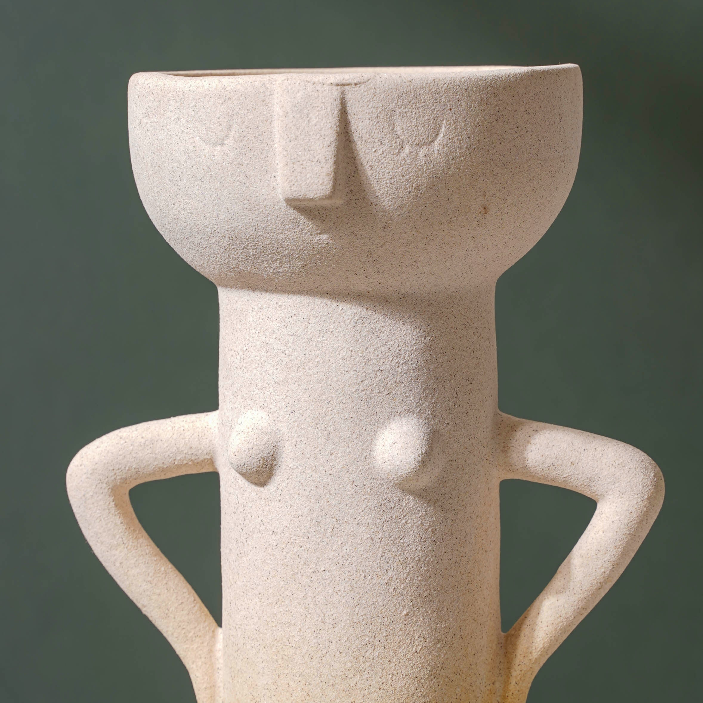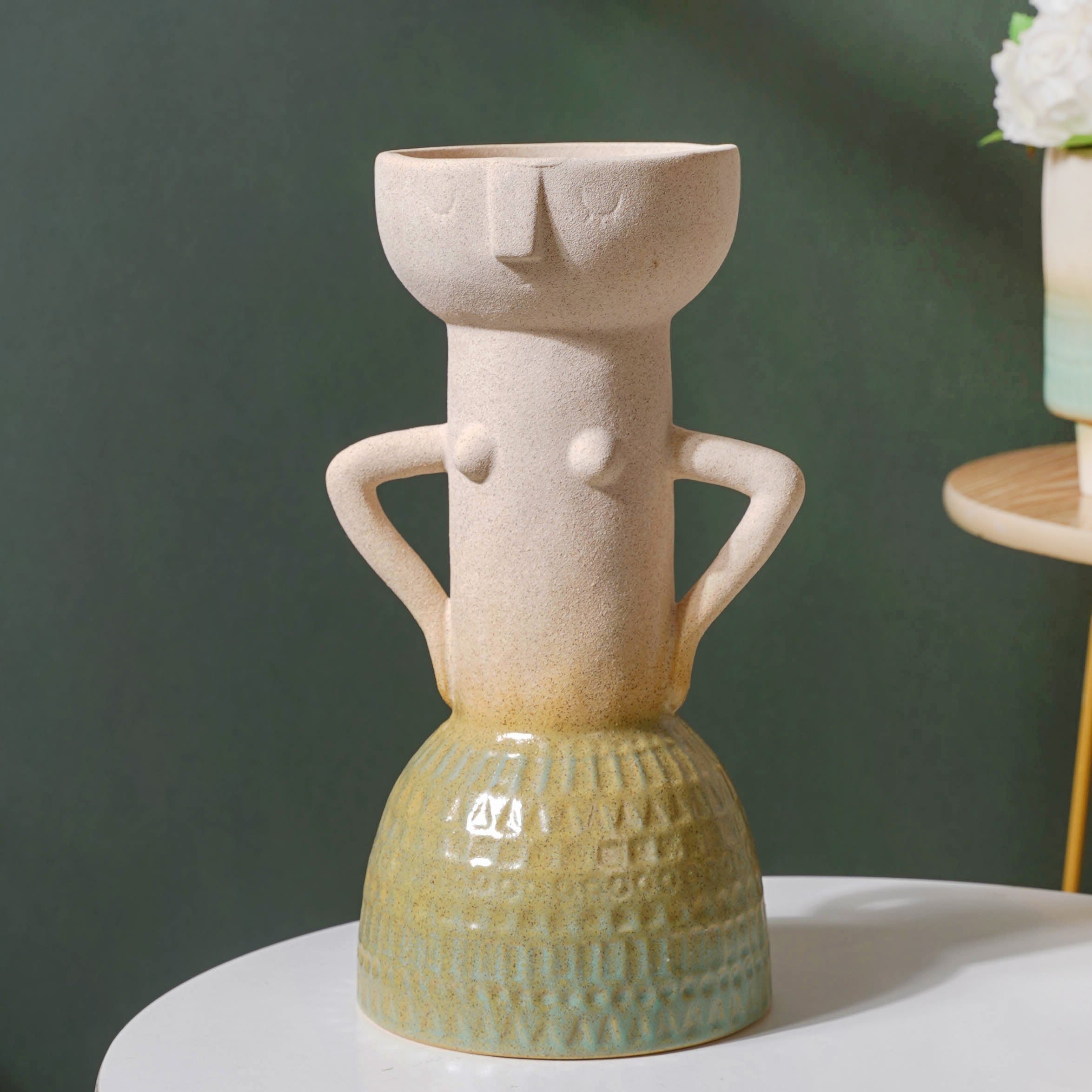The white earthen clay vase with a hint of sea green is a fantastic décor element for a living room with its unique and modern form. The unique vase, with its teacup shape at both ends, joined by a linear pipe can be used to showcase fresh flowers or to hold artificial stems. When not in use, the vase can be used as a decorative element on a side table or dressing table.