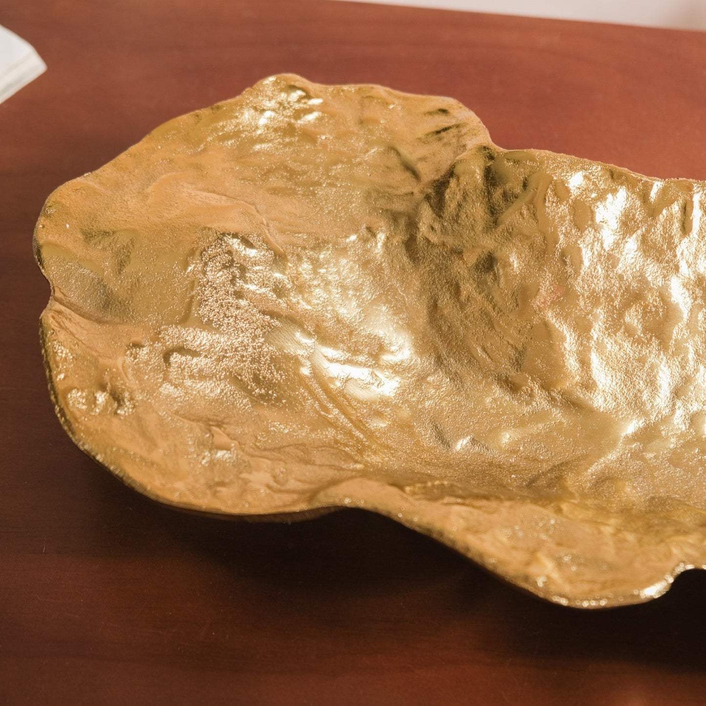 Add an opulent touch to your home decor with our exquisite metal decorative tray, crafted from rust-resistant aluminium with a stunning high-sheen metallic gold hue. Its unique abstract crumpled paper shape design adds a contemporary flair, while the antique stone finish on the metal exudes timeless elegance. Perfectly balanced on sturdy and stable stands, this trinket tray is both a functional and stylish centrepiece. Ideal for displaying decorative items, it seamlessly blends modern artistry with classic charm, making it a standout addition to any setting. Elevate your space with this versatile and eye-catching piece.