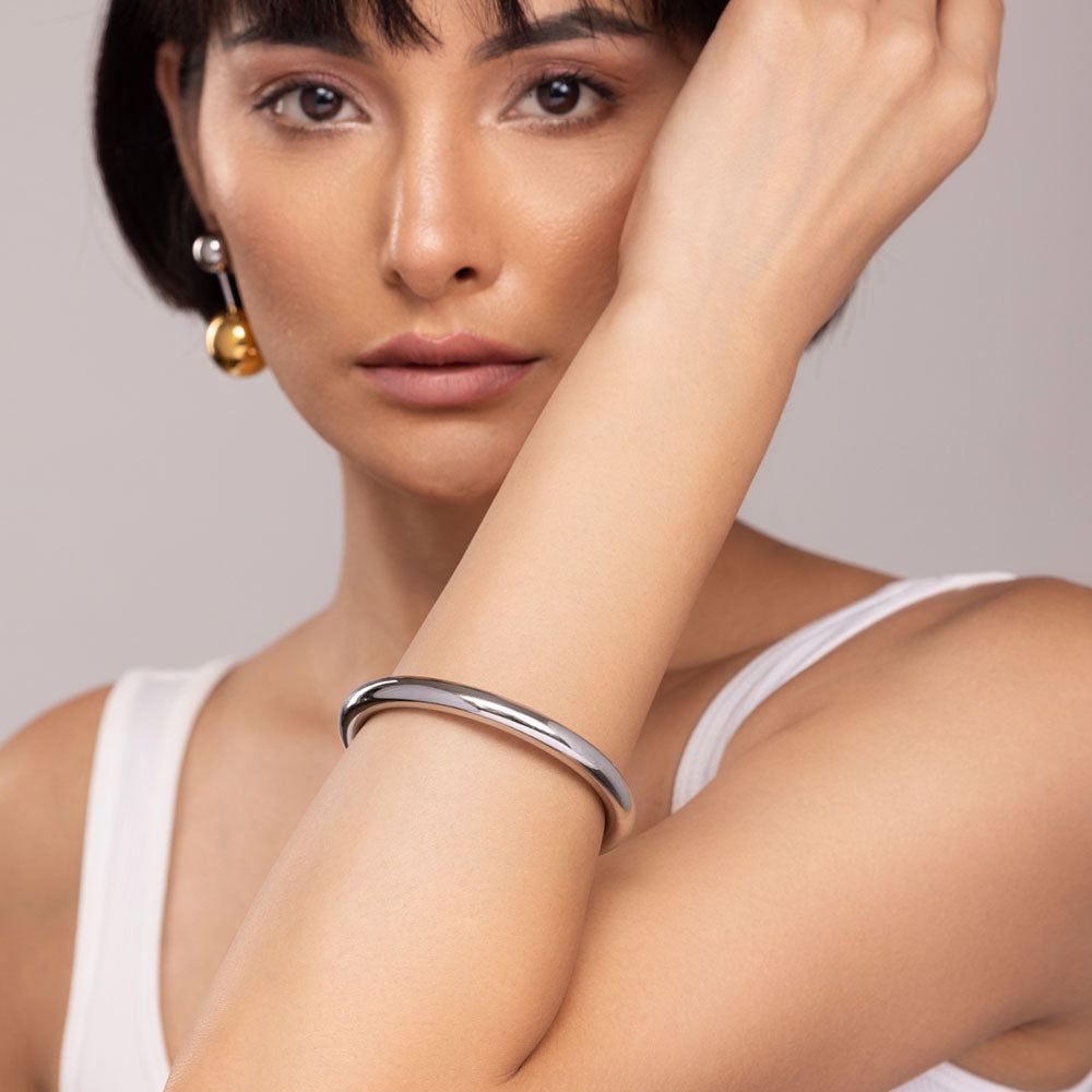 The spherical shape of this bangle bracelet is reminiscent of a planet’s orbit. It shines bright like the moonlight and is crafted to perfection for everyday use. The silvery touch complements any attire and wraps around your wrist like the moon’s orbit.