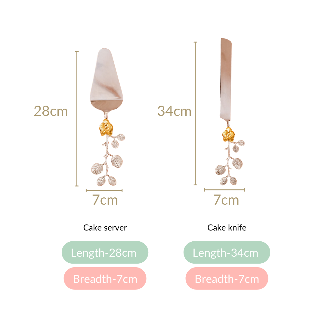 Enhance your food styling game with our stunning cake knife and server set. Designed from premium 304-grade stainless steel, they ensure durability and safety with their non-toxic, BPA-free construction. Designed for international food-grade quality standards, they boast a luxurious high-sheen metallic finish. The handles are adorned with intricate leaf, thorn, and rose bloom motifs, exuding elegance and charm. Adding a touch of opulence, the rose blooms feature a PVD-coated gold finish. Perfect for weddings, birthdays, or any special occasion, this cutlery set combines beauty and functionality, making it a must-have for every dessert connoisseur's collection. The products come neatly packed in a gift box.