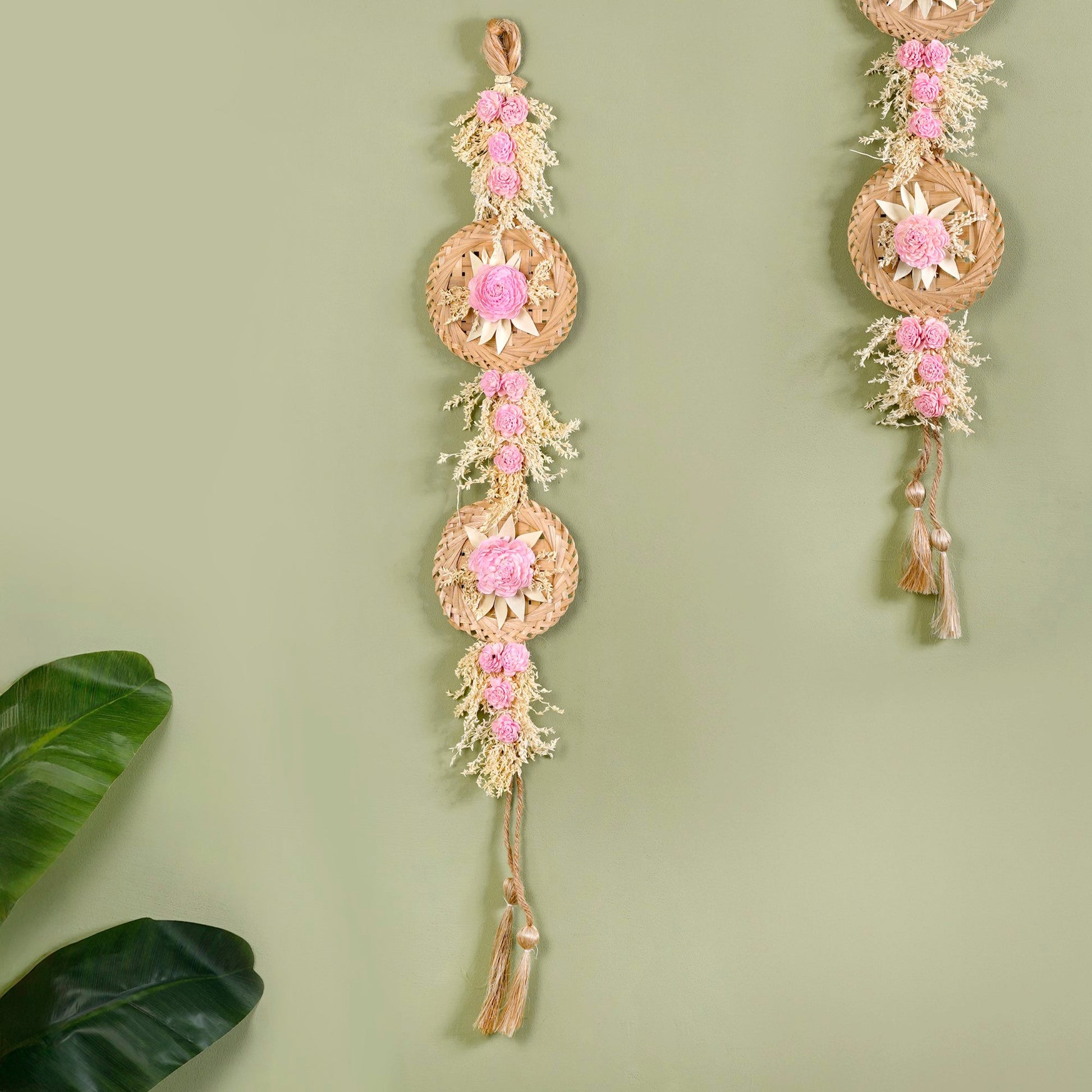 Design: The design features a series of circular woven jute bases, each showcasing a large, beautifully crafted pink sola flower surrounded by naturally dried leaves. These circular sections are connected by bunches of naturally dried grasses and smaller pink sola flowers, creating a flowing, cascading effect. The entire piece is made from 100% organic materials, making it a beautiful and sustainable home decor piece for any occasion. The set is finished with charming jute tassels at the end for an added touch of rustic elegance.