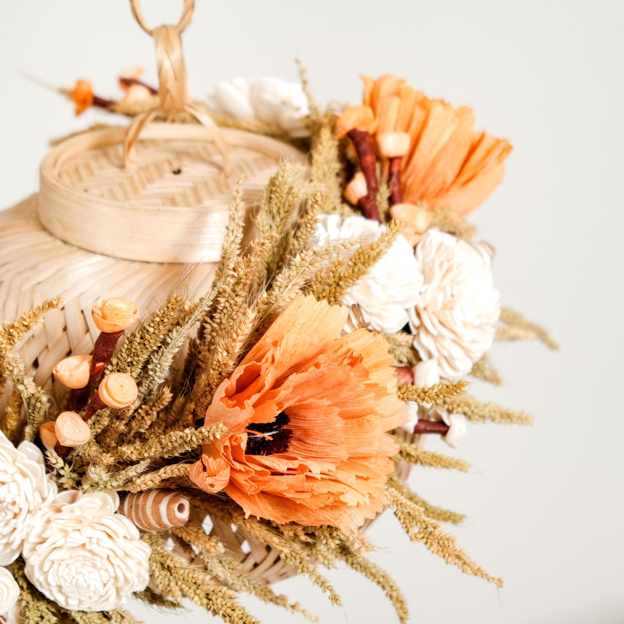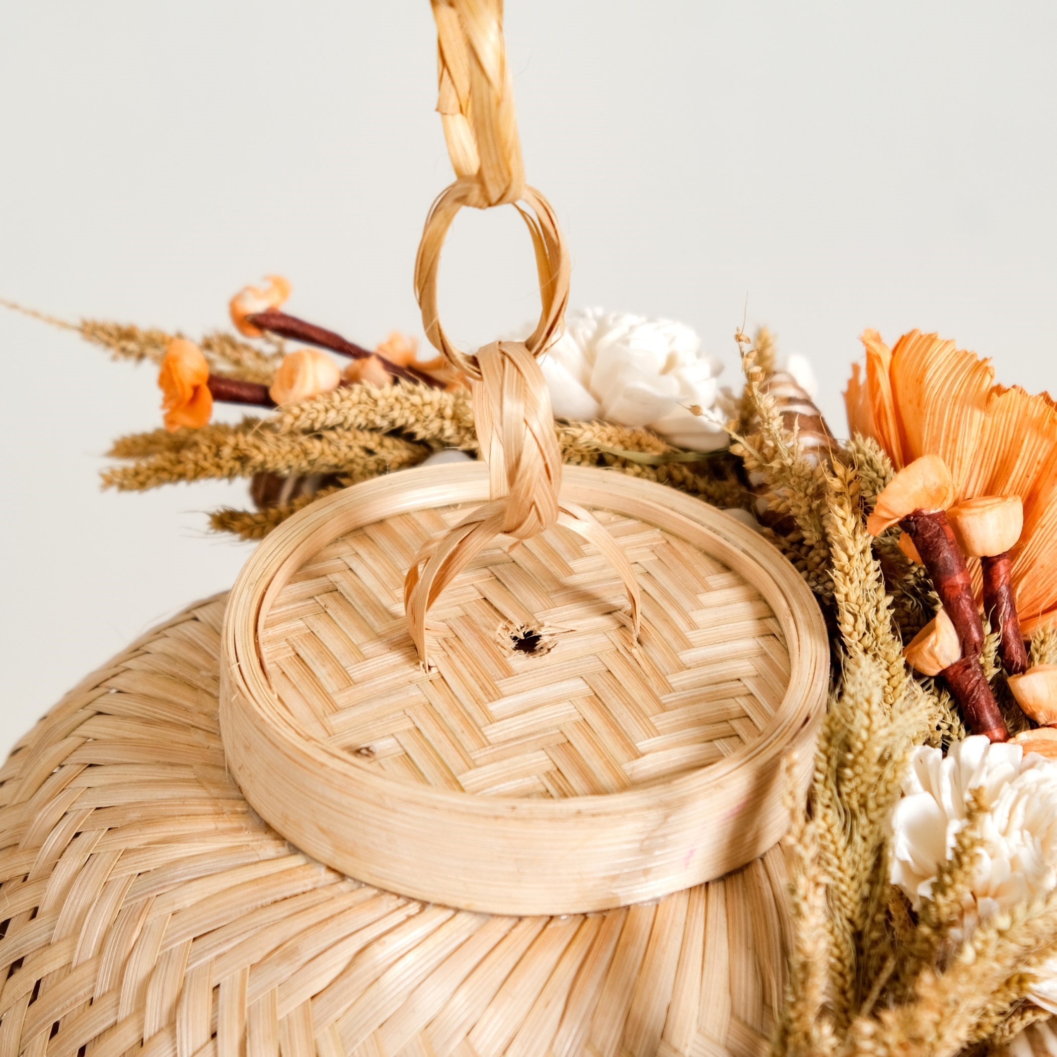 Design: This captivating lantern features a unique spherical form, expertly woven from natural bamboo in a warm, light brown hue. Its bamboo-made dome surface is richly adorned with a vibrant array of sola flowers, prominently showcasing a striking, large orange bloom alongside delicate, creamy white clusters. These botanical accents are beautifully nestled among fine, dried leaves and distinctive striped seed pods, adding intricate texture and organic charm. A strong, knotted bamboo loop at the top ensures easy hanging.